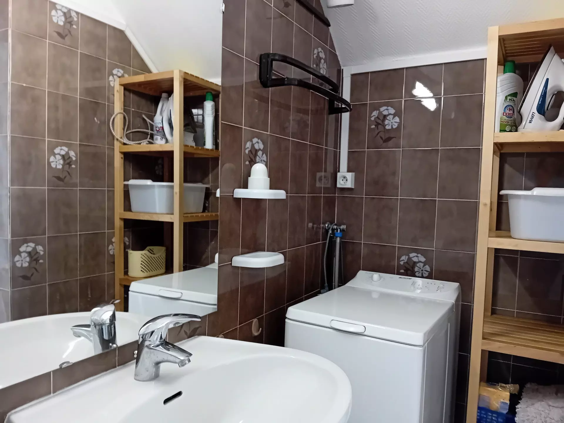 Bathroom (tiled): shower cubicle, washbasin, washing machine, 1 electric fan heater, WC.