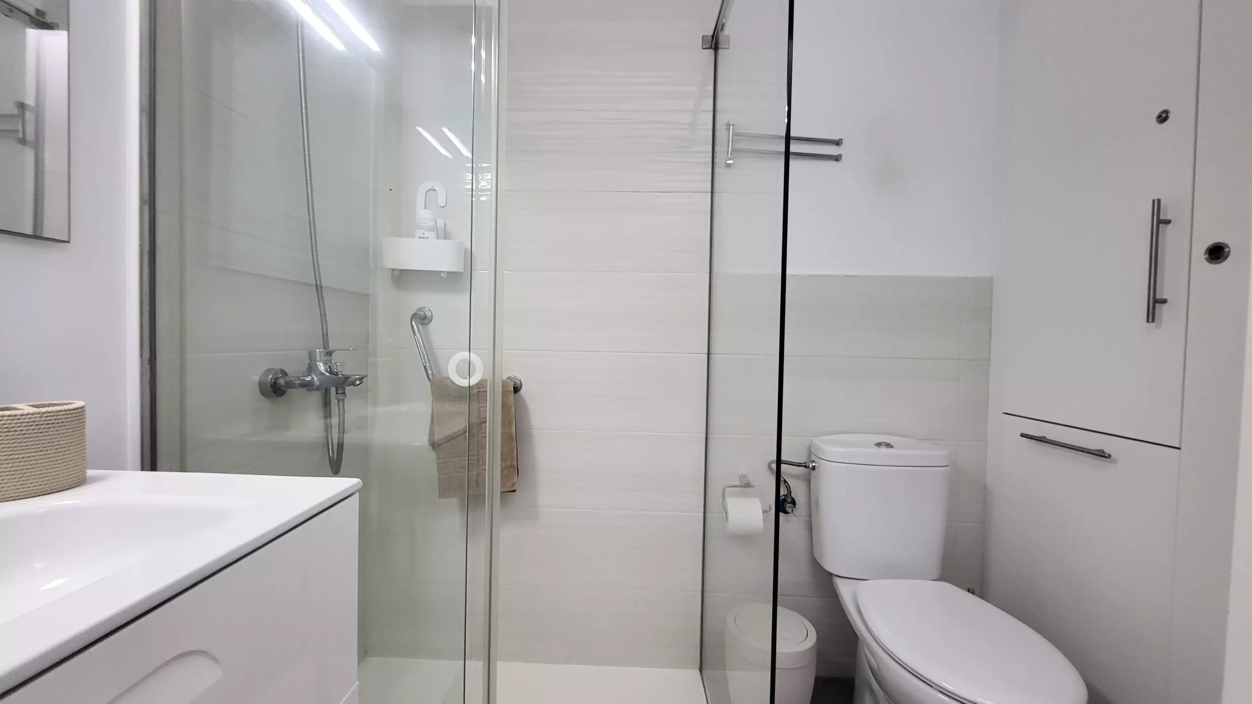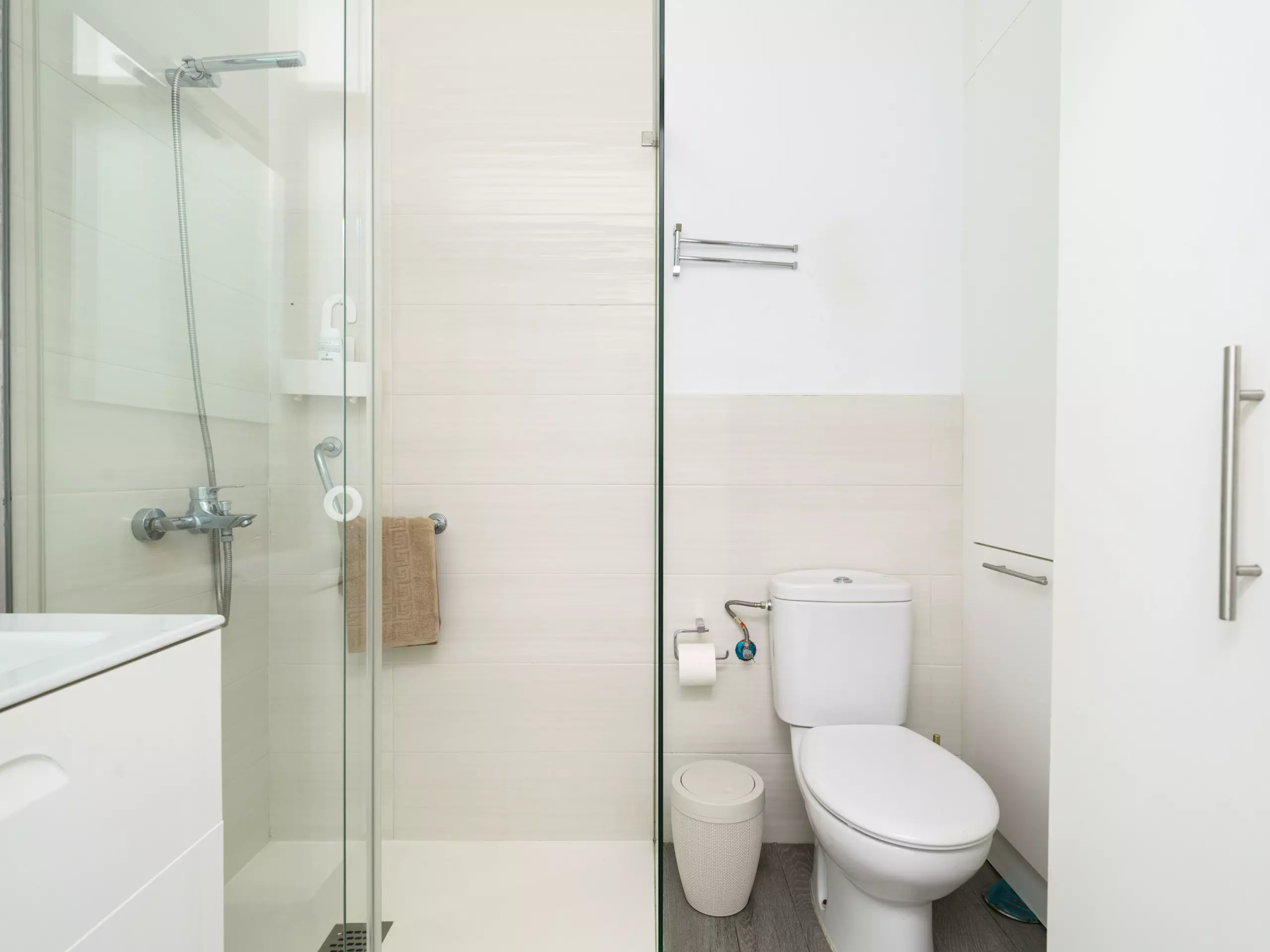 The private bathroom with shower offers essential amenities and features eco-friendly amenities such as a low-flow toilet. The apartment includes details like a smart TV, Wi-Fi, an iron, a radio, and a living area with a sofa for maximum comfort.