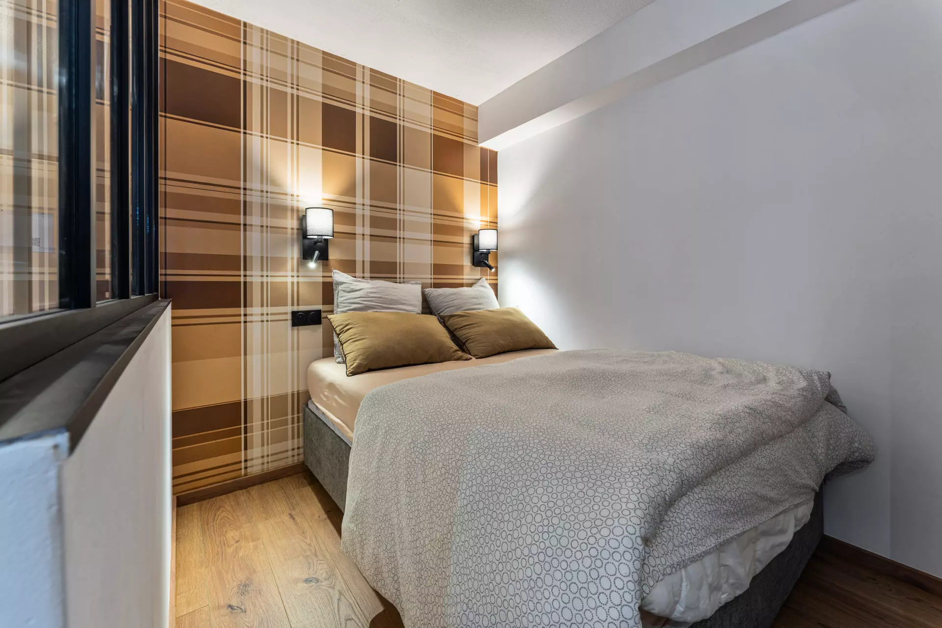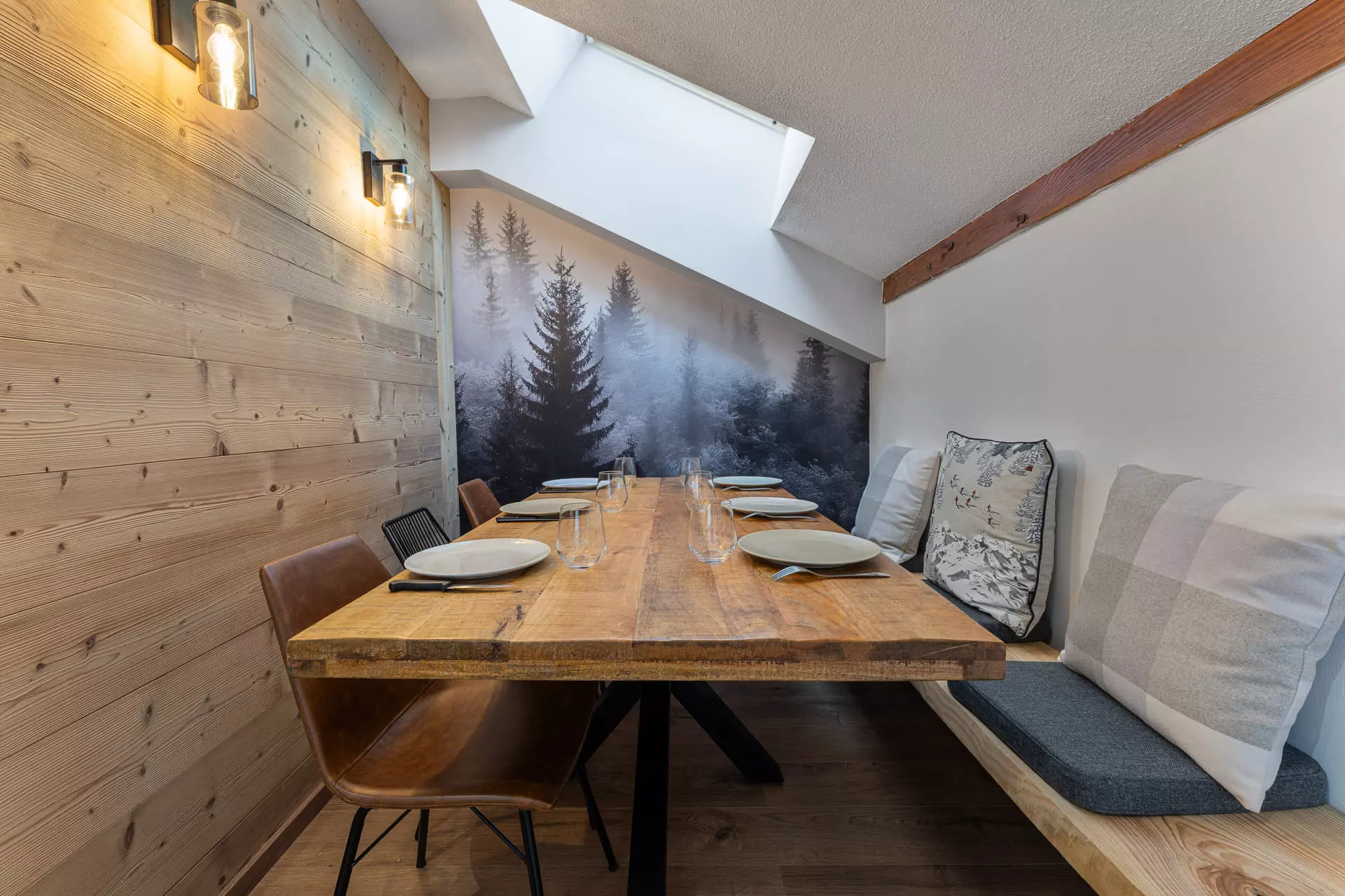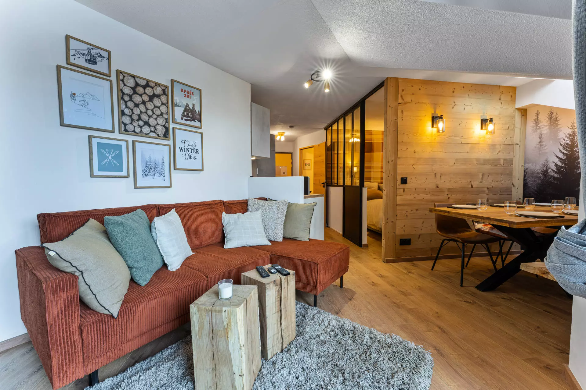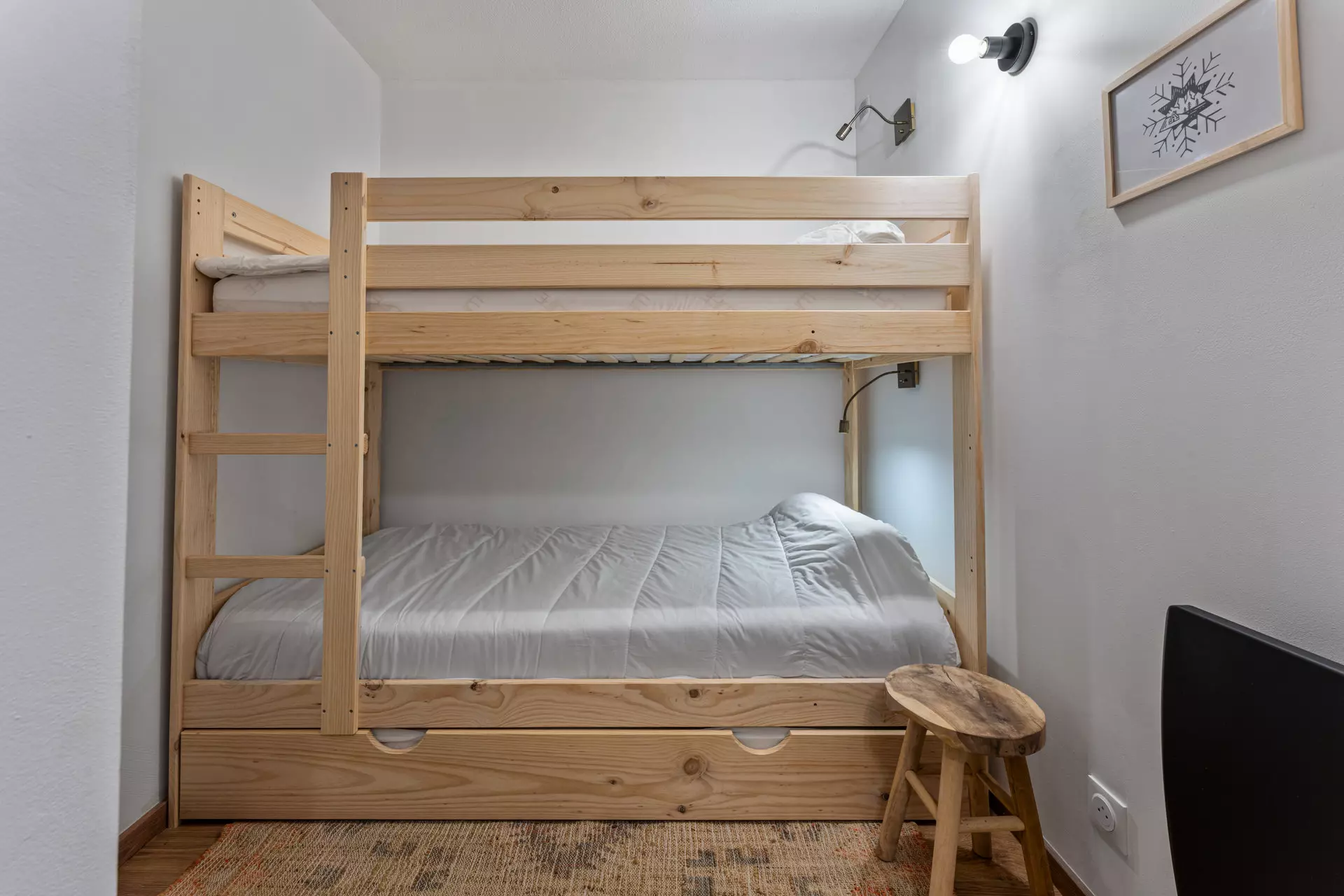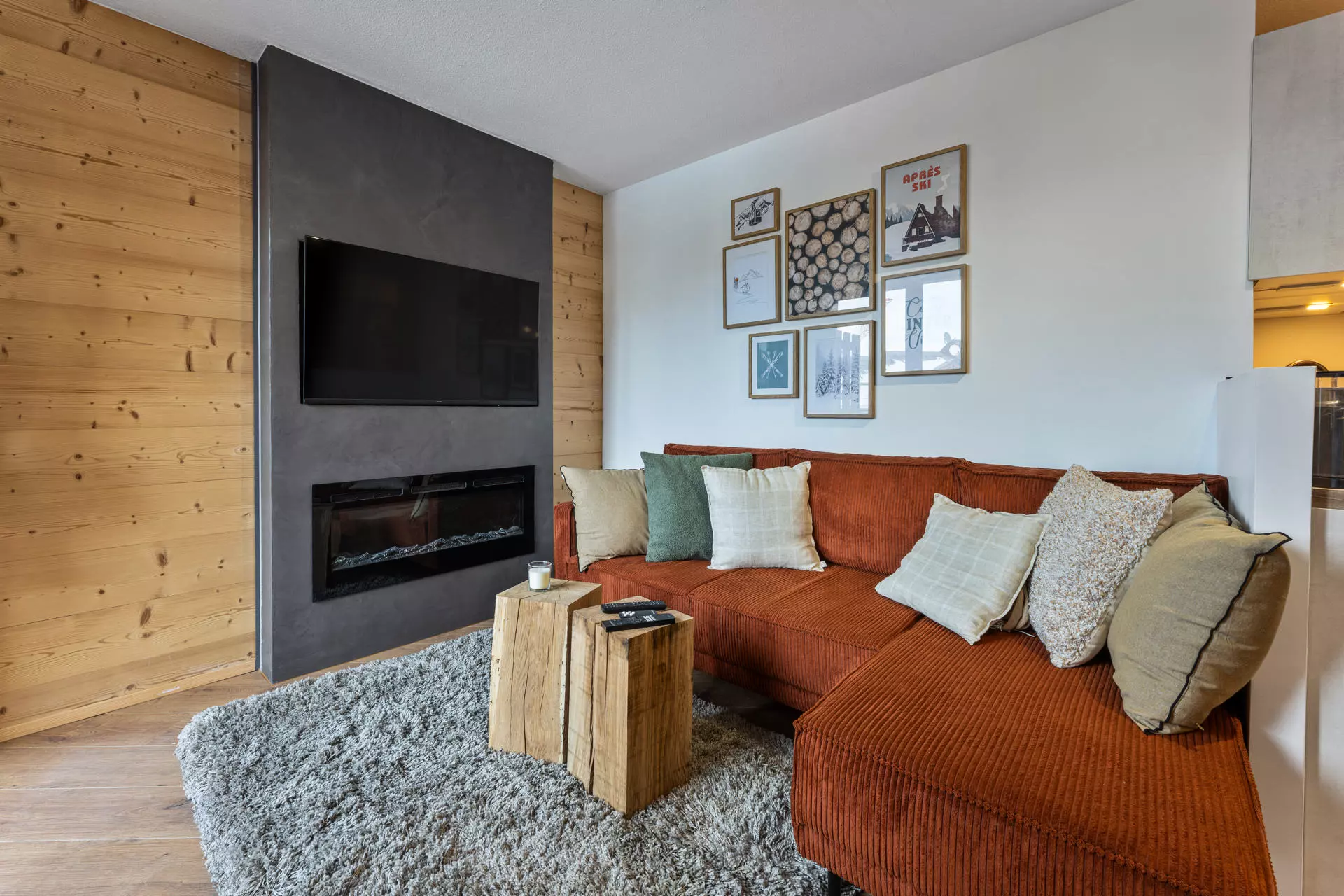 Completely redesigned, the apartment impresses with its warm decor, blending mountain style with contemporary touches. It comprises an entrance hall with storage, a bright living room with a lounge and dining area, equipped with a television and a convertible corner sofa, as well as a modern, fully equipped kitchen including a dishwasher, oven, microwave, ceramic hob, refrigerator, coffee maker, kettle and toaster.