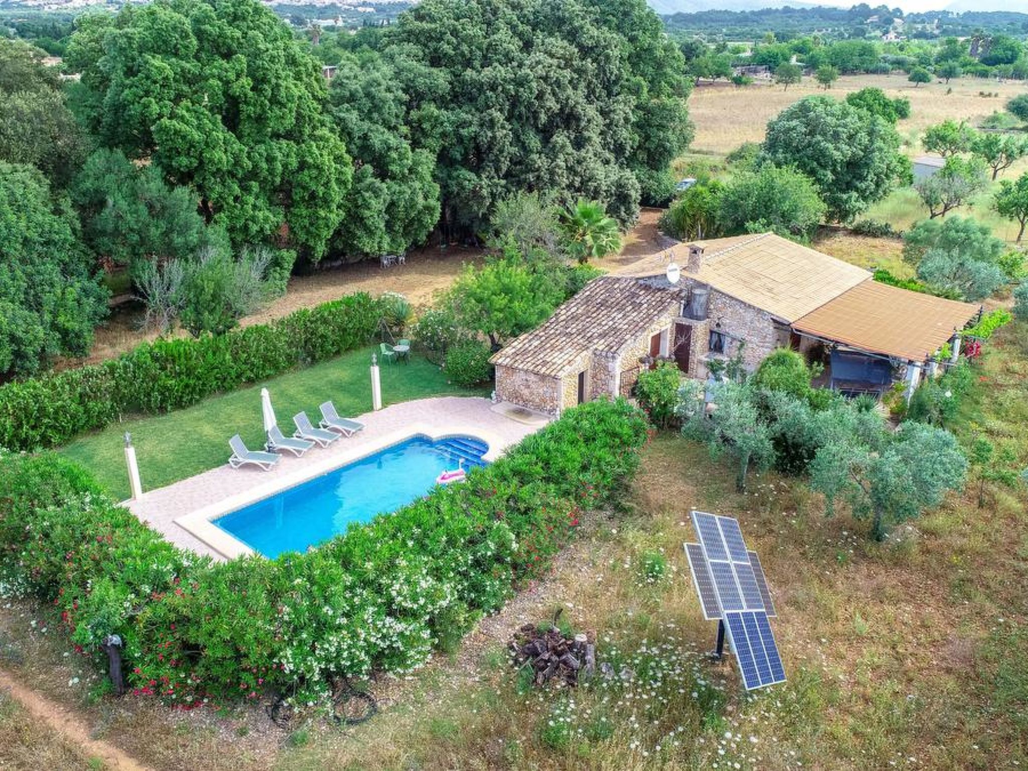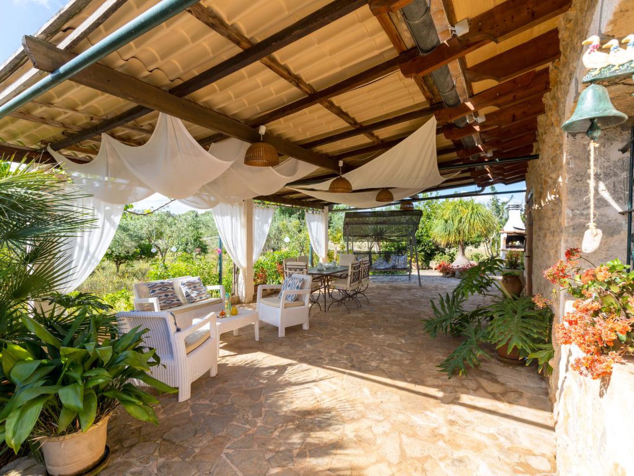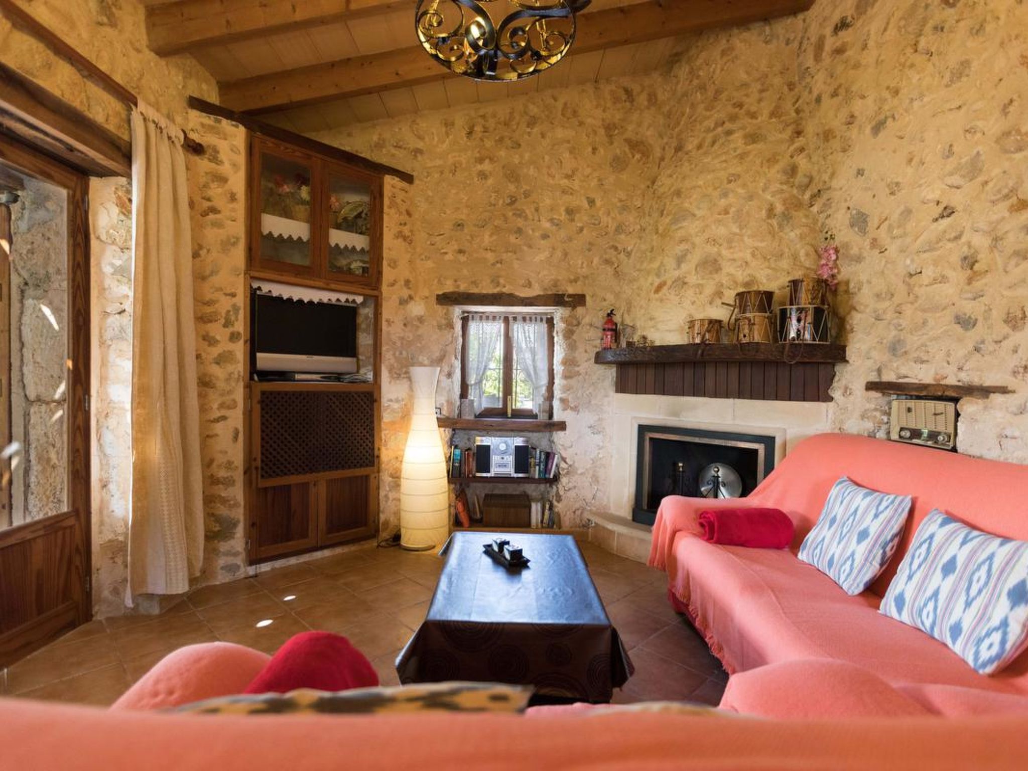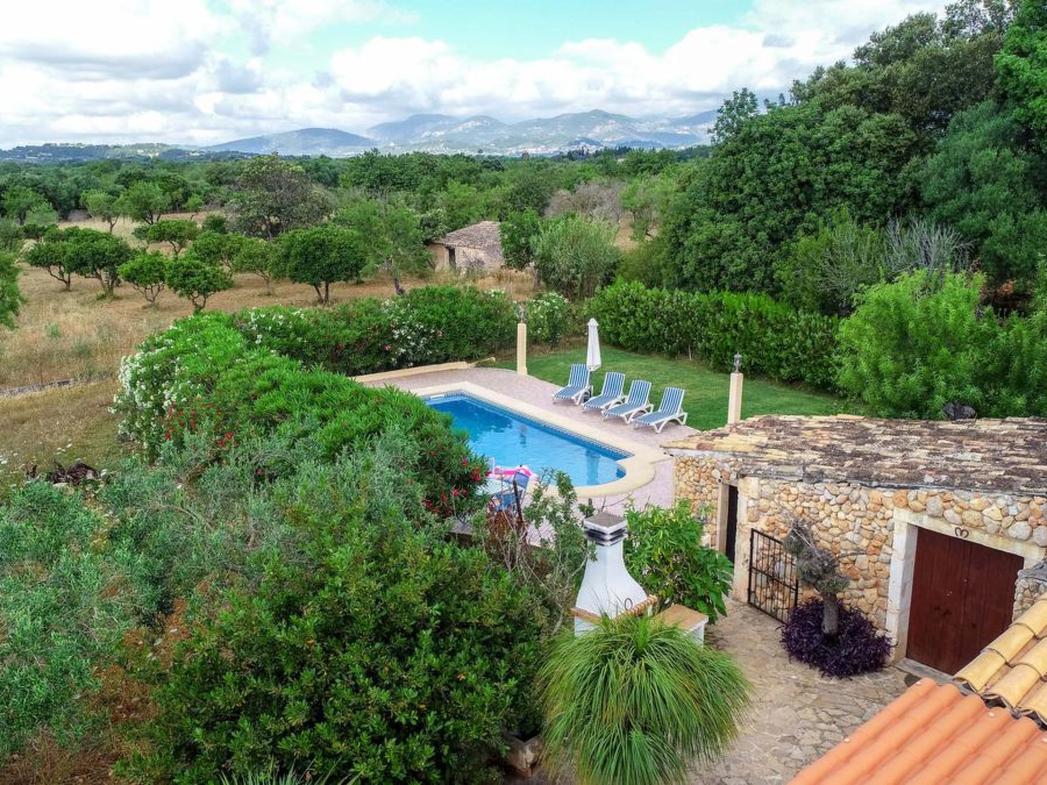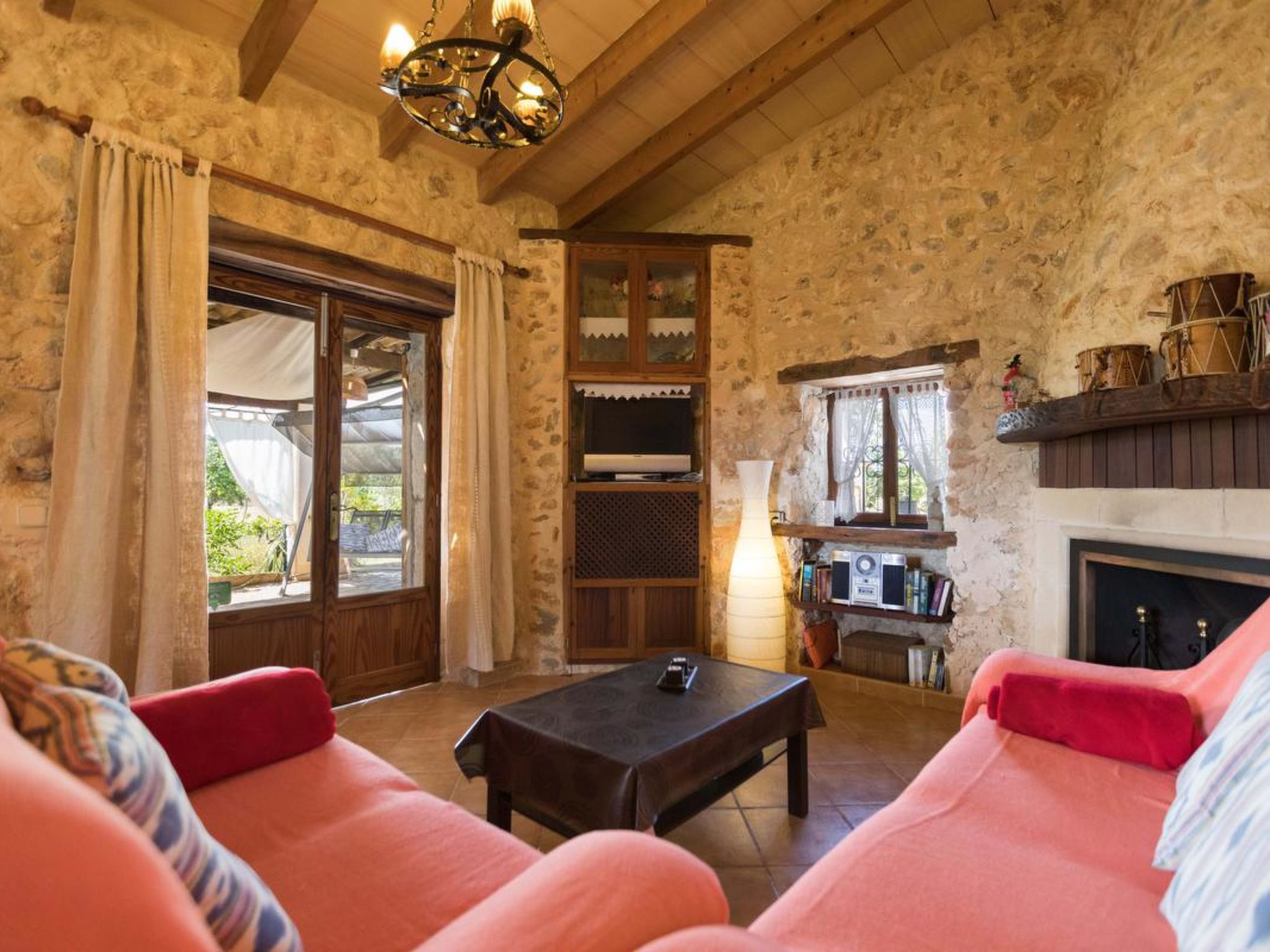 Gorgeous stone cottage set in garden with fruit trees, in the country near the friendly little village of Buger and 15 minutes from the lovely sandy beaches of Alcudia and Playa de Muro.Two double rooms, a lovely country kitchen with dining area, very cosy living room with fireplace and plenty of outdoor porches, terracing, gardens and land. All with gentle rustic touches of wood, terracotta floors, ceramic tiles, and best of all the beautiful bare stone walls, built thick to keep the heat out and the warm in.This eco-friendly house offers fresh eggs and organic vegetables to guests. The saline pool is completely fenced and surrounded by cyprus trees, for privacy, protection and safety.Also with the little ones in mind, there are swings, a slide and a climbing frame in the shade of the old Holme oak tree.Don’t expect to see any neighbours – the nearest farms are several fields away. The cottage is on the edge of a large wooded area, so you will enjoy birdsong, including nightingales in spring and summer.The village of Buger has a supermarket, banks and cafes, plus the bakery that makes the best ensaimadas (typical pastries) in Mallorca! (True – people drive up from Palma to get them)This harmonious little house invites you and your family to enjoy a relaxing holiday in the country within easy driving distance from the sea. The only problem is – you won’t want to go home!