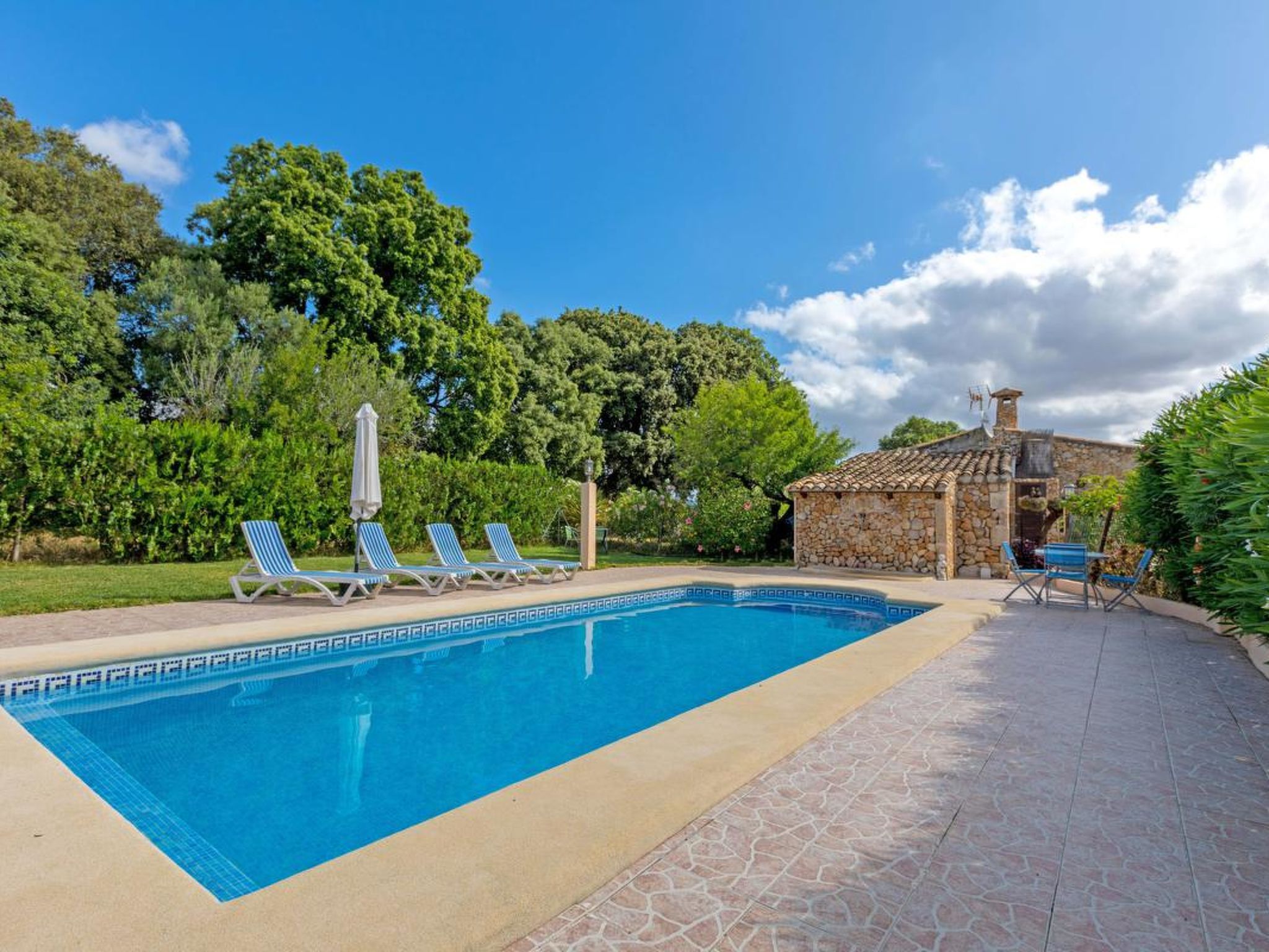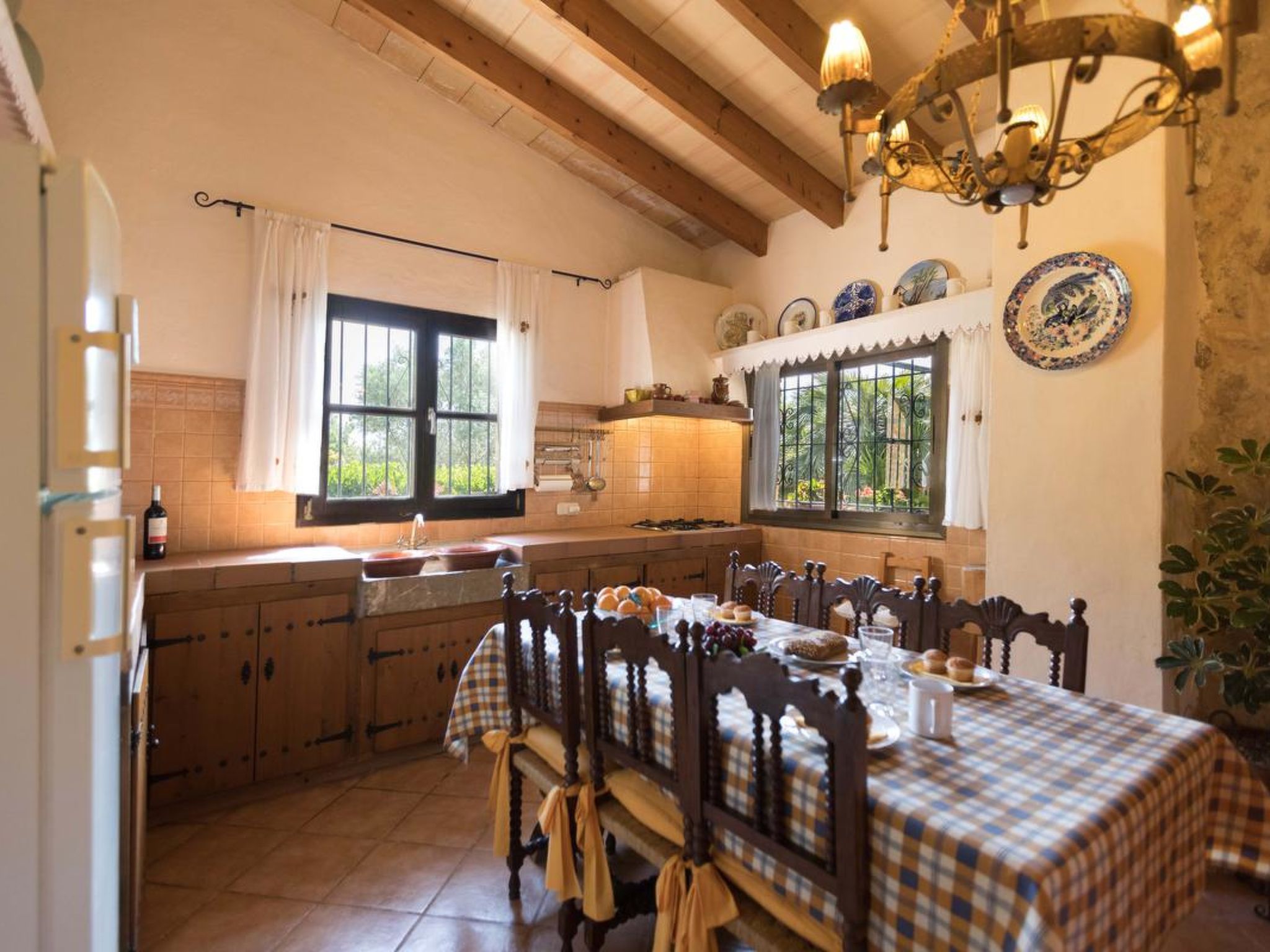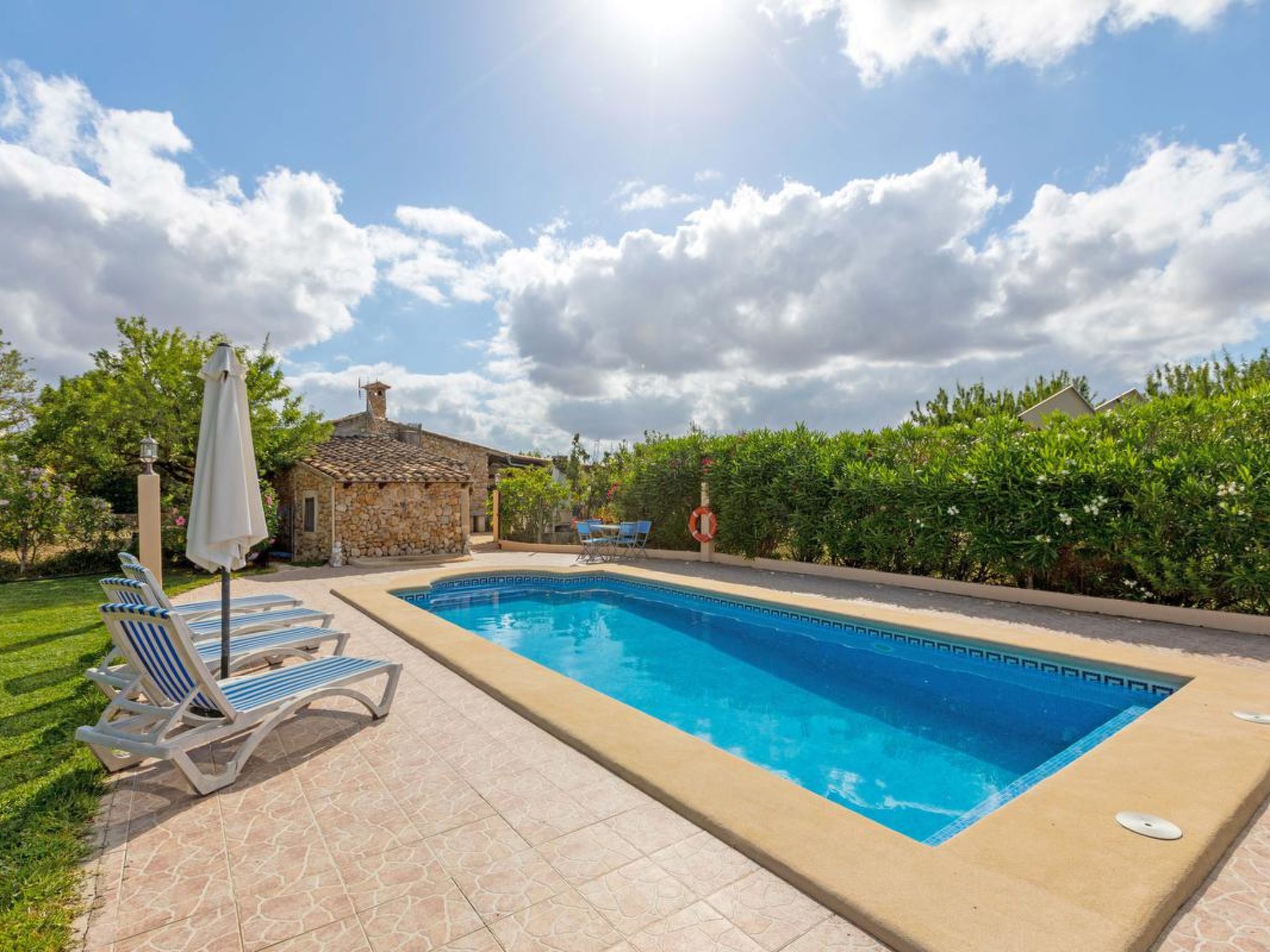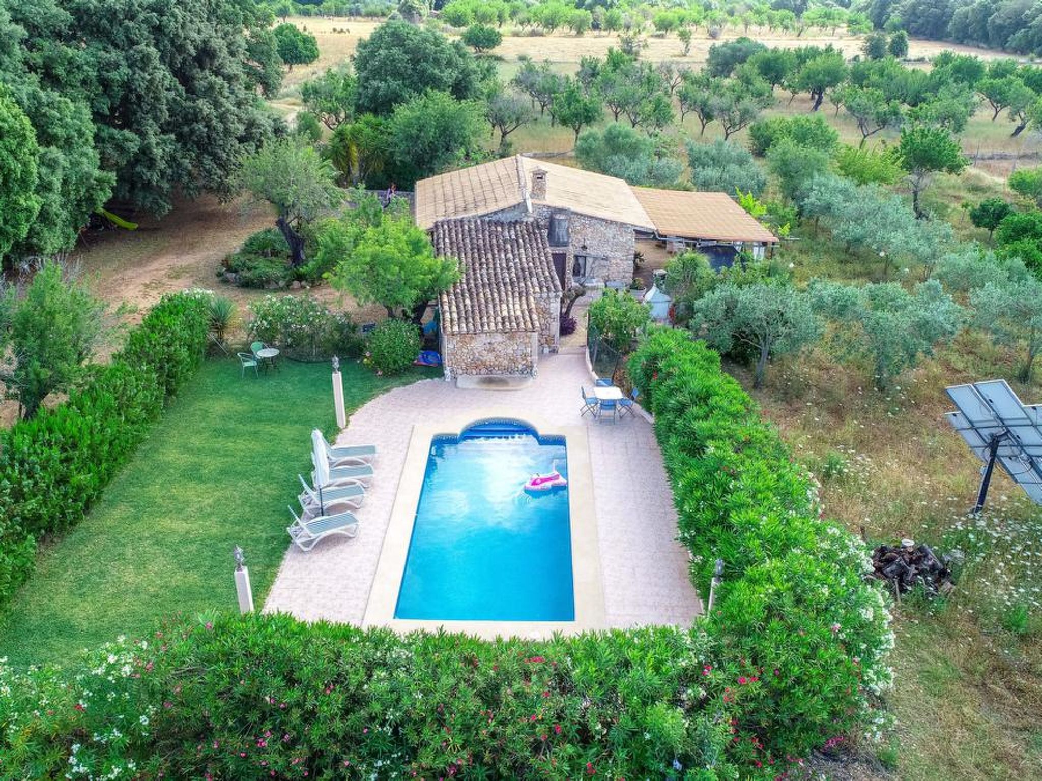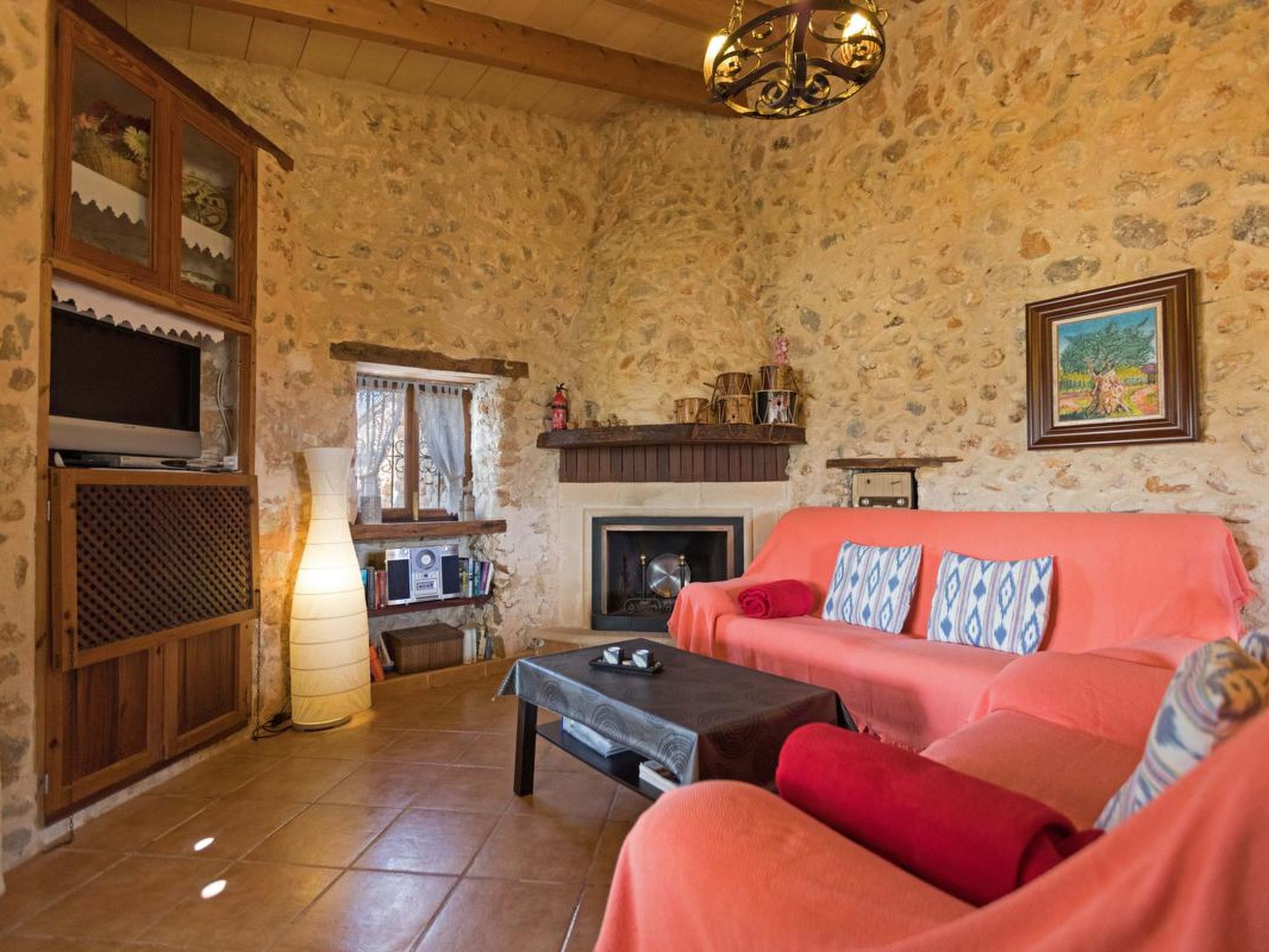 Gorgeous stone cottage set in garden with fruit trees, in the country near the friendly little village of Buger and 15 minutes from the lovely sandy beaches of Alcudia and Playa de Muro.Two double rooms, a lovely country kitchen with dining area, very cosy living room with fireplace and plenty of outdoor porches, terracing, gardens and land. All with gentle rustic touches of wood, terracotta floors, ceramic tiles, and best of all the beautiful bare stone walls, built thick to keep the heat out and the warm in.This eco-friendly house offers fresh eggs and organic vegetables to guests. The saline pool is completely fenced and surrounded by cyprus trees, for privacy, protection and safety.Also with the little ones in mind, there are swings, a slide and a climbing frame in the shade of the old Holme oak tree.Don’t expect to see any neighbours – the nearest farms are several fields away. The cottage is on the edge of a large wooded area, so you will enjoy birdsong, including nightingales in spring and summer.The village of Buger has a supermarket, banks and cafes, plus the bakery that makes the best ensaimadas (typical pastries) in Mallorca! (True – people drive up from Palma to get them)This harmonious little house invites you and your family to enjoy a relaxing holiday in the country within easy driving distance from the sea. The only problem is – you won’t want to go home!