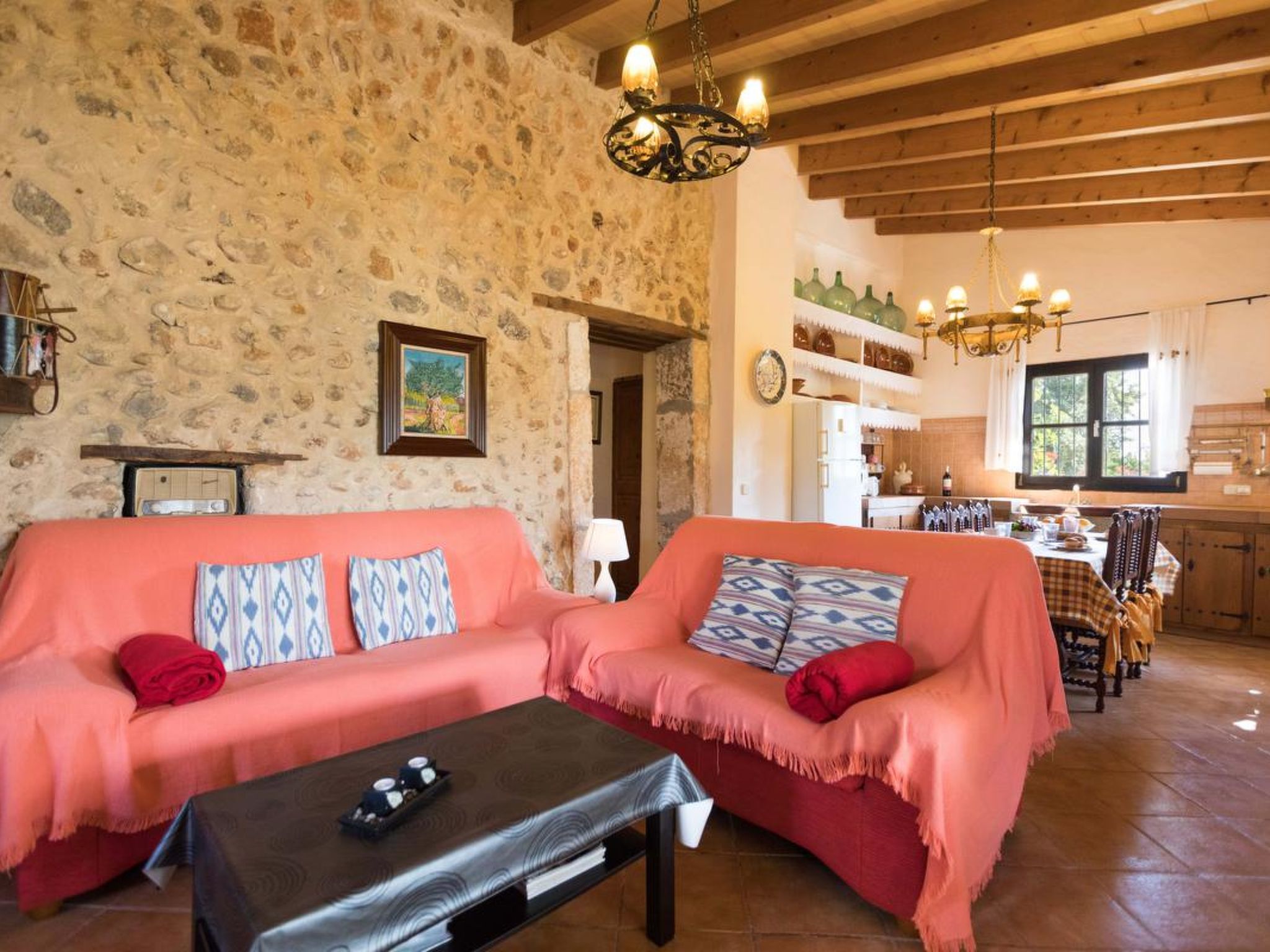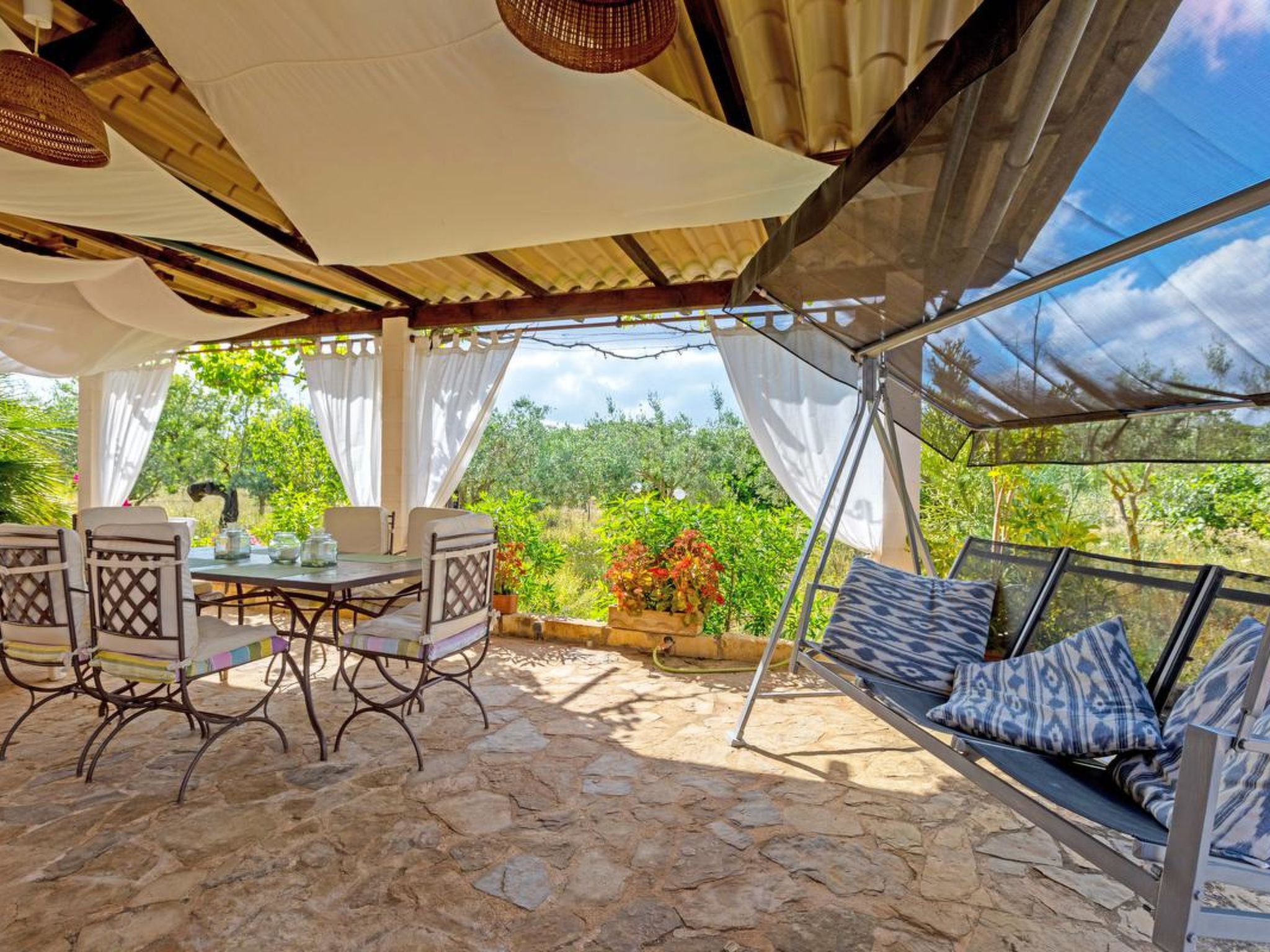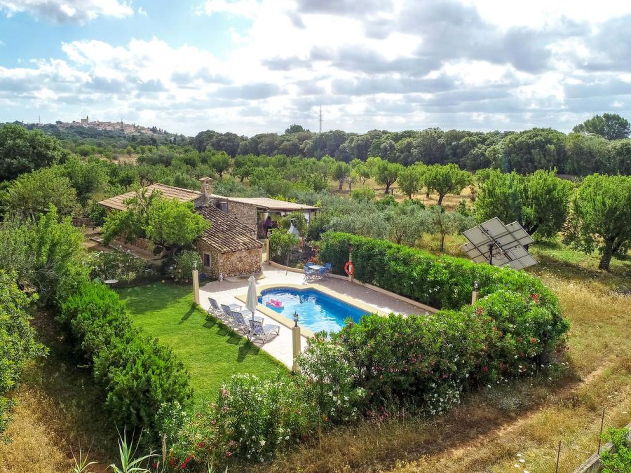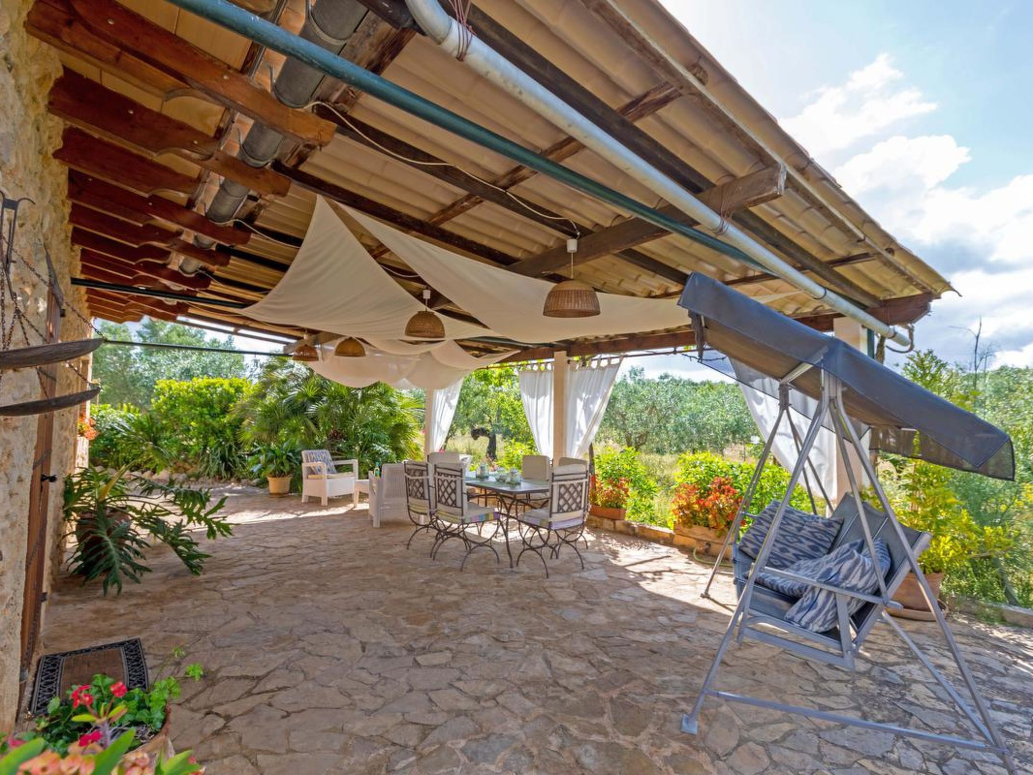 Gorgeous stone cottage set in garden with fruit trees, in the country near the friendly little village of Buger and 15 minutes from the lovely sandy beaches of Alcudia and Playa de Muro.Two double rooms, a lovely country kitchen with dining area, very cosy living room with fireplace and plenty of outdoor porches, terracing, gardens and land. All with gentle rustic touches of wood, terracotta floors, ceramic tiles, and best of all the beautiful bare stone walls, built thick to keep the heat out and the warm in.This eco-friendly house offers fresh eggs and organic vegetables to guests. The saline pool is completely fenced and surrounded by cyprus trees, for privacy, protection and safety.Also with the little ones in mind, there are swings, a slide and a climbing frame in the shade of the old Holme oak tree.Don’t expect to see any neighbours – the nearest farms are several fields away. The cottage is on the edge of a large wooded area, so you will enjoy birdsong, including nightingales in spring and summer.The village of Buger has a supermarket, banks and cafes, plus the bakery that makes the best ensaimadas (typical pastries) in Mallorca! (True – people drive up from Palma to get them)This harmonious little house invites you and your family to enjoy a relaxing holiday in the country within easy driving distance from the sea. The only problem is – you won’t want to go home!