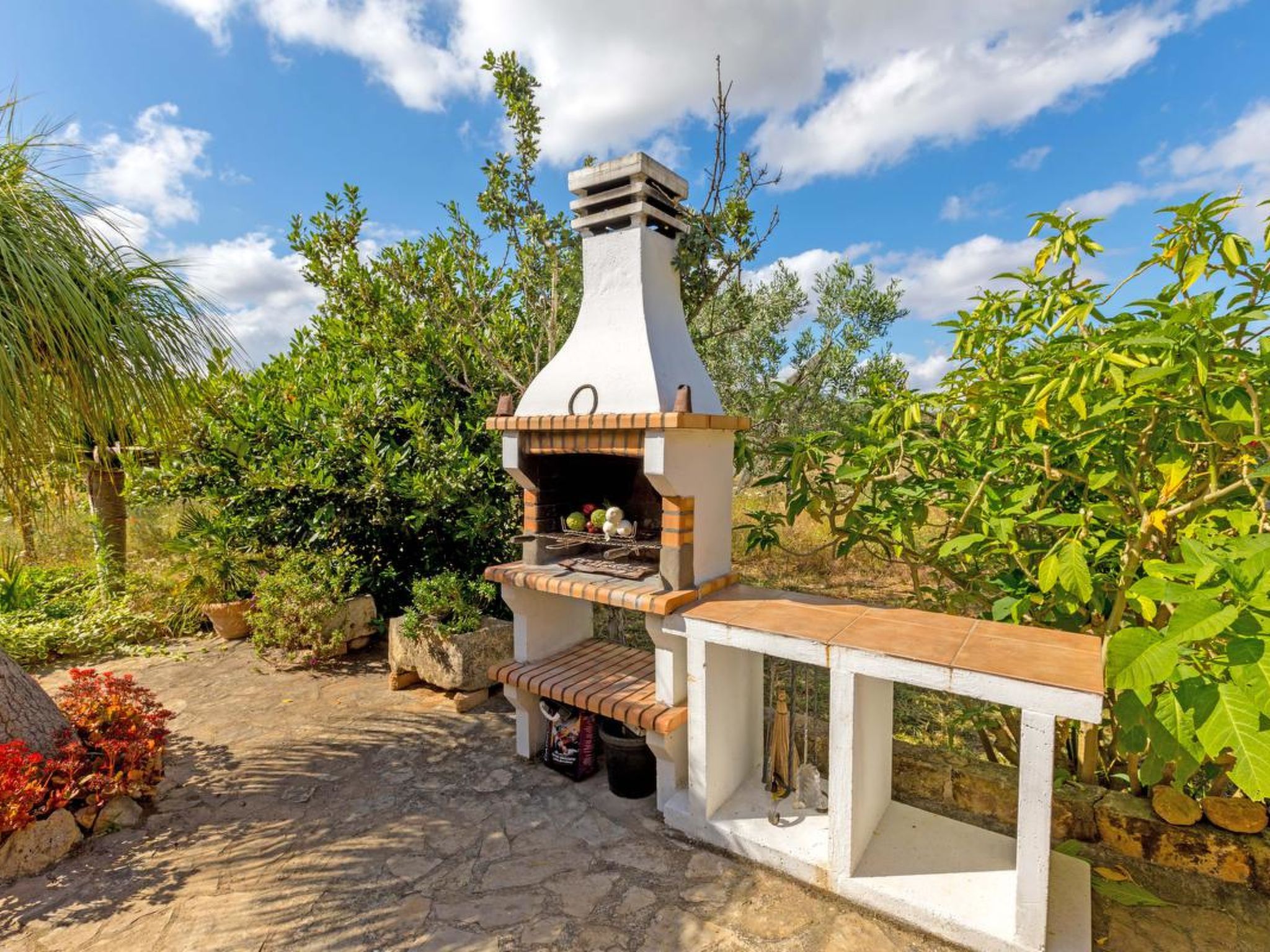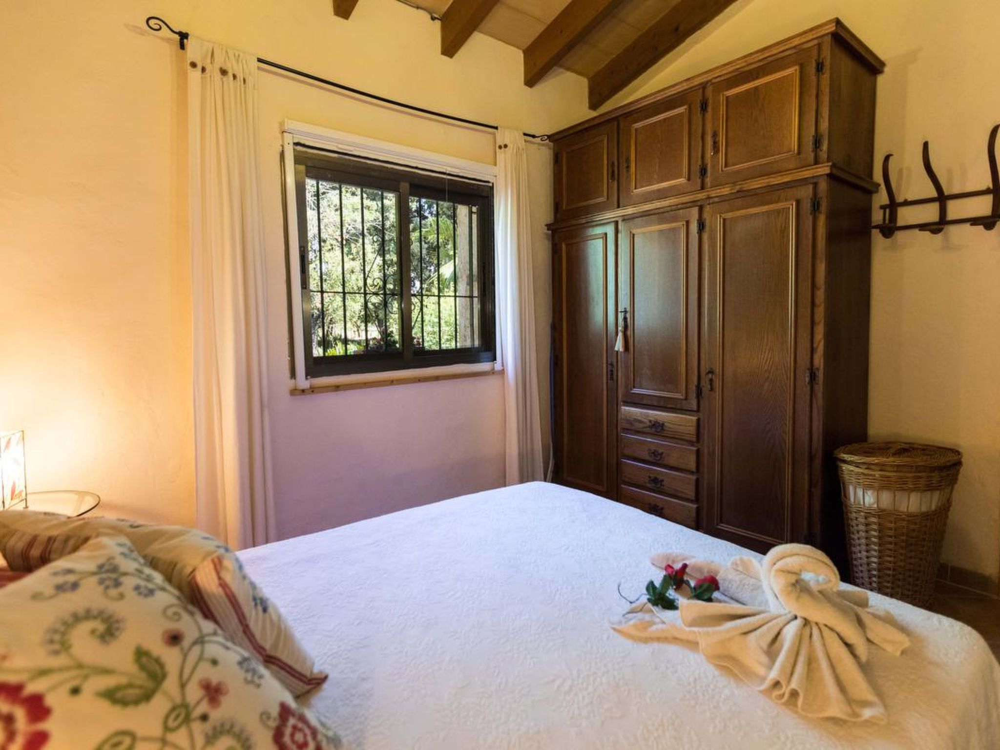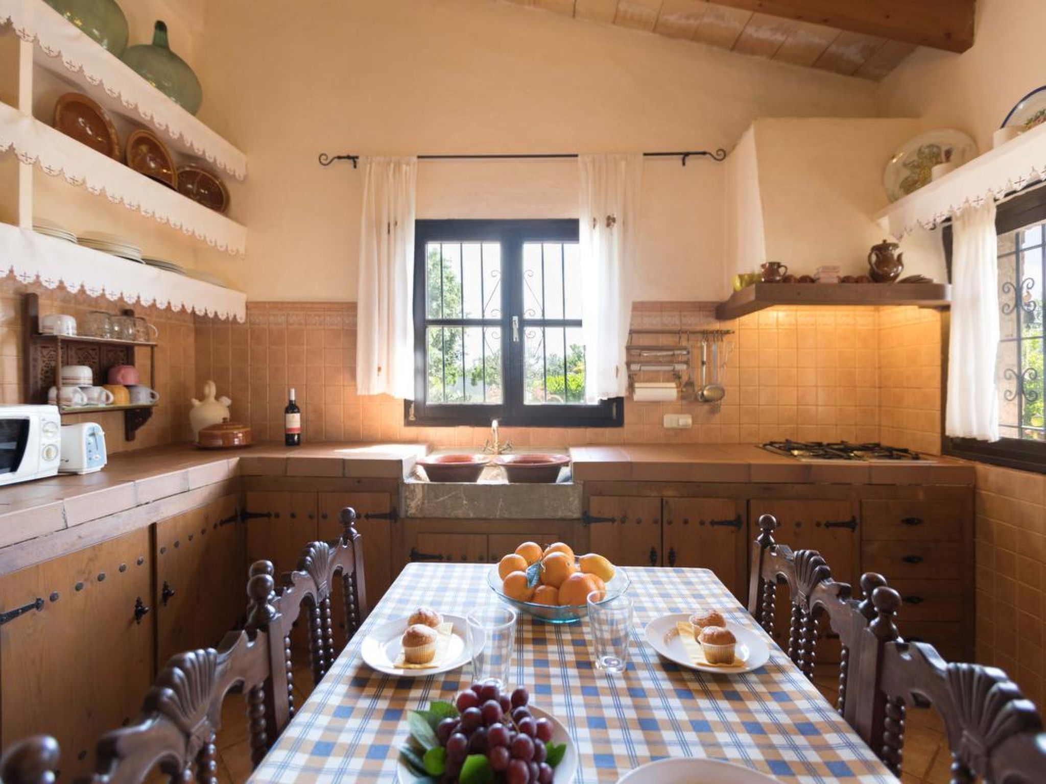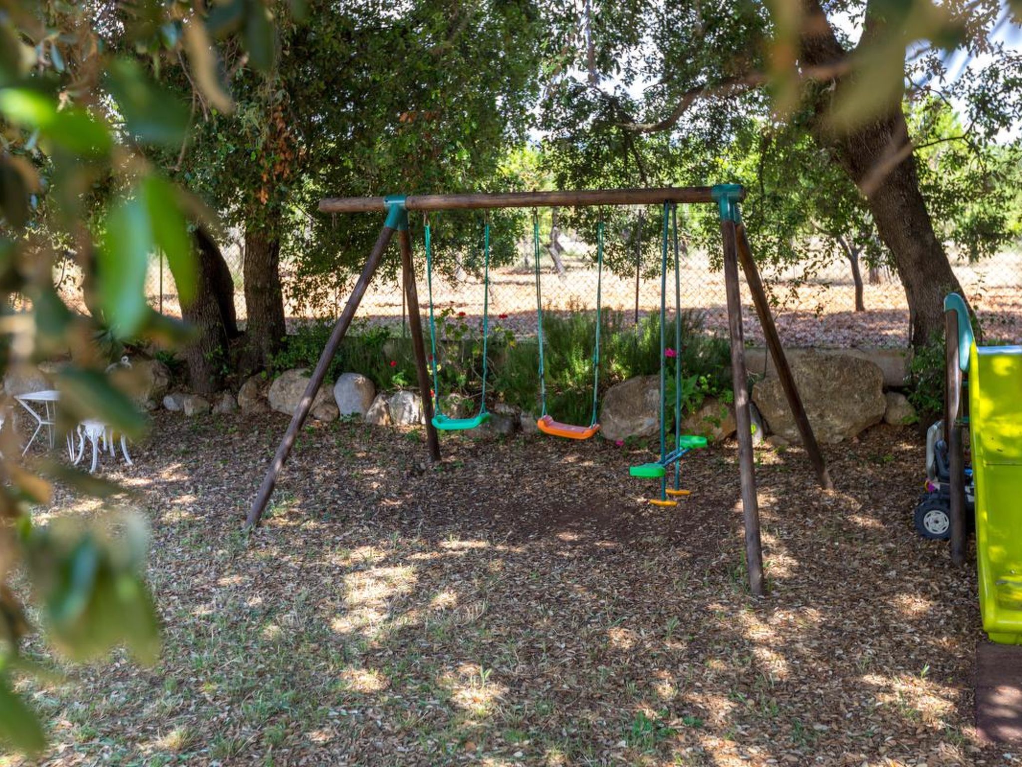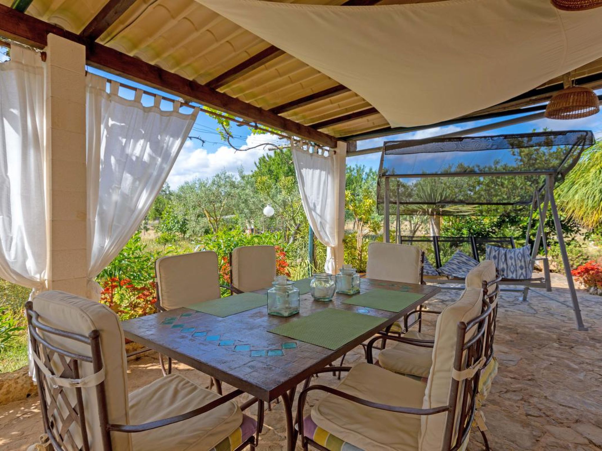 Gorgeous stone cottage set in garden with fruit trees, in the country near the friendly little village of Buger and 15 minutes from the lovely sandy beaches of Alcudia and Playa de Muro.Two double rooms, a lovely country kitchen with dining area, very cosy living room with fireplace and plenty of outdoor porches, terracing, gardens and land. All with gentle rustic touches of wood, terracotta floors, ceramic tiles, and best of all the beautiful bare stone walls, built thick to keep the heat out and the warm in.This eco-friendly house offers fresh eggs and organic vegetables to guests. The saline pool is completely fenced and surrounded by cyprus trees, for privacy, protection and safety.Also with the little ones in mind, there are swings, a slide and a climbing frame in the shade of the old Holme oak tree.Don’t expect to see any neighbours – the nearest farms are several fields away. The cottage is on the edge of a large wooded area, so you will enjoy birdsong, including nightingales in spring and summer.The village of Buger has a supermarket, banks and cafes, plus the bakery that makes the best ensaimadas (typical pastries) in Mallorca! (True – people drive up from Palma to get them)This harmonious little house invites you and your family to enjoy a relaxing holiday in the country within easy driving distance from the sea. The only problem is – you won’t want to go home!