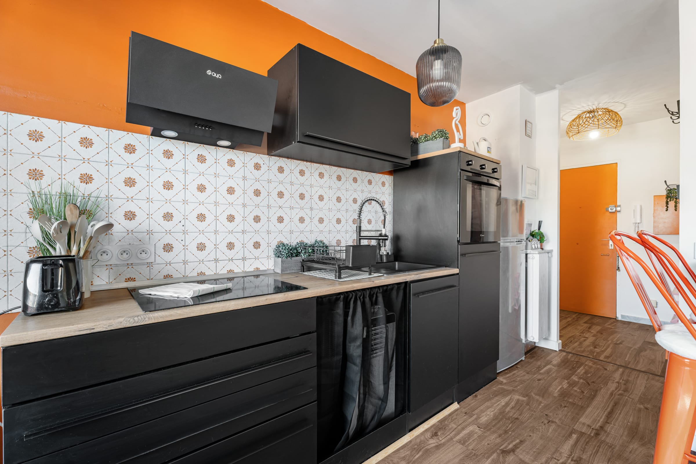 - a fully-equipped open kitchen (plancha, coffee machine, toaster, kettle, oven, microwave, hob, fridge, freezer),
