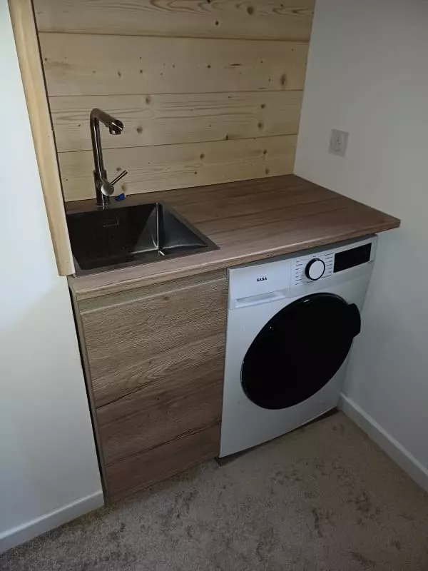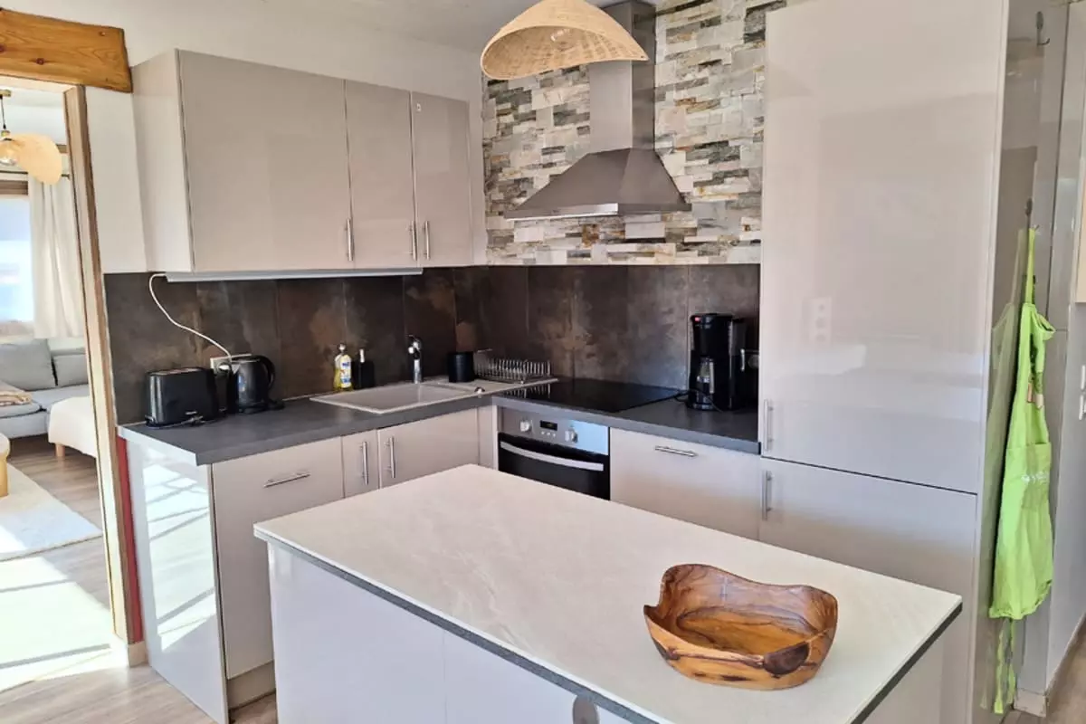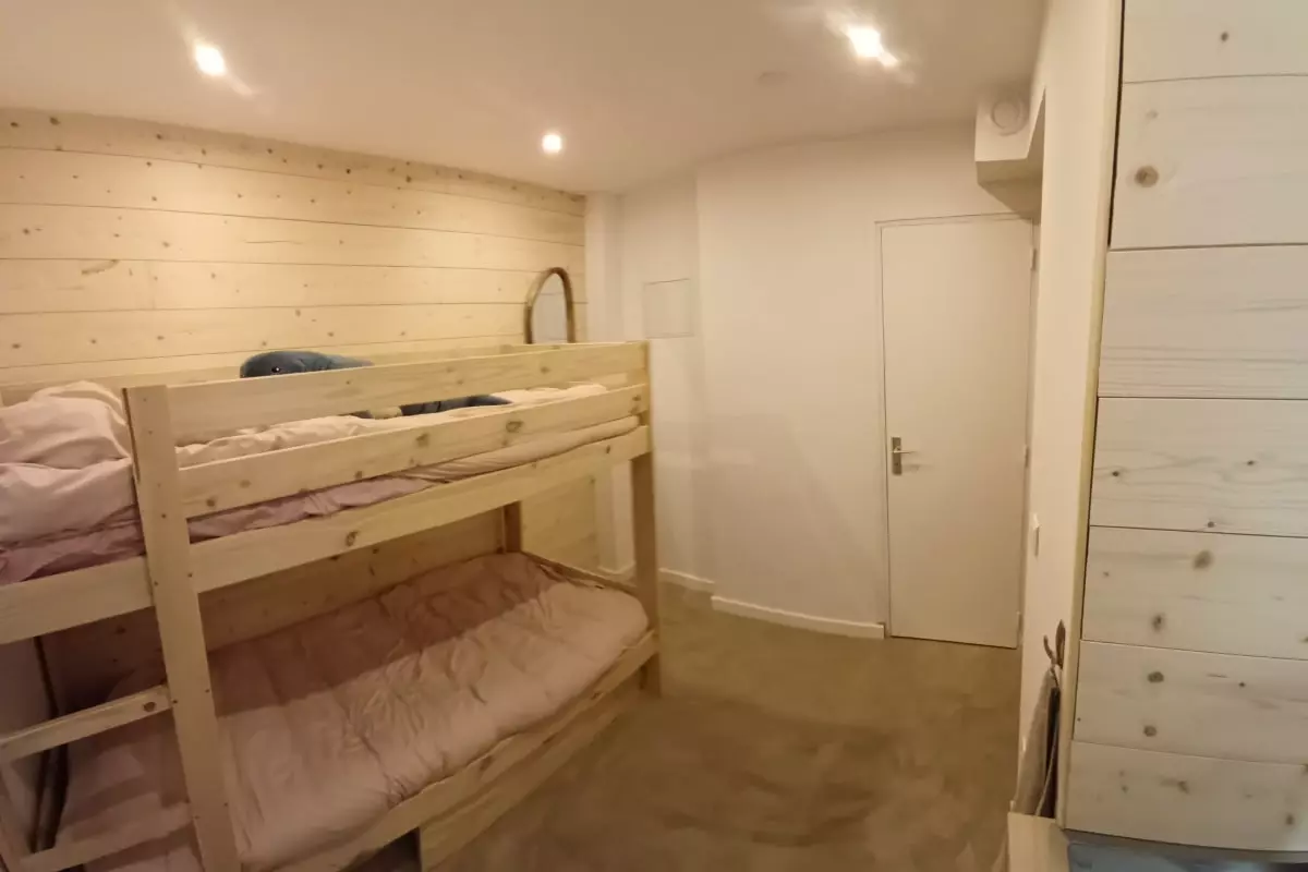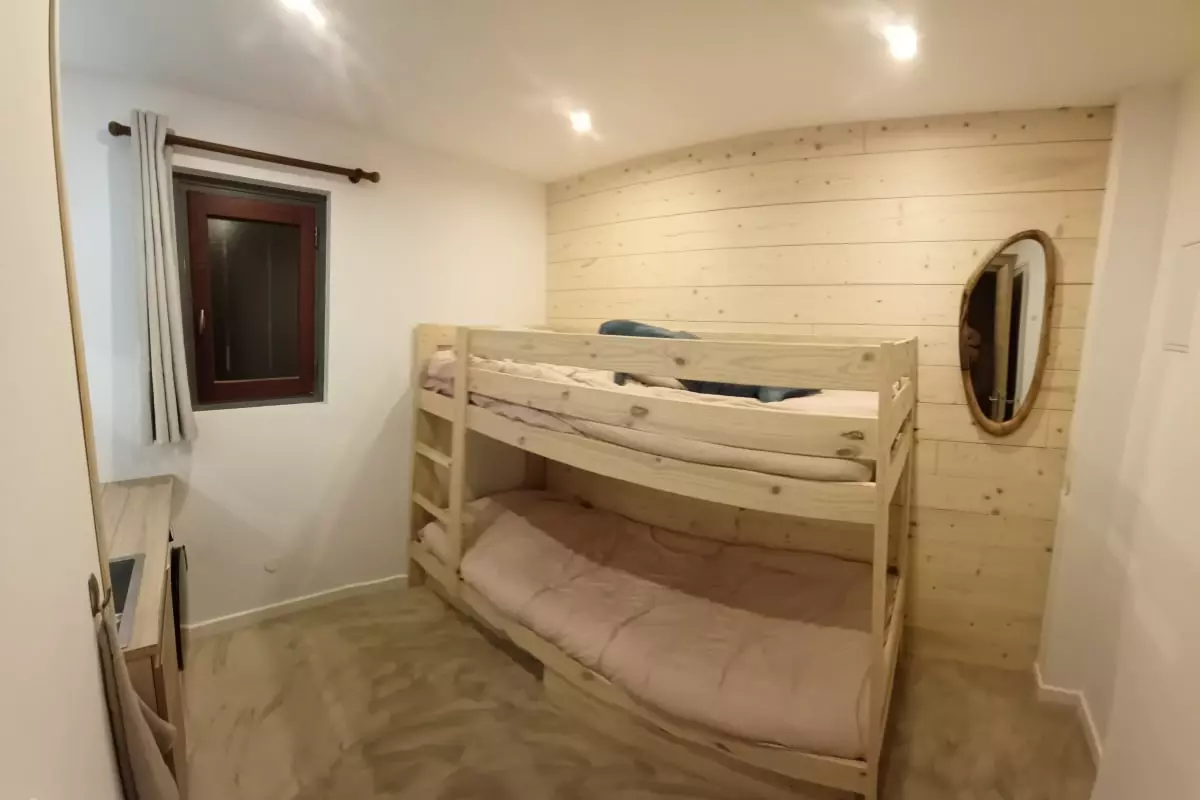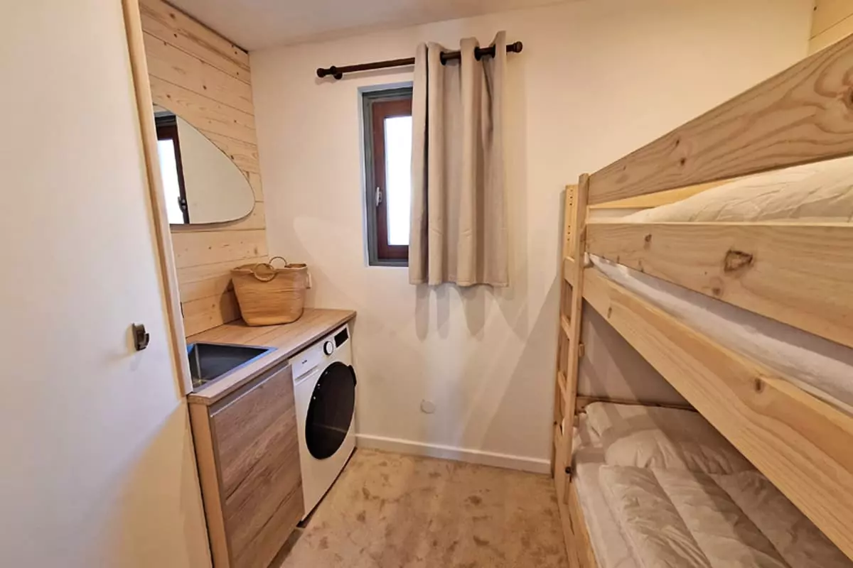 The bedroom has a 160x200 double bed, while the second bedroom is equipped with an 80x190 bunk bed.