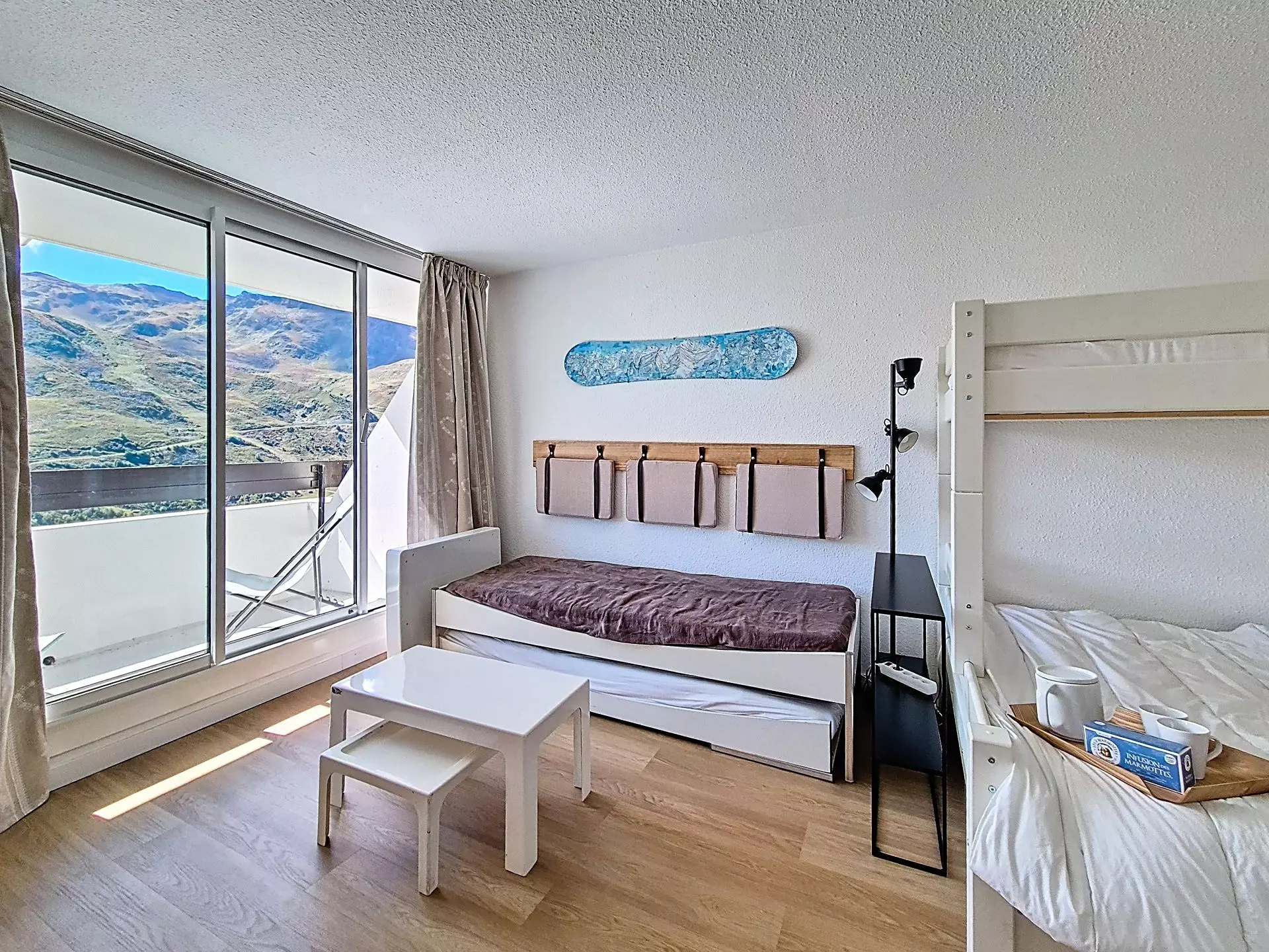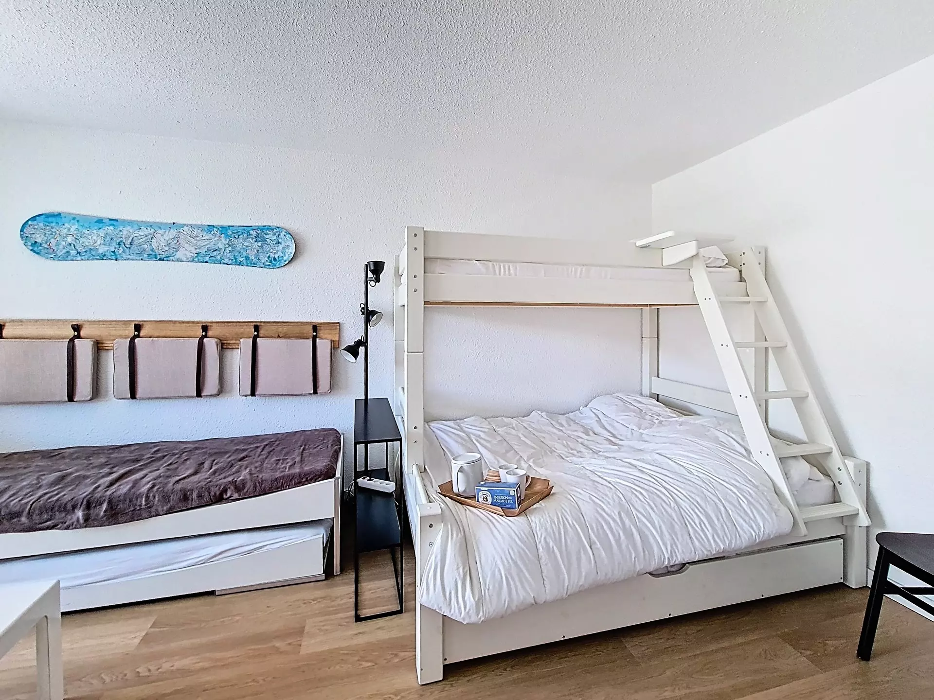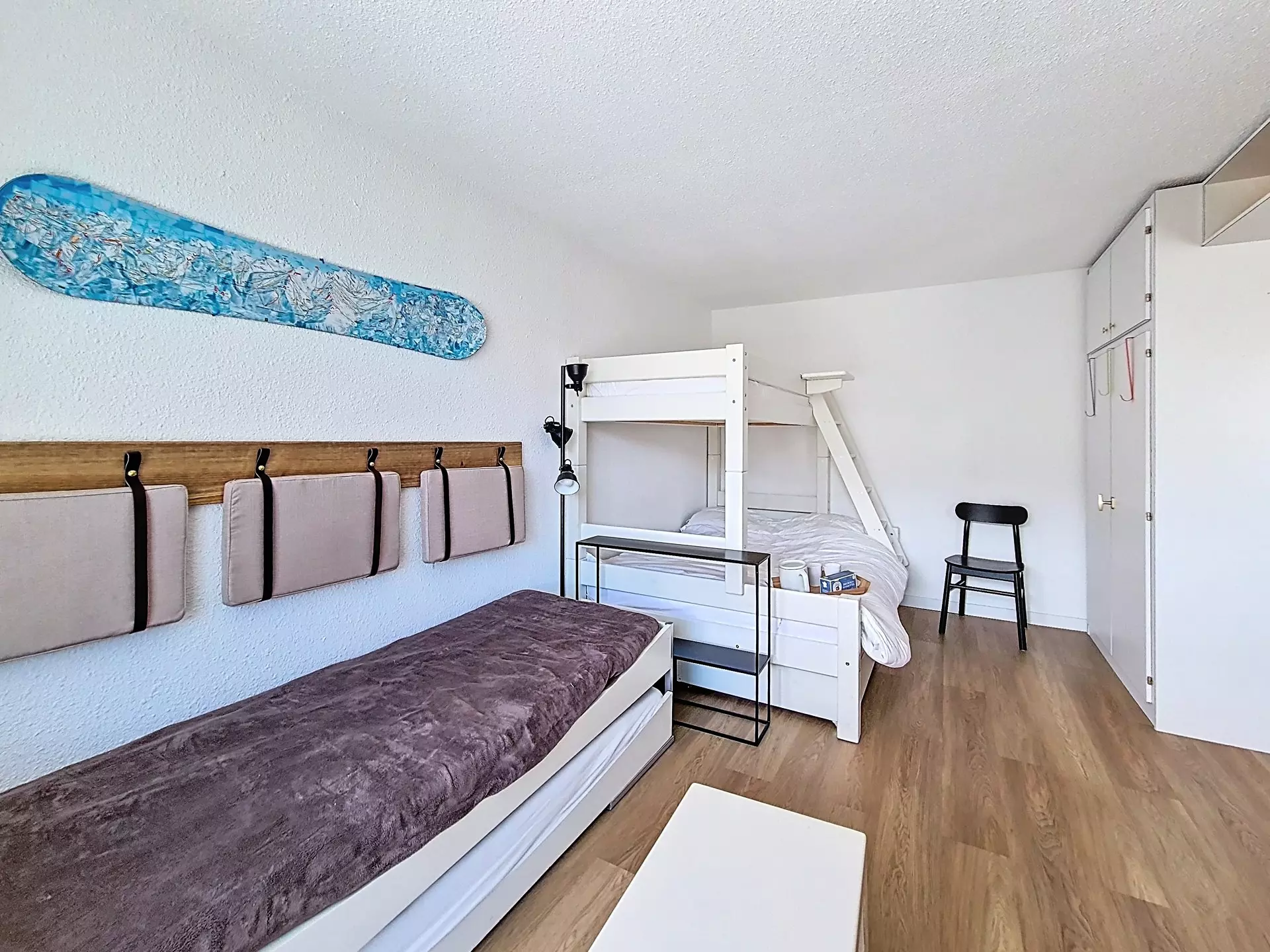 Bedroom: one double bed + 1 single bunk bed and one single bed.