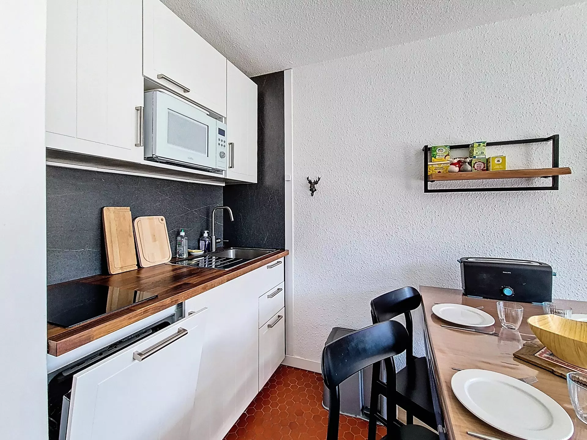 Kitchen equipped with 2 induction hobs, extractor hood, mini oven, microwave, refrigerator, dishwasher, Senseo coffee maker, toaster and kettle.