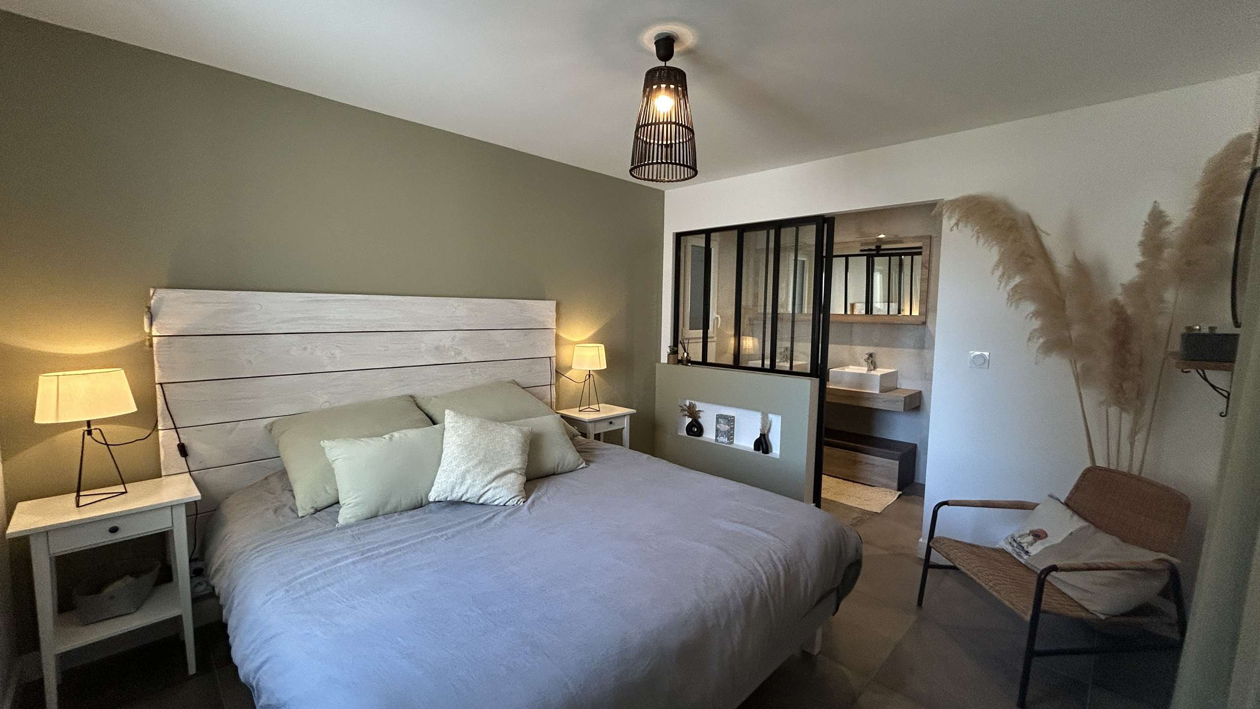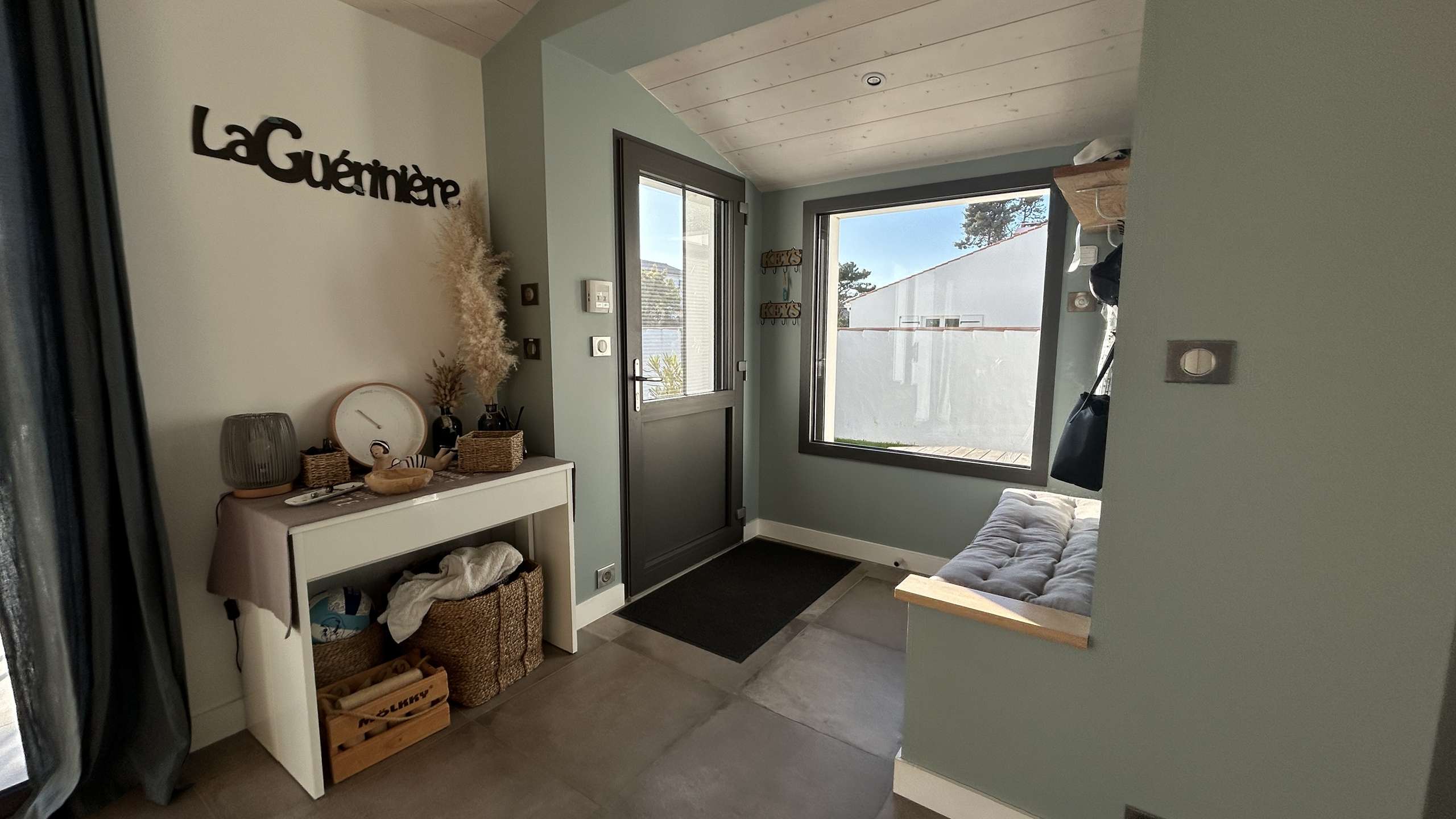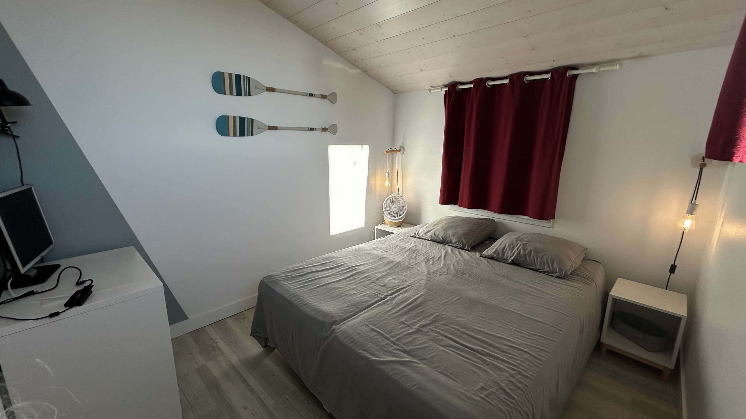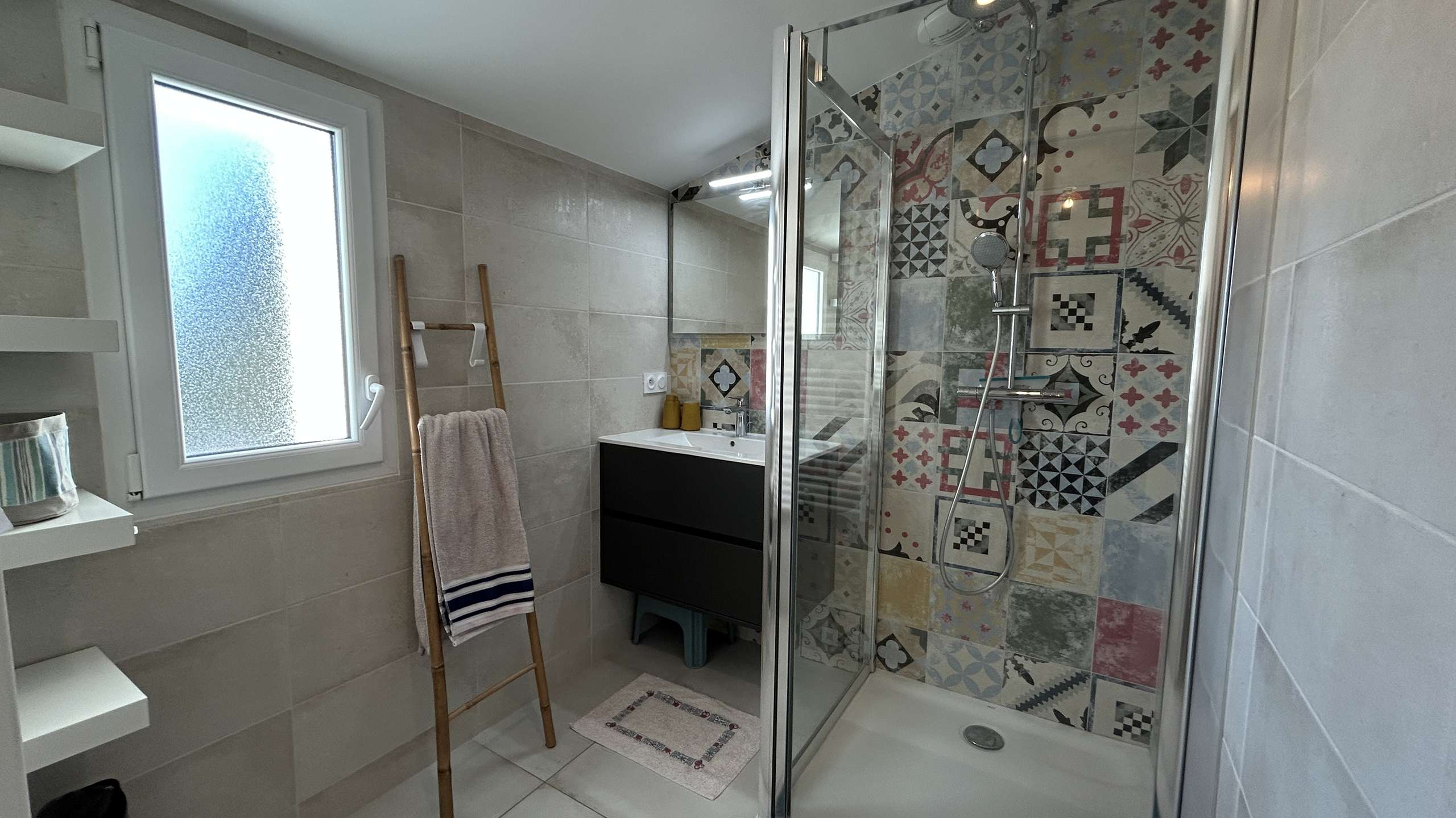 This beautiful holiday home offers all the comforts needed for a pleasant stay by the sea. On the ground floor, you will find an entrance hall, a spacious living room separate from the dining room, a fully equipped open-plan kitchen leading onto the patio, a master bedroom with a king-size bed (180 cm) and an en-suite shower room, a utility room, and a separate WC. Upstairs, the house has two bedrooms: one with two single beds (80 cm) that can be joined to make a queen-size bed (160 cm), and the other with a pull-out bed that can be converted into a queen-size bed (160 cm), as well as a shower room and a WC.