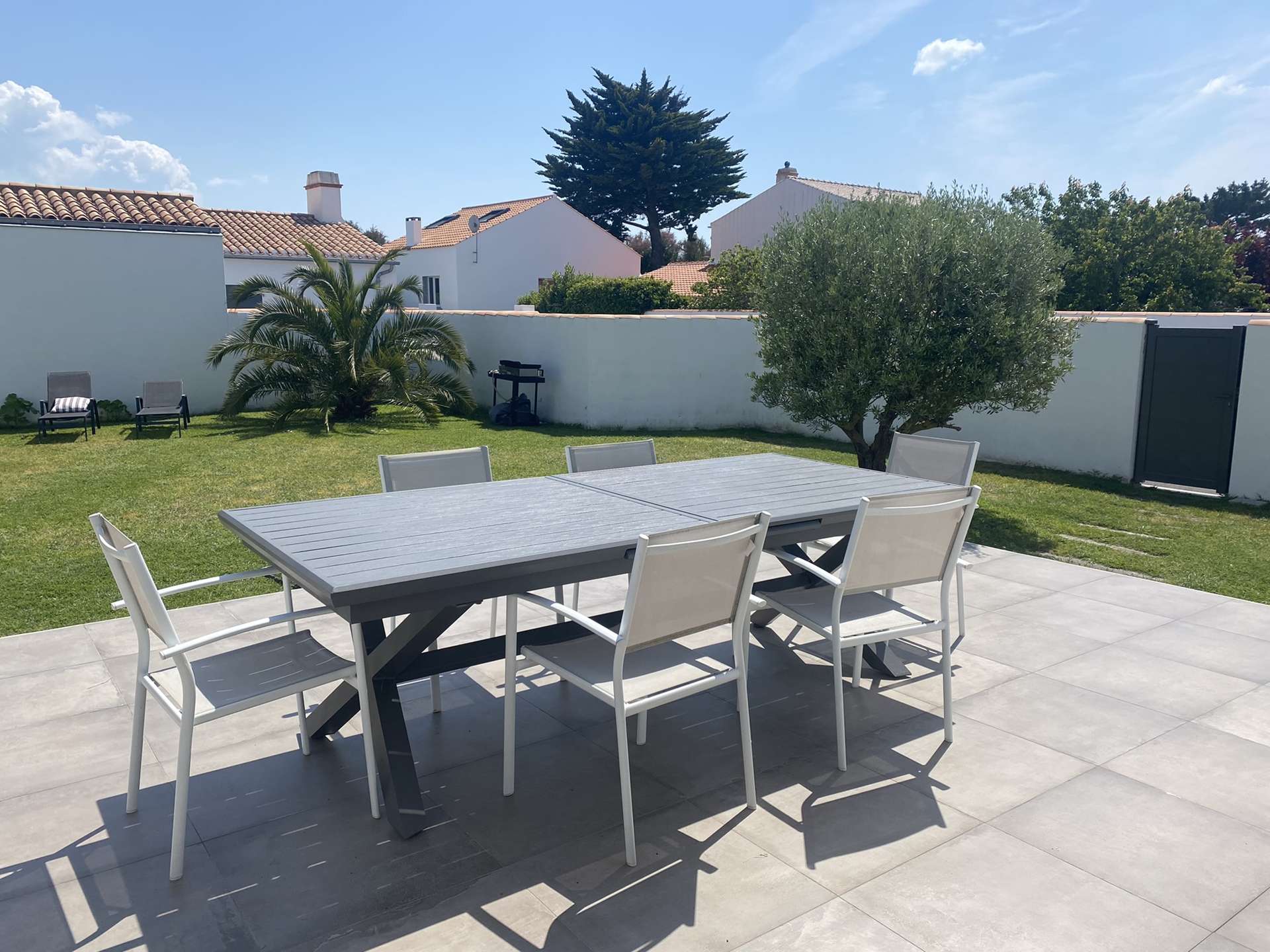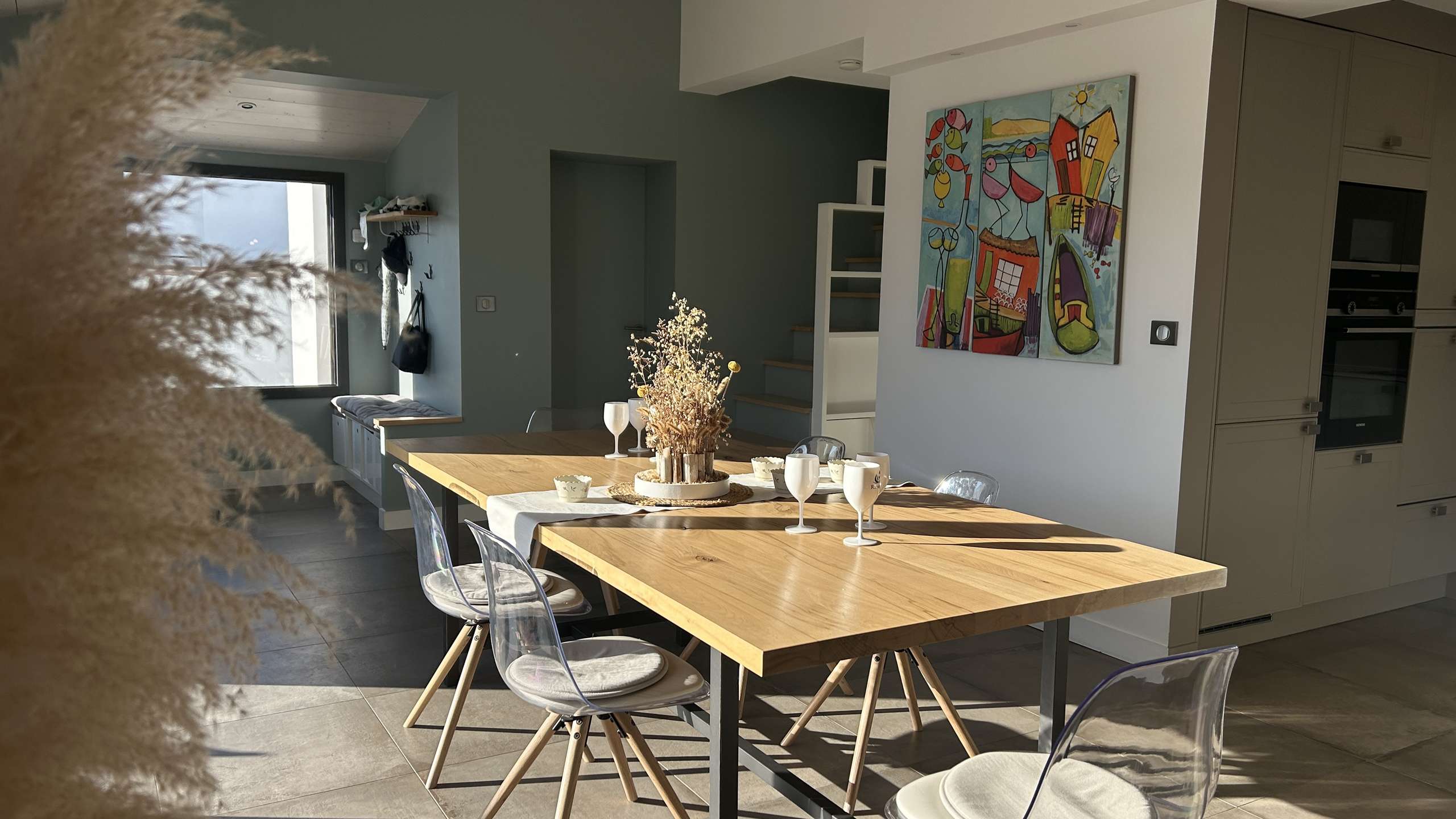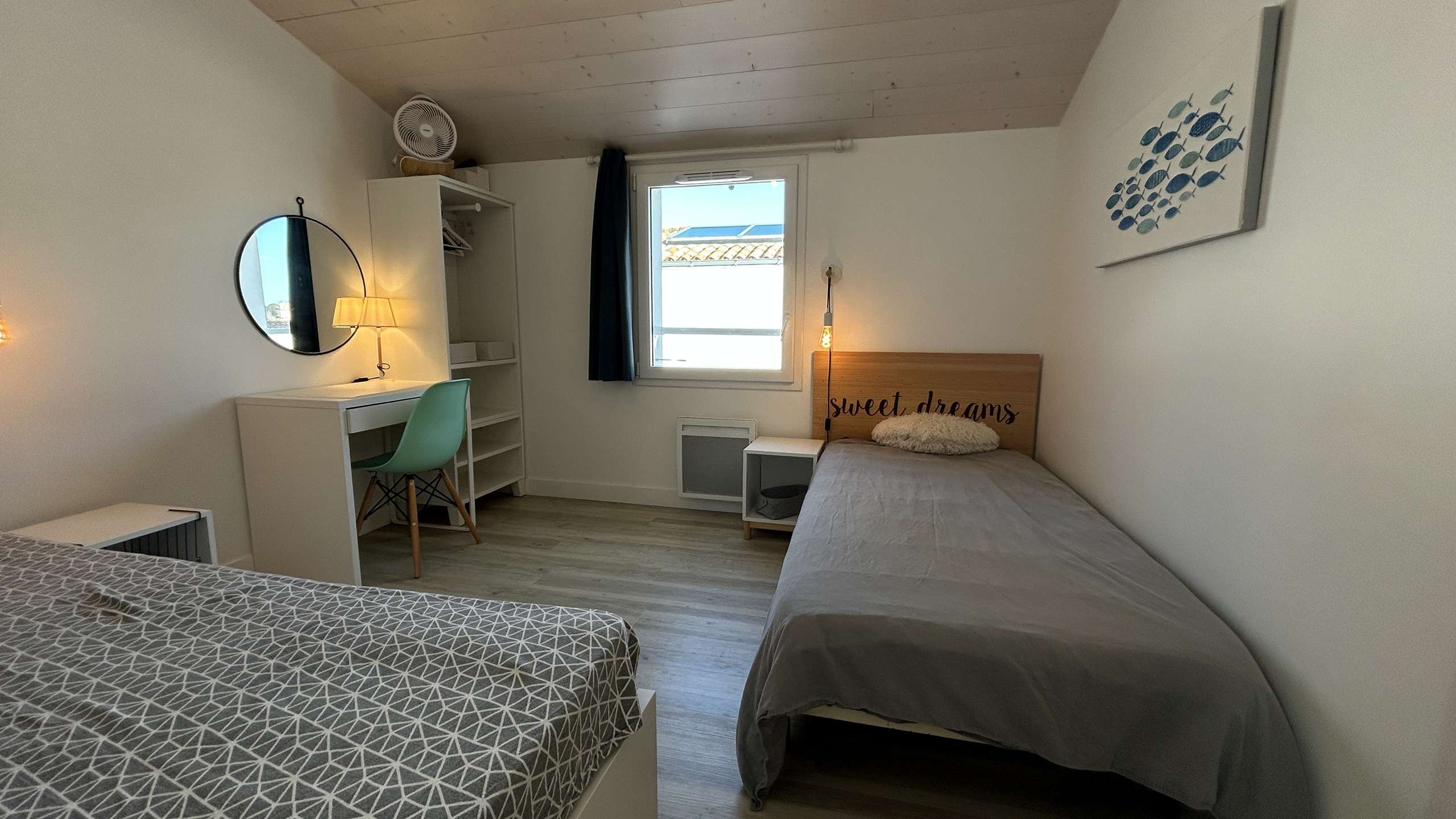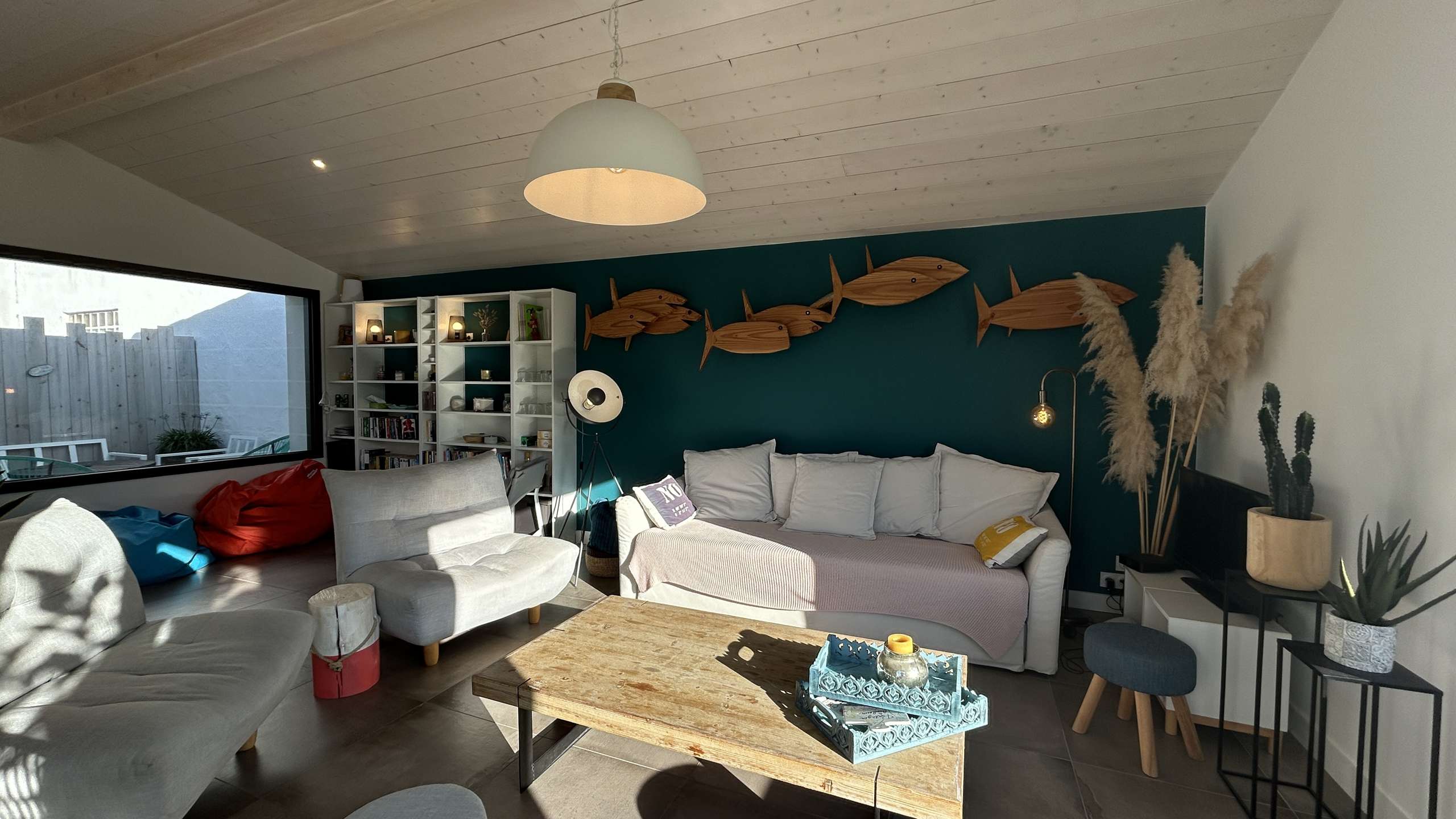 This beautiful holiday home offers all the comforts needed for a pleasant stay by the sea. On the ground floor, you will find an entrance hall, a spacious living room separate from the dining room, a fully equipped open-plan kitchen leading onto the patio, a master bedroom with a king-size bed (180 cm) and an en-suite shower room, a utility room, and a separate WC. Upstairs, the house has two bedrooms: one with two single beds (80 cm) that can be joined to make a queen-size bed (160 cm), and the other with a pull-out bed that can be converted into a queen-size bed (160 cm), as well as a shower room and a WC.