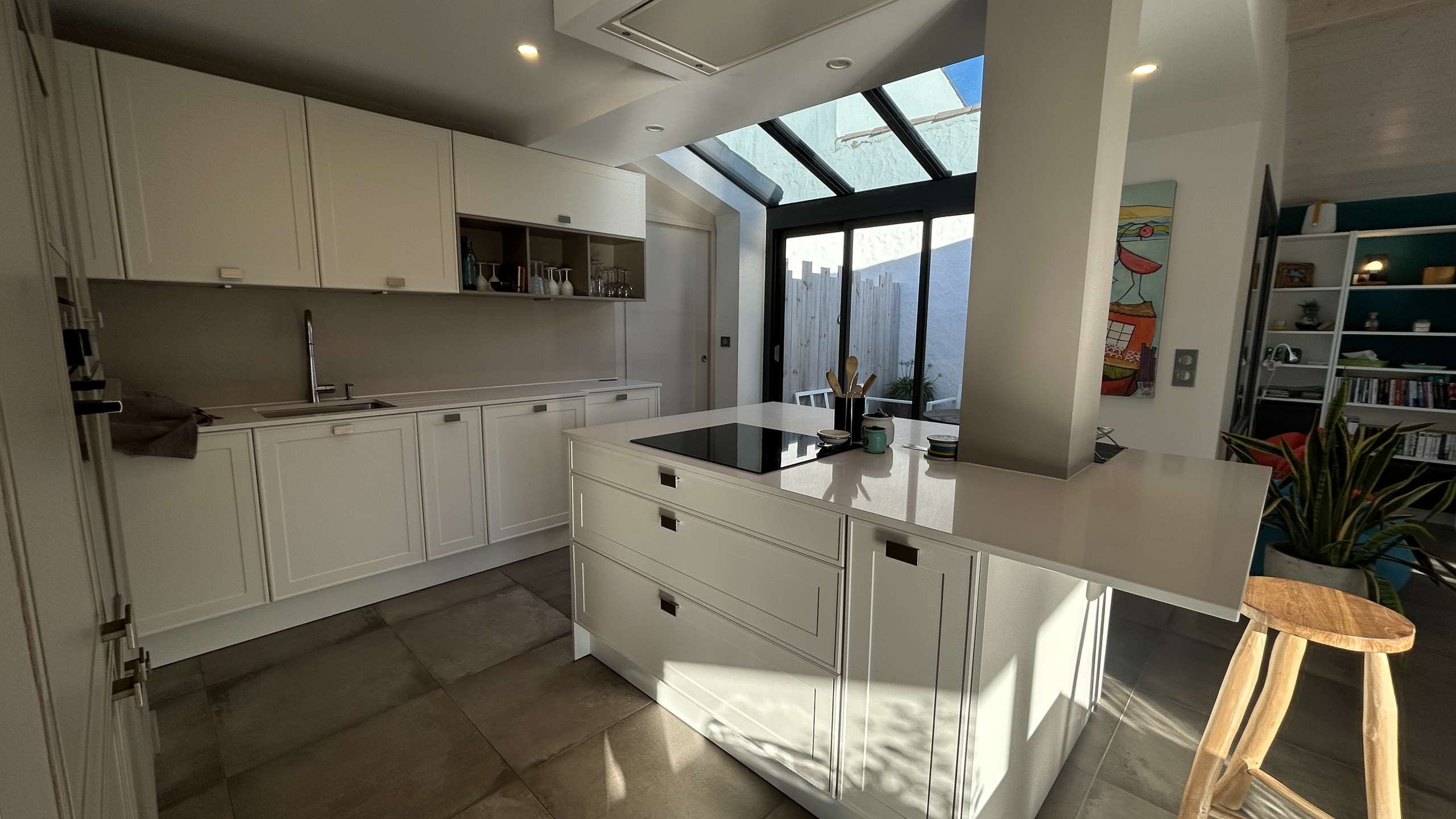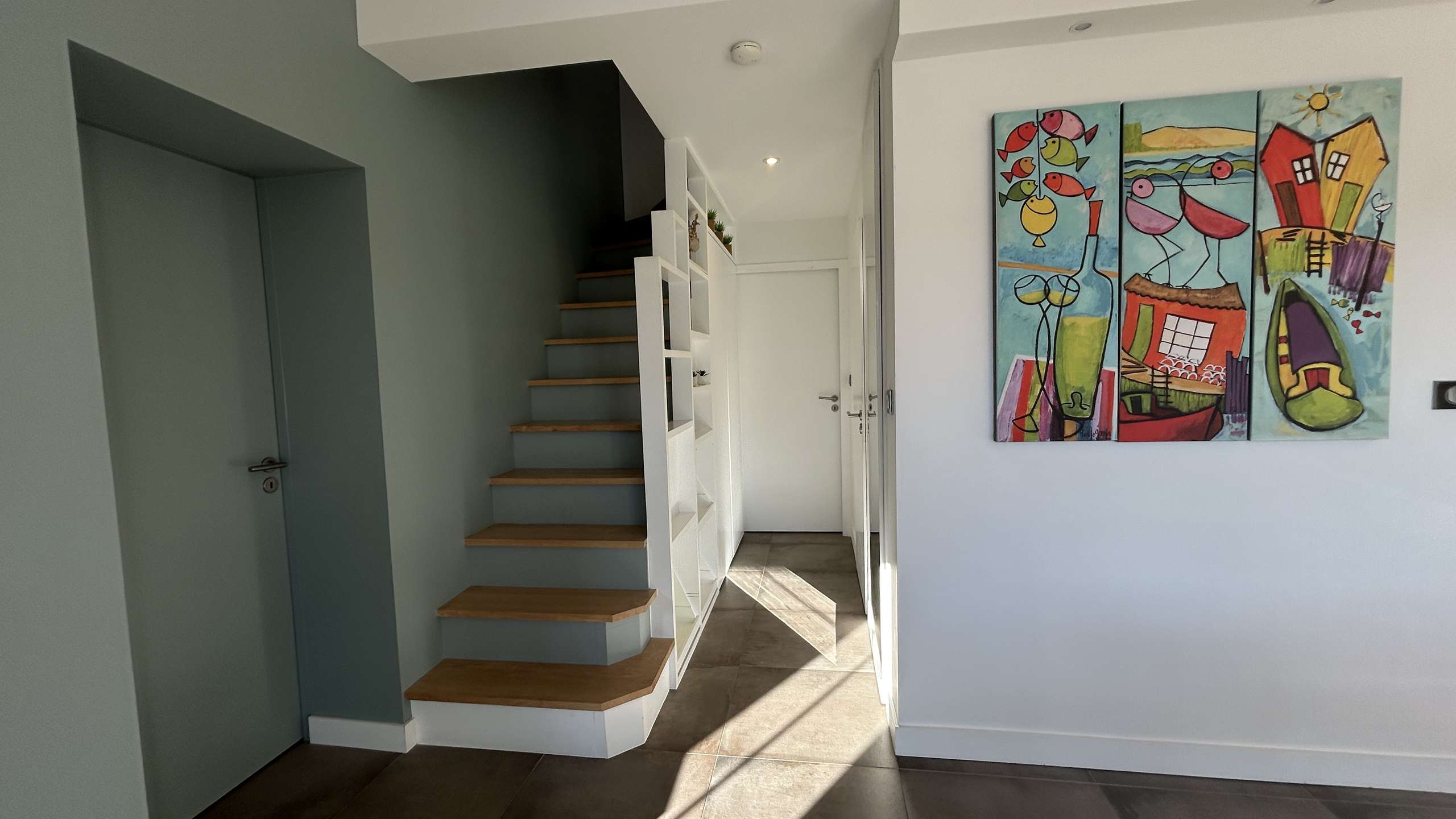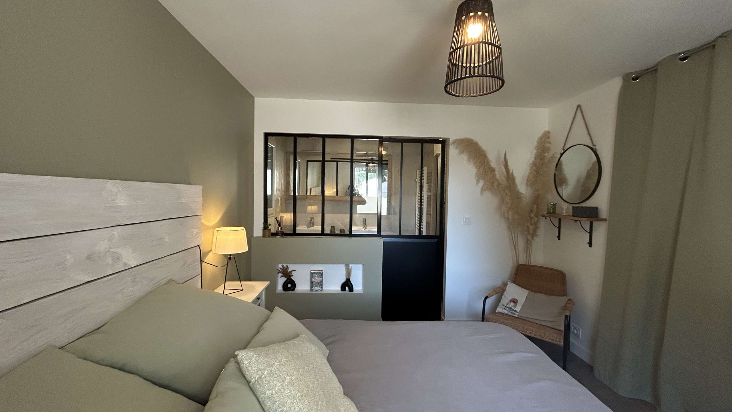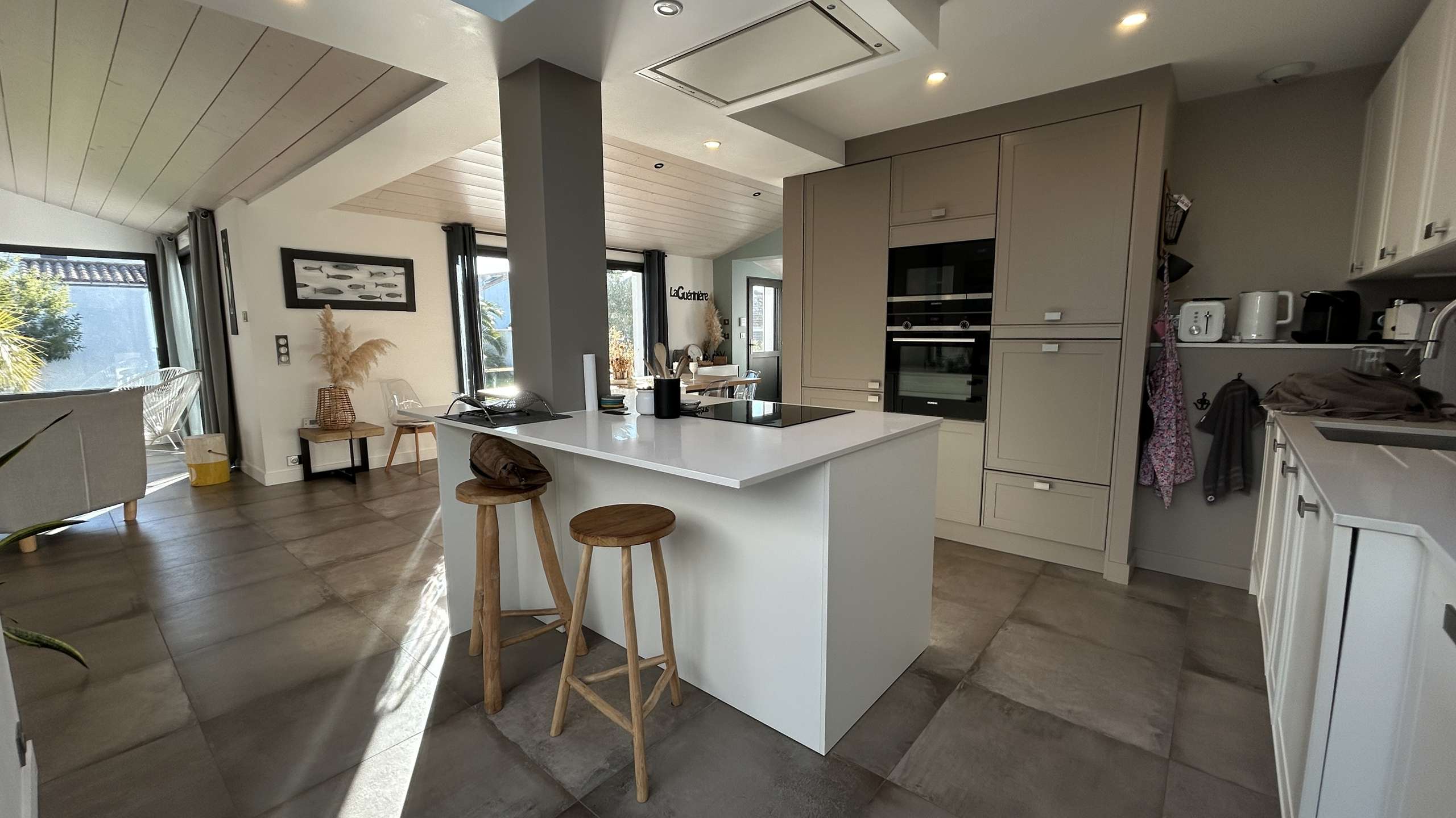 This beautiful holiday home offers all the comforts needed for a pleasant stay by the sea. On the ground floor, you will find an entrance hall, a spacious living room separate from the dining room, a fully equipped open-plan kitchen leading onto the patio, a master bedroom with a king-size bed (180 cm) and an en-suite shower room, a utility room, and a separate WC. Upstairs, the house has two bedrooms: one with two single beds (80 cm) that can be joined to make a queen-size bed (160 cm), and the other with a pull-out bed that can be converted into a queen-size bed (160 cm), as well as a shower room and a WC.