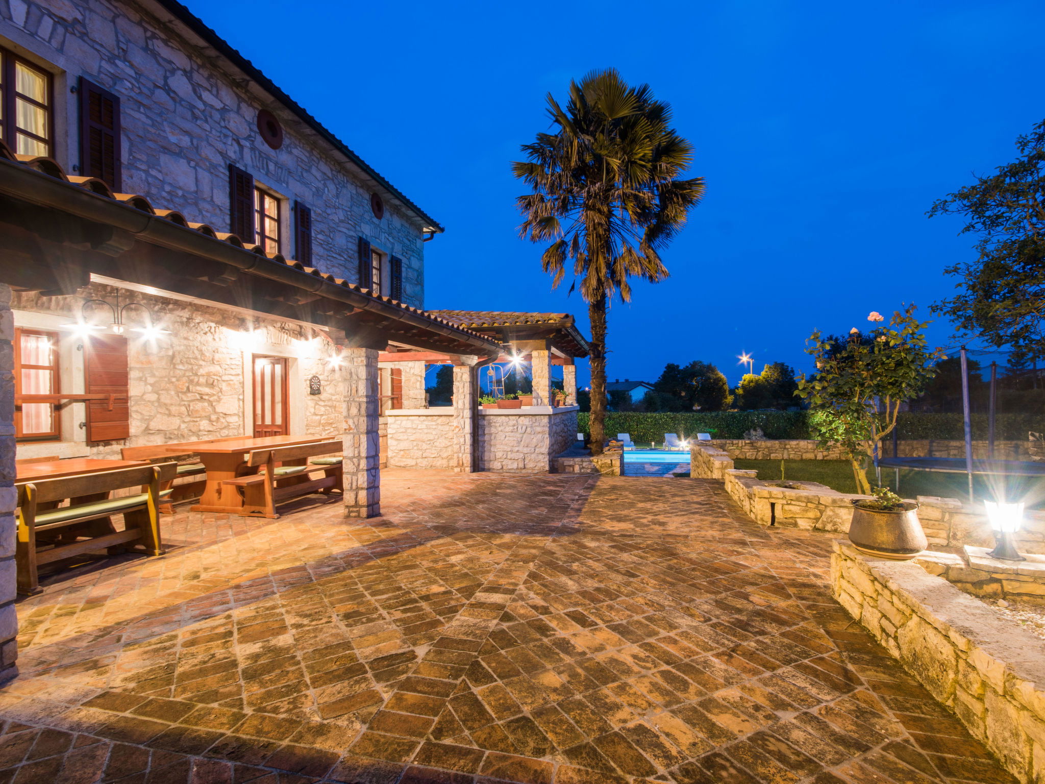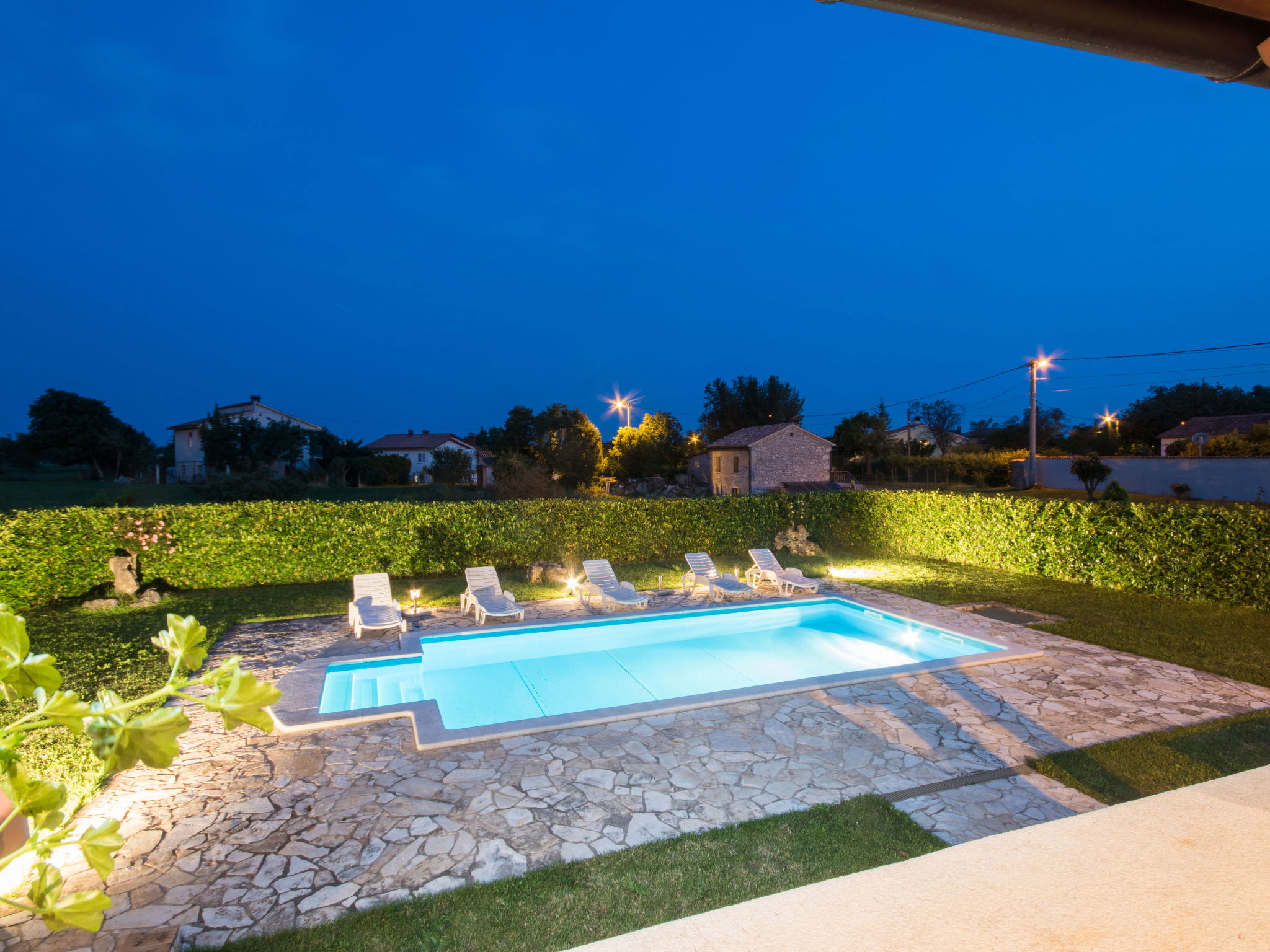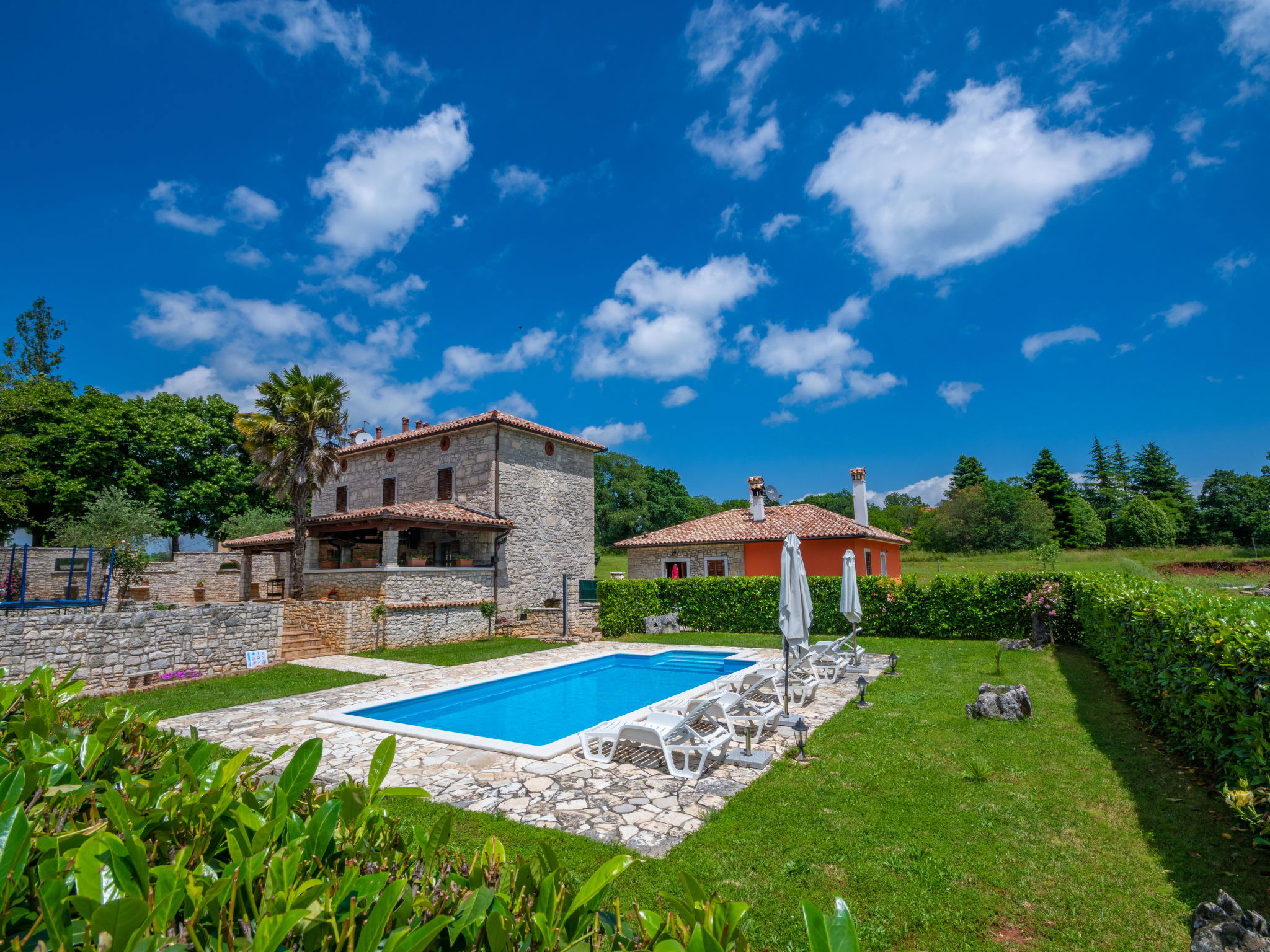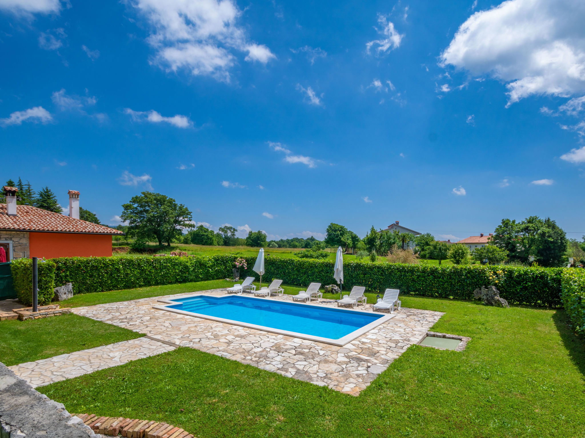 Rustic single-family house "Blašković", 3 storeys. In the hamlet Balarini 9 km from the centre of Labin, 15 km from the centre of Rabac, 15 km from the sea, 15 km from the beach. Private: property 1'200 m2 (fenced), lawn and wildlife garden, swimming pool angular (8 x 4 m, depth 140 cm, seasonal availability: 01.Apr. - 30.Oct.) with internal staircase. Outdoor shower, terrace (70 m2), barbecue, pool maintenance by the owner/gardener. In the house: internet access, washing machine. Parking (for 4 cars) at the house on the premises. Shop 6 km, supermarket 9 km, restaurant 6 km, bus stop "Labin" 9 km, pebble beach 15 km. Please note: airfield 45 km from the property.