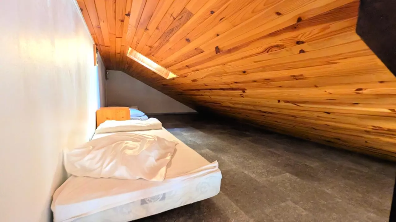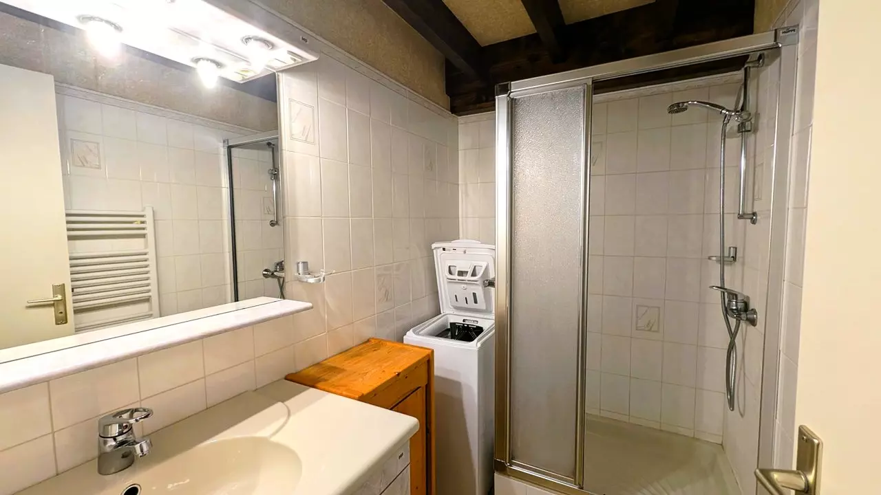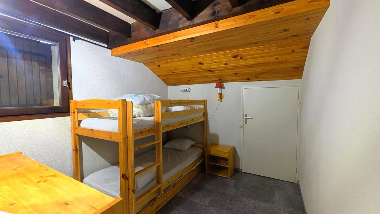 In the Les Carlines residence, Apartment No. 10, a pleasant two-bedroom apartment with a balcony offering mountain views. The apartment features an entrance hall, a living room with a TV, a fully equipped kitchen (filter coffee maker, toaster, microwave, dishwasher, ceramic hob, kettle, etc.), a bedroom with a double bed (140/190 cm), a bedroom with a bunk bed (2 x 90/200 cm) and a pull-out bed (90/200 cm), a mezzanine with two single beds (2 x 90/200 cm), a shower room with a washing machine, a balcony, and a ski locker.