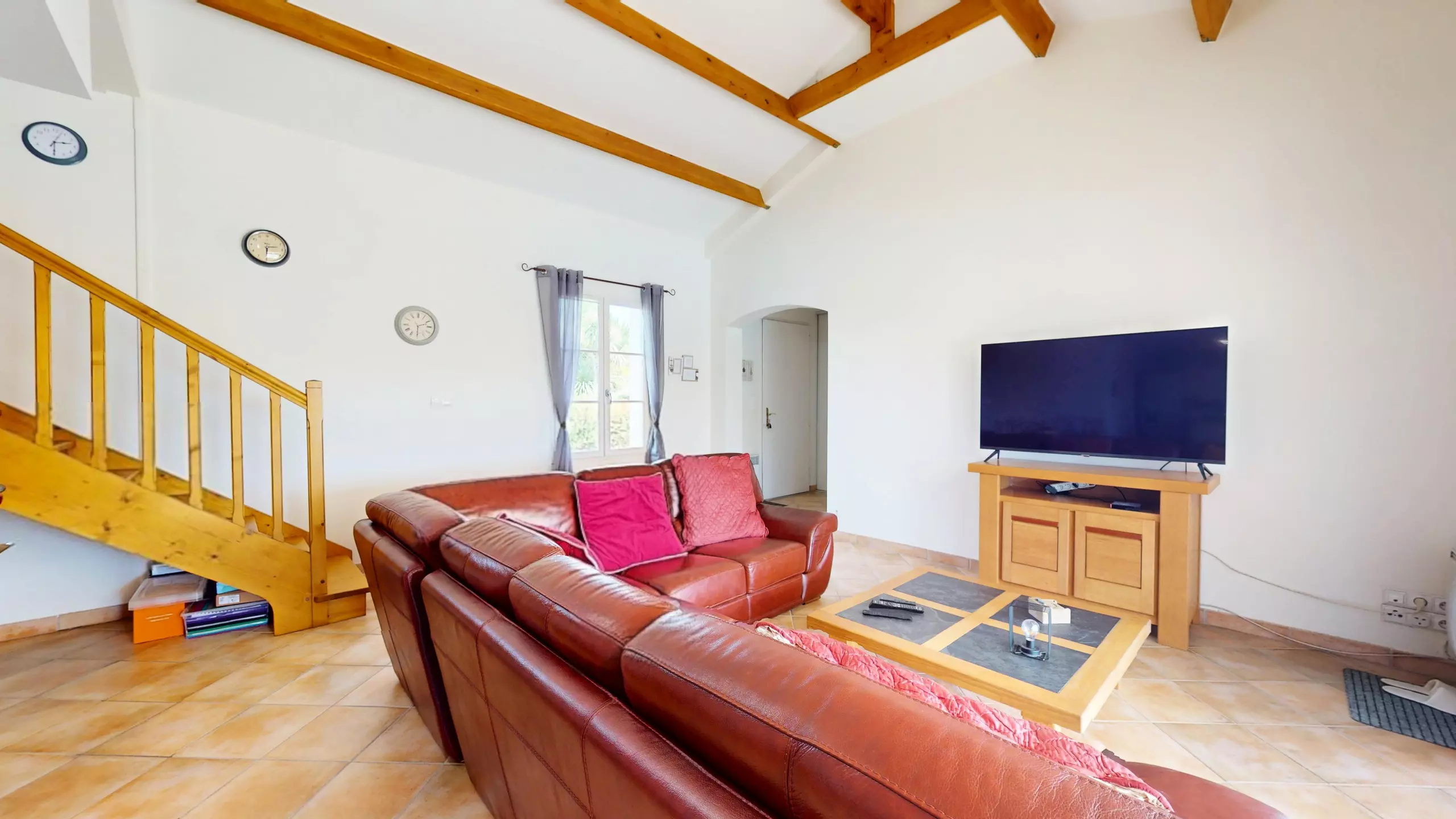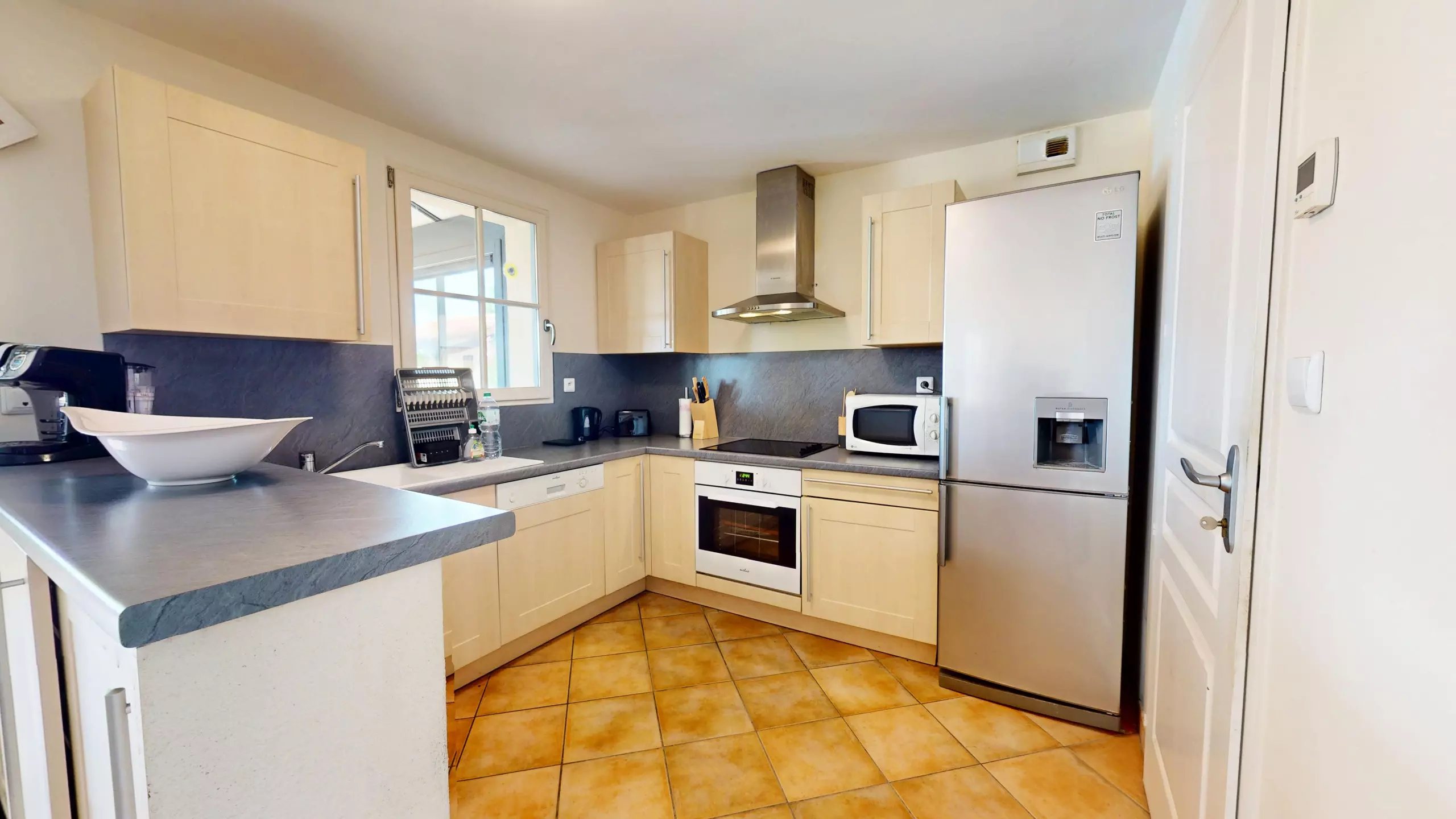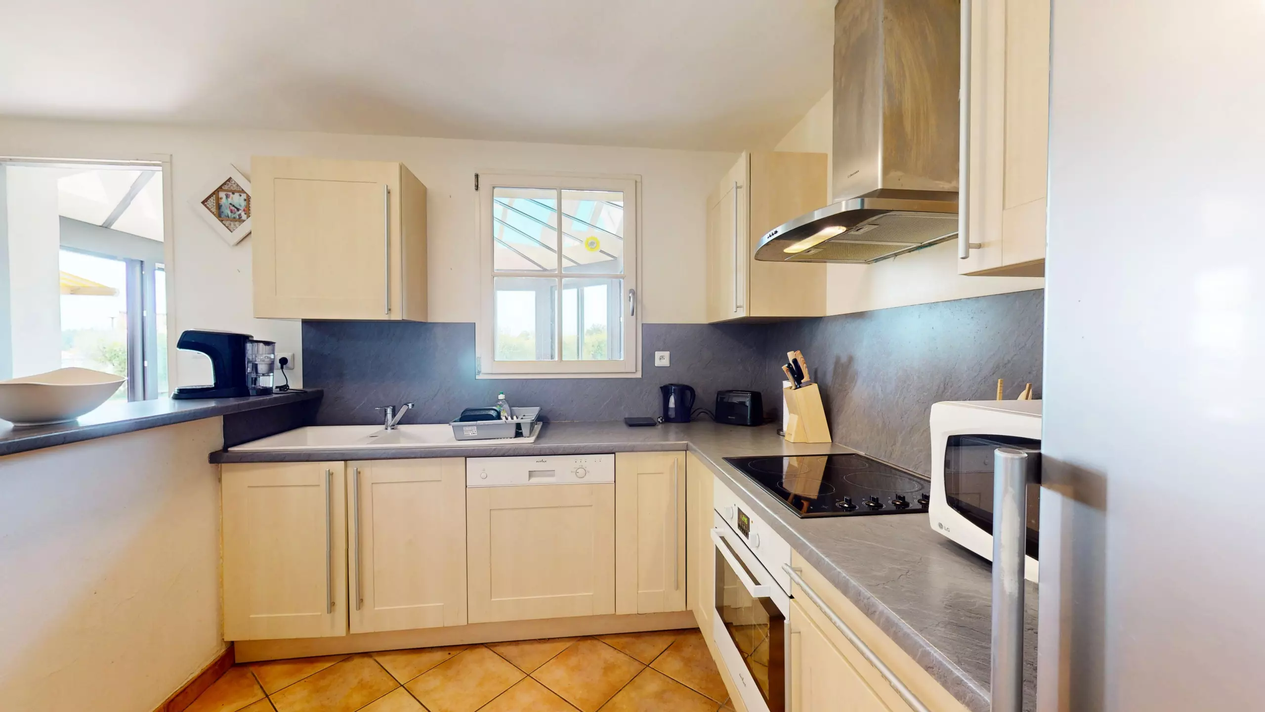 The spacious and bright living room offers stunning views of the pool and garden. It's the perfect place to unwind after a day of sightseeing or relaxing by the pool. A television is also provided for cozy evenings. The open-plan kitchen is fully equipped with everything you need to prepare meals, allowing you to enjoy home-cooked dishes in a modern and functional setting.
