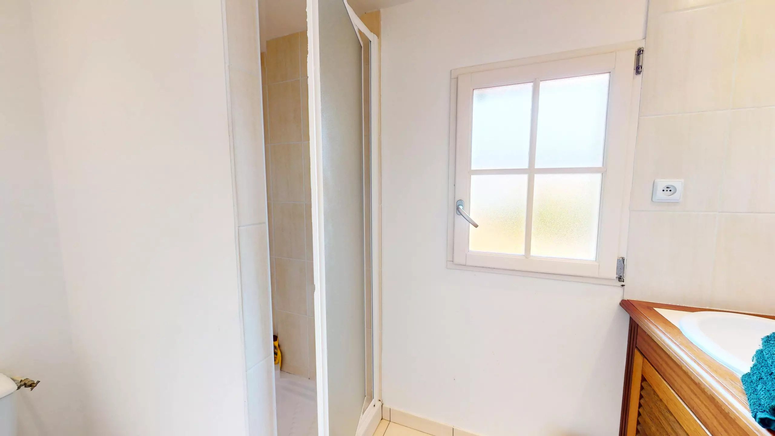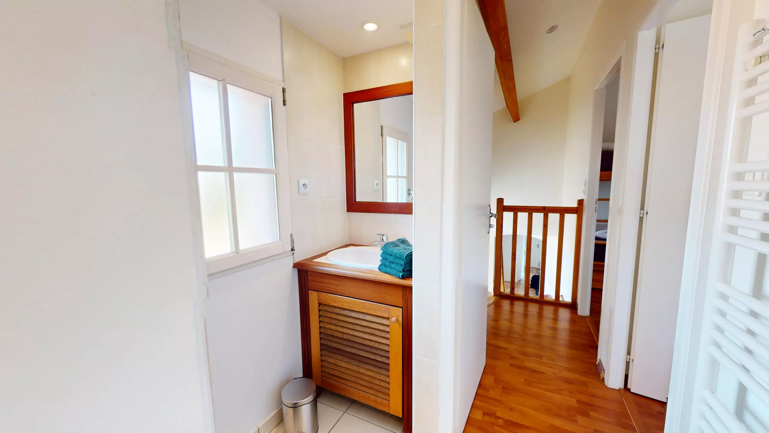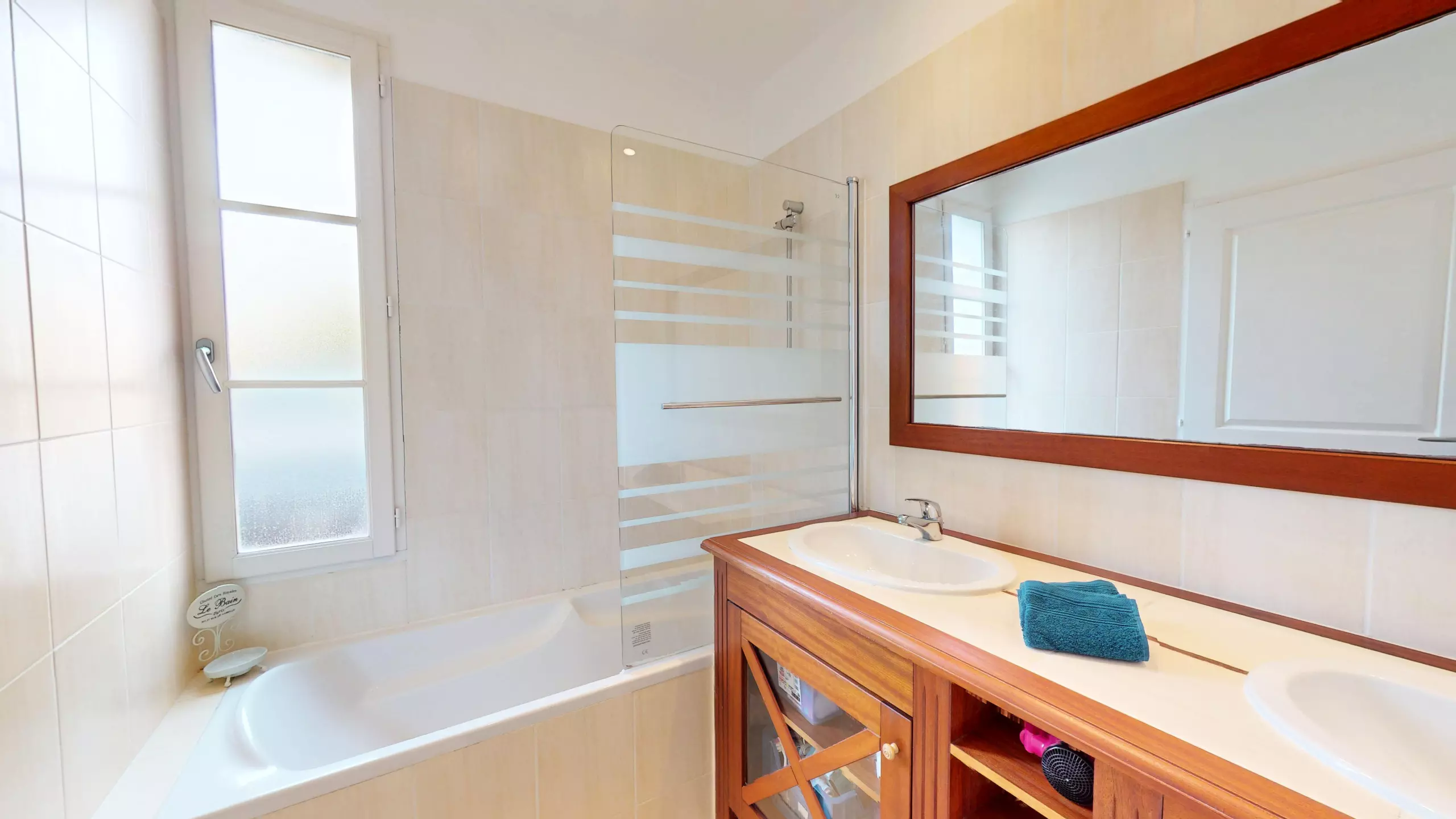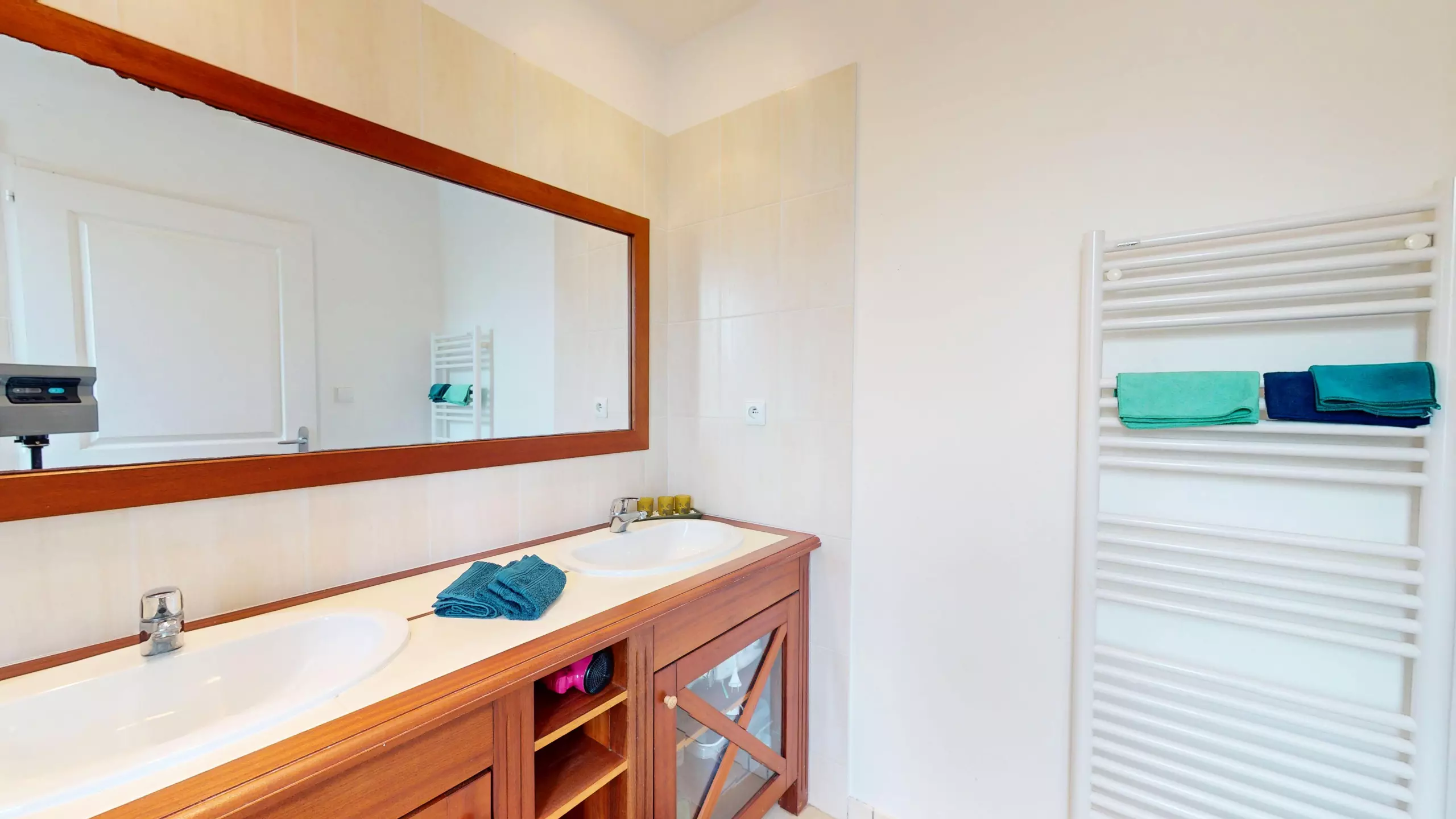 The villa has two bathrooms: one on the ground floor, equipped with a bathtub, two sinks and practical storage, and the other upstairs, with a shower, a sink and a toilet.
