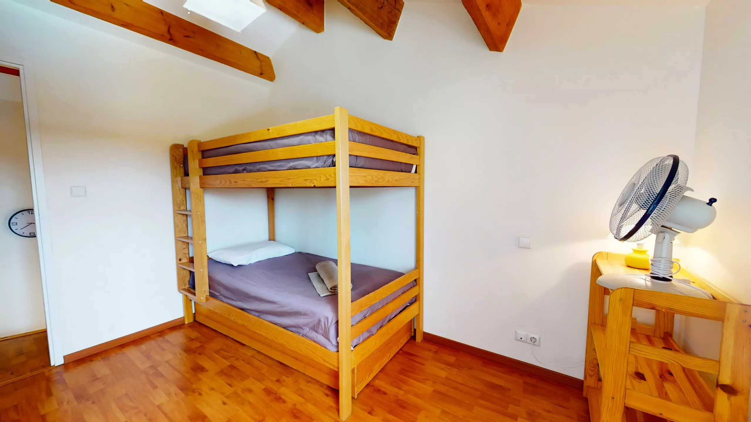 On the ground floor, you'll find two bedrooms: one with a double bed (140x190cm), ideal for a restful sleep, and the other with two single beds (90x190cm), perfect for children or friends. Upstairs, there are two more bedrooms: one with a double bed (140x190cm) and the other with a bunk bed (two single beds 90x190cm), offering a comfortable and practical space for younger children or a group of friends.