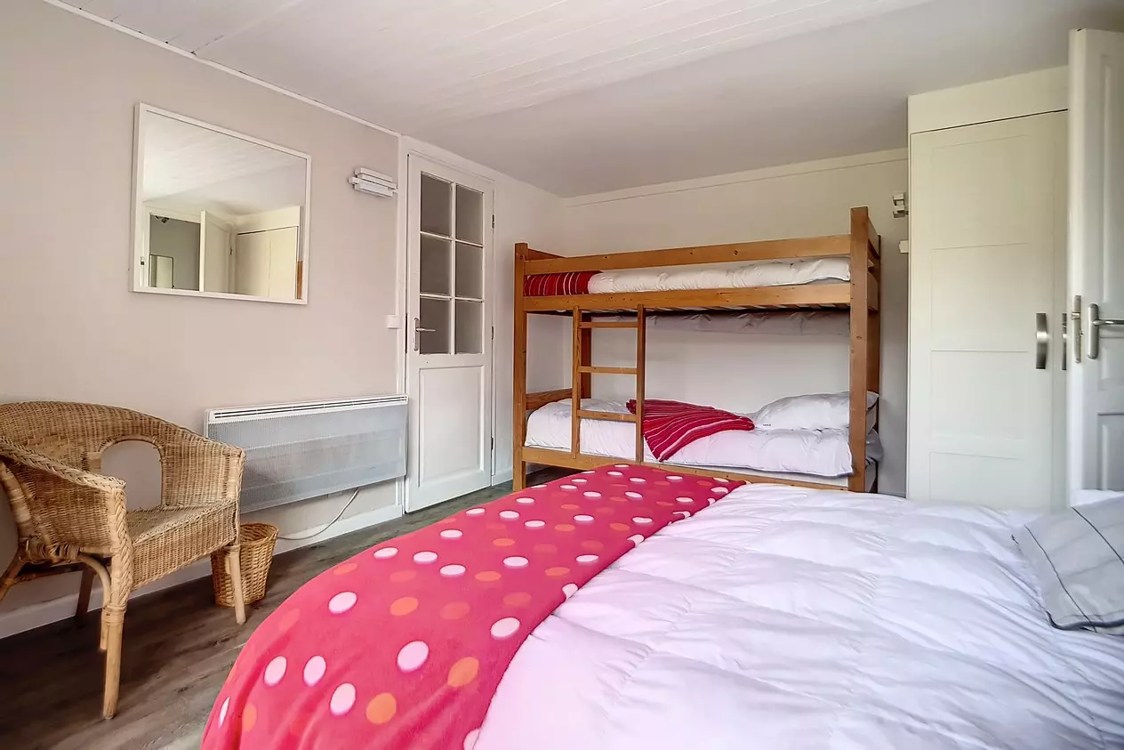Bedroom 1 (downstairs): 2 single bunk beds and 1 double bed with a small balcony