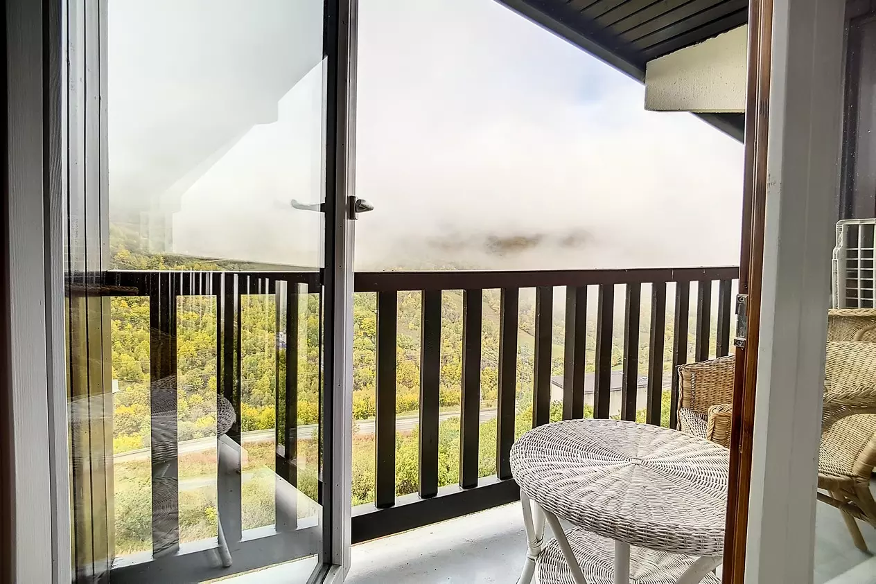 Living area with small balcony and mountain view. Equipped with a television and DVD player.