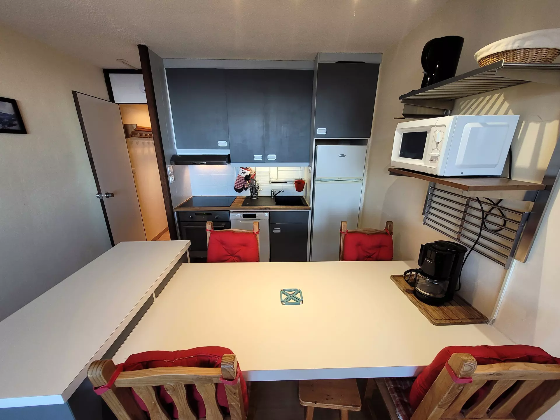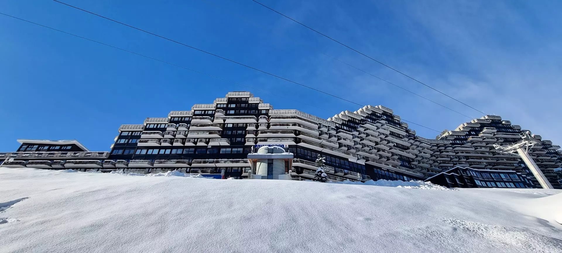 The apartment is located on level "Q" of the Paquebot des Neiges building and is accessible via the "DIAMANT" elevator. It comprises a living room, a separate kitchen, a bedroom, and a bathroom with a toilet. Its north-facing balcony offers a lovely view of Mont Blanc.