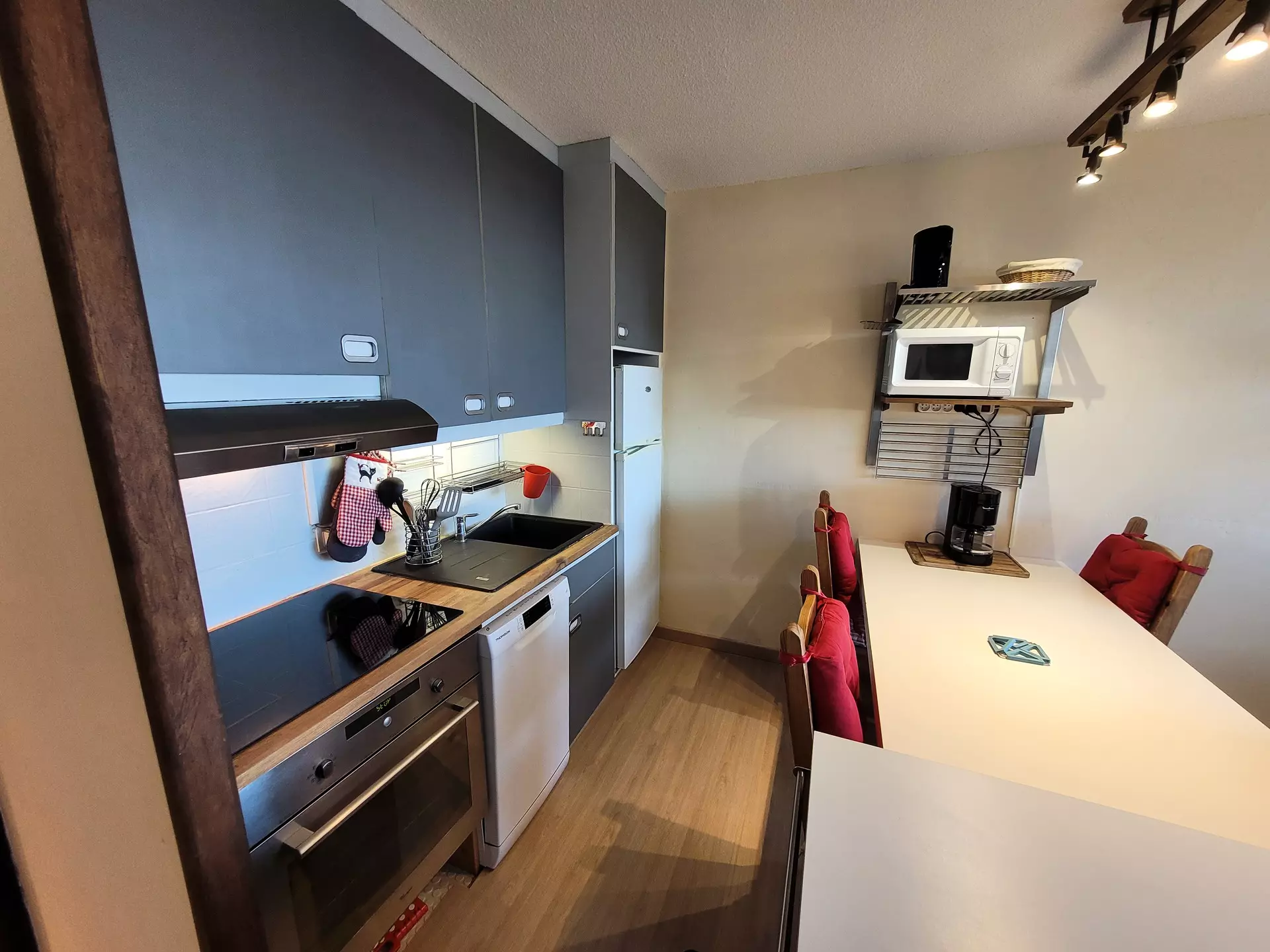 The kitchen, located at the entrance of the apartment, is equipped with an oven, a microwave, induction hobs, a small refrigerator and a dishwasher.