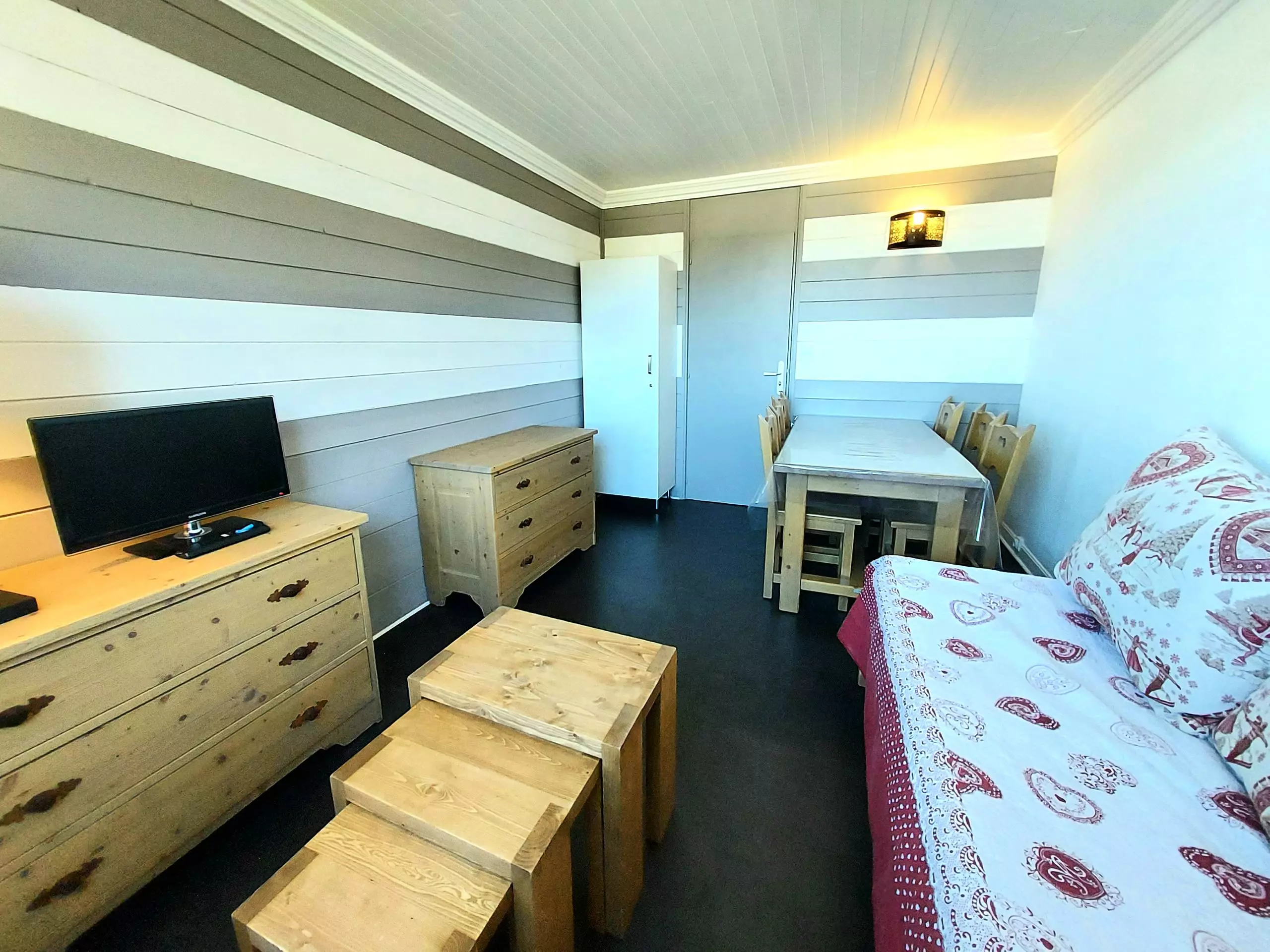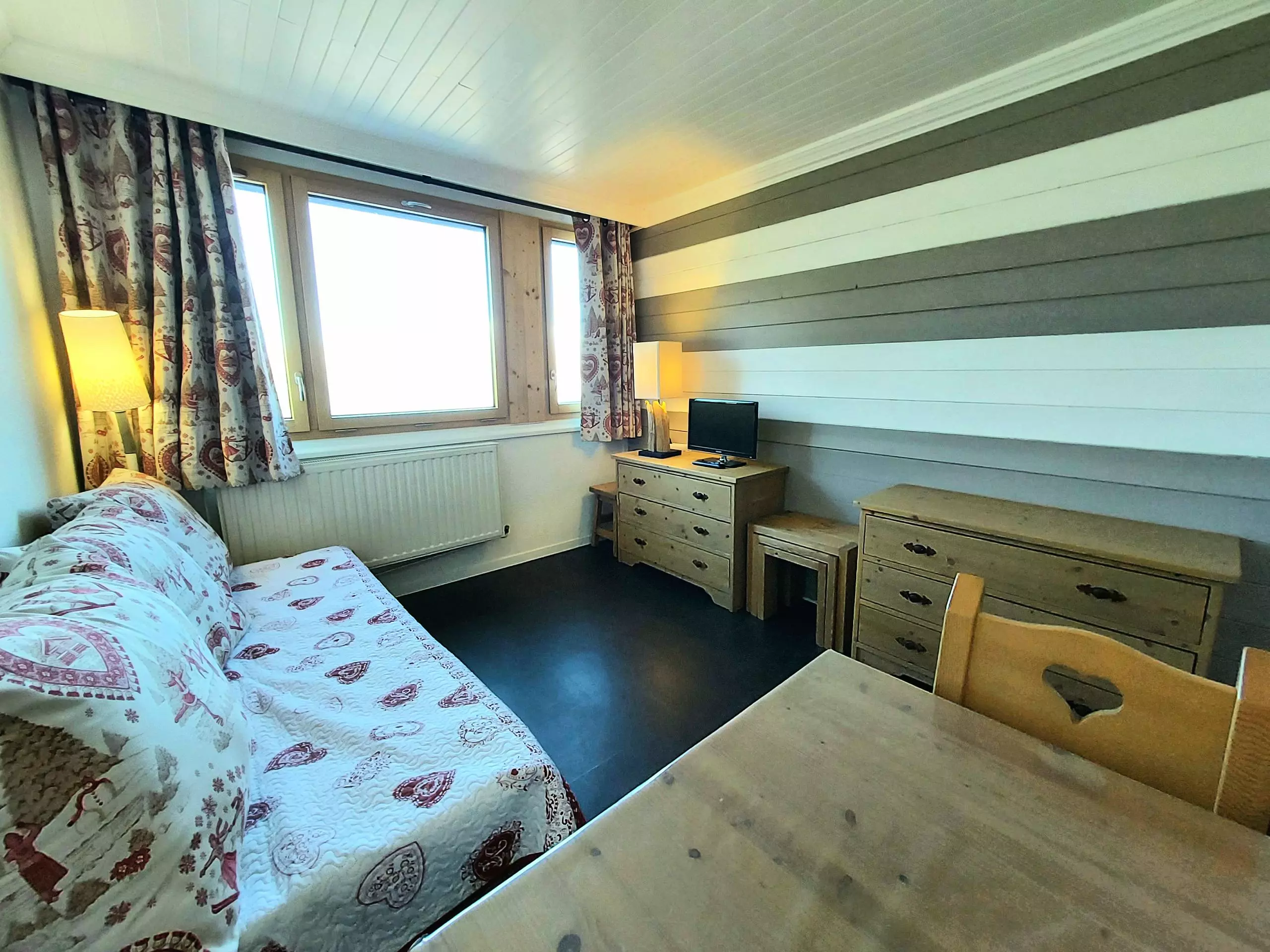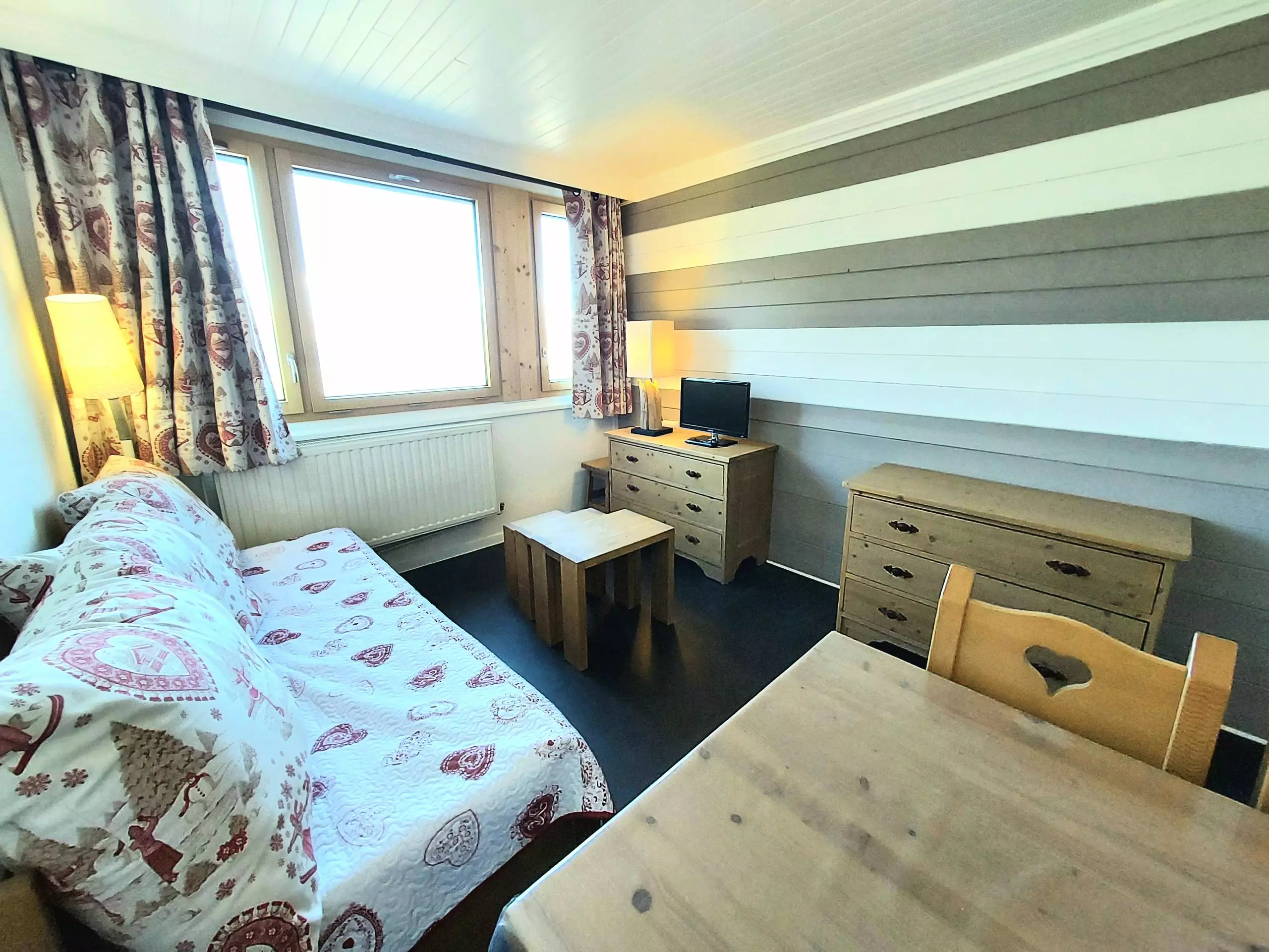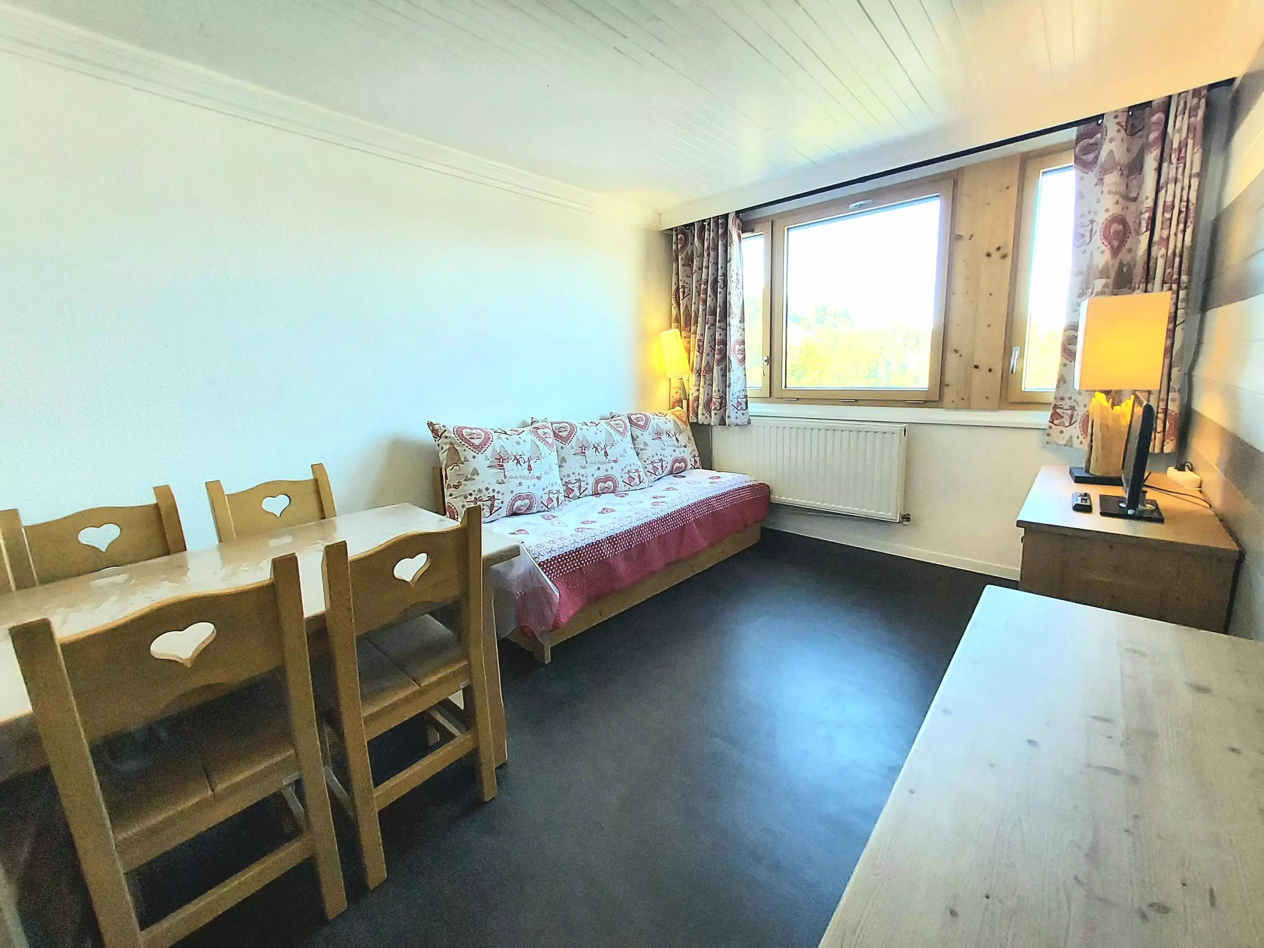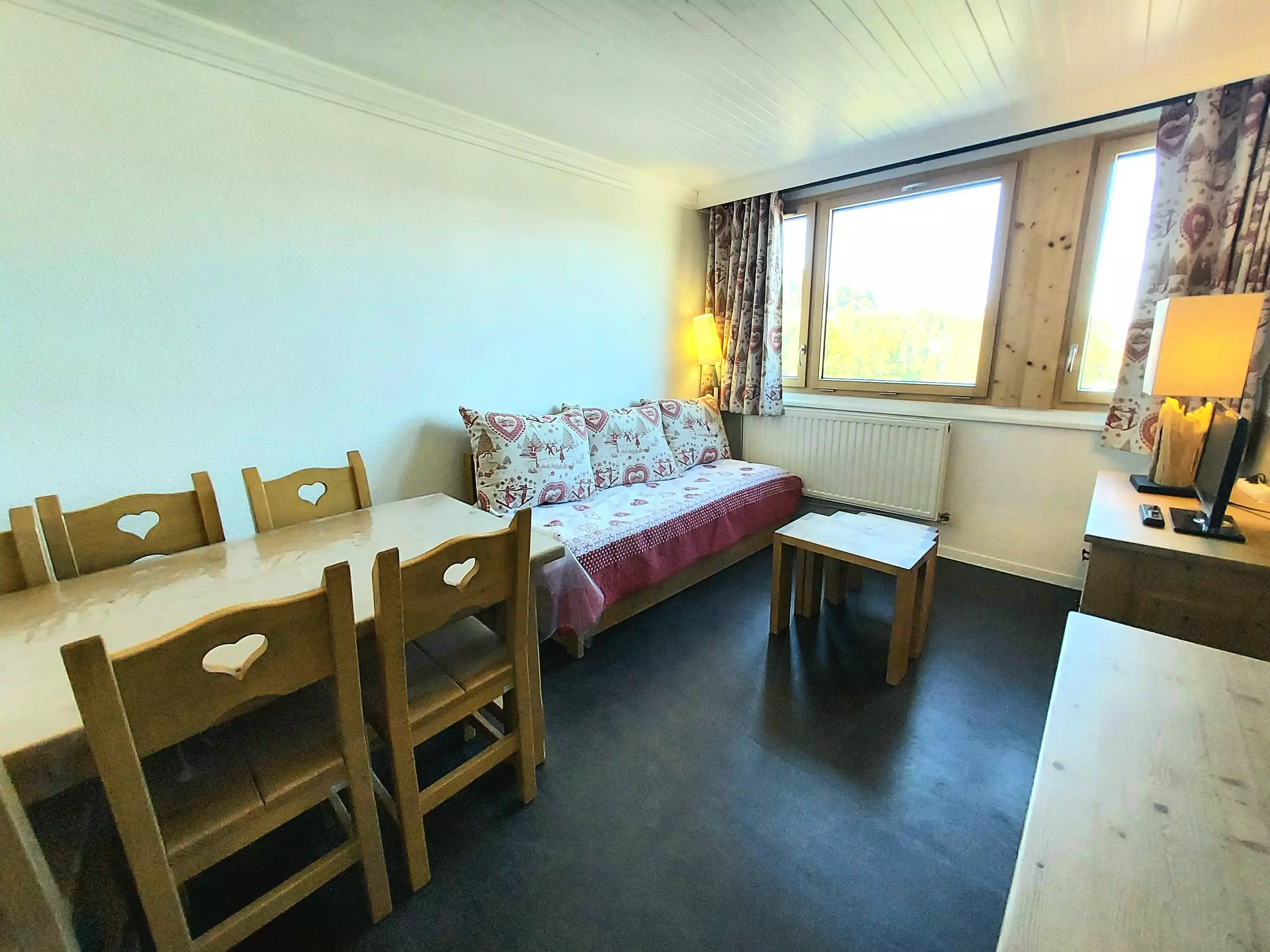 - Living room with television, a single bed, a pull-out bed and dining area.