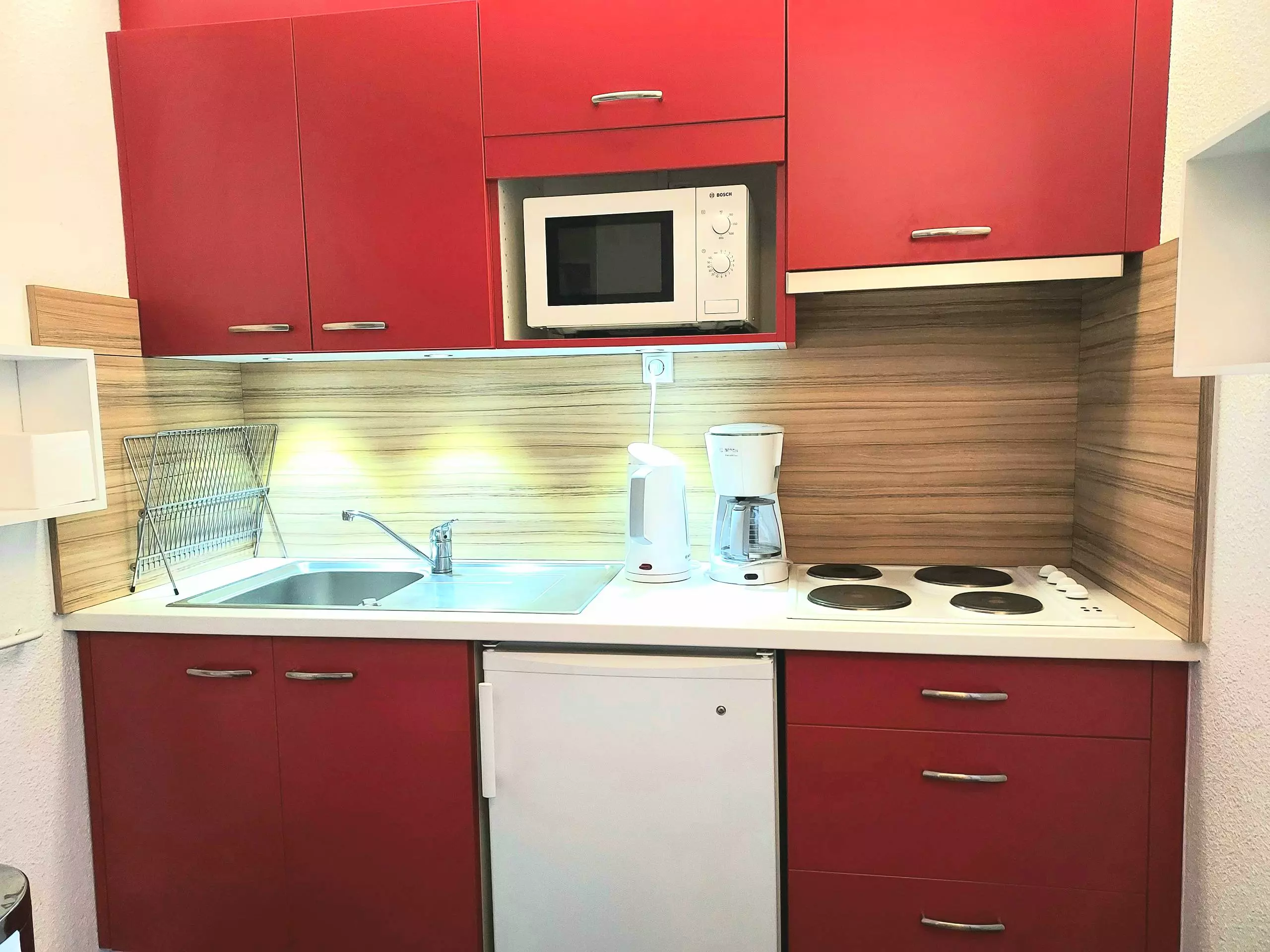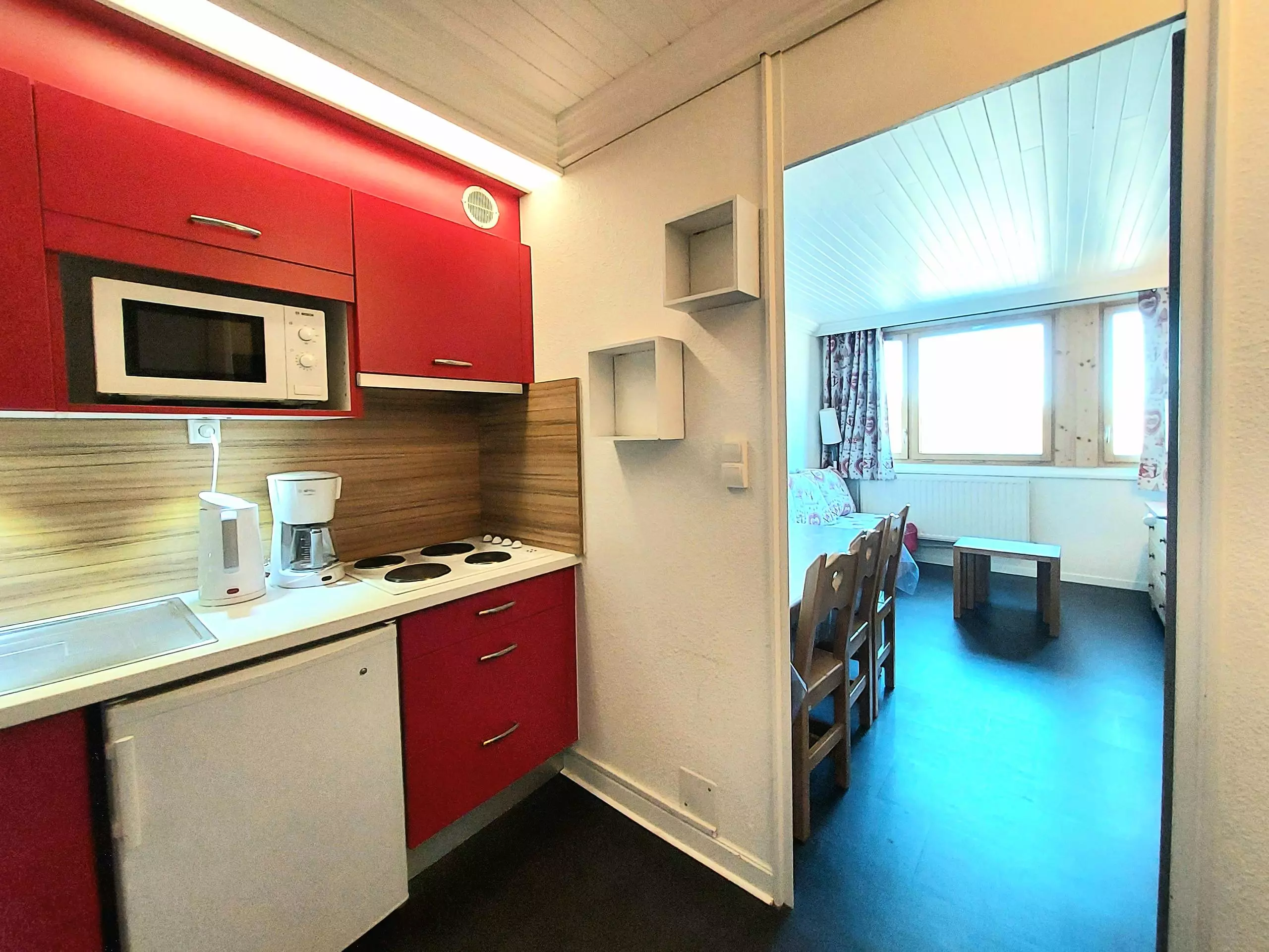 - Separate kitchen with refrigerator, large storage cupboard, electric hobs, microwave, Airfryer.