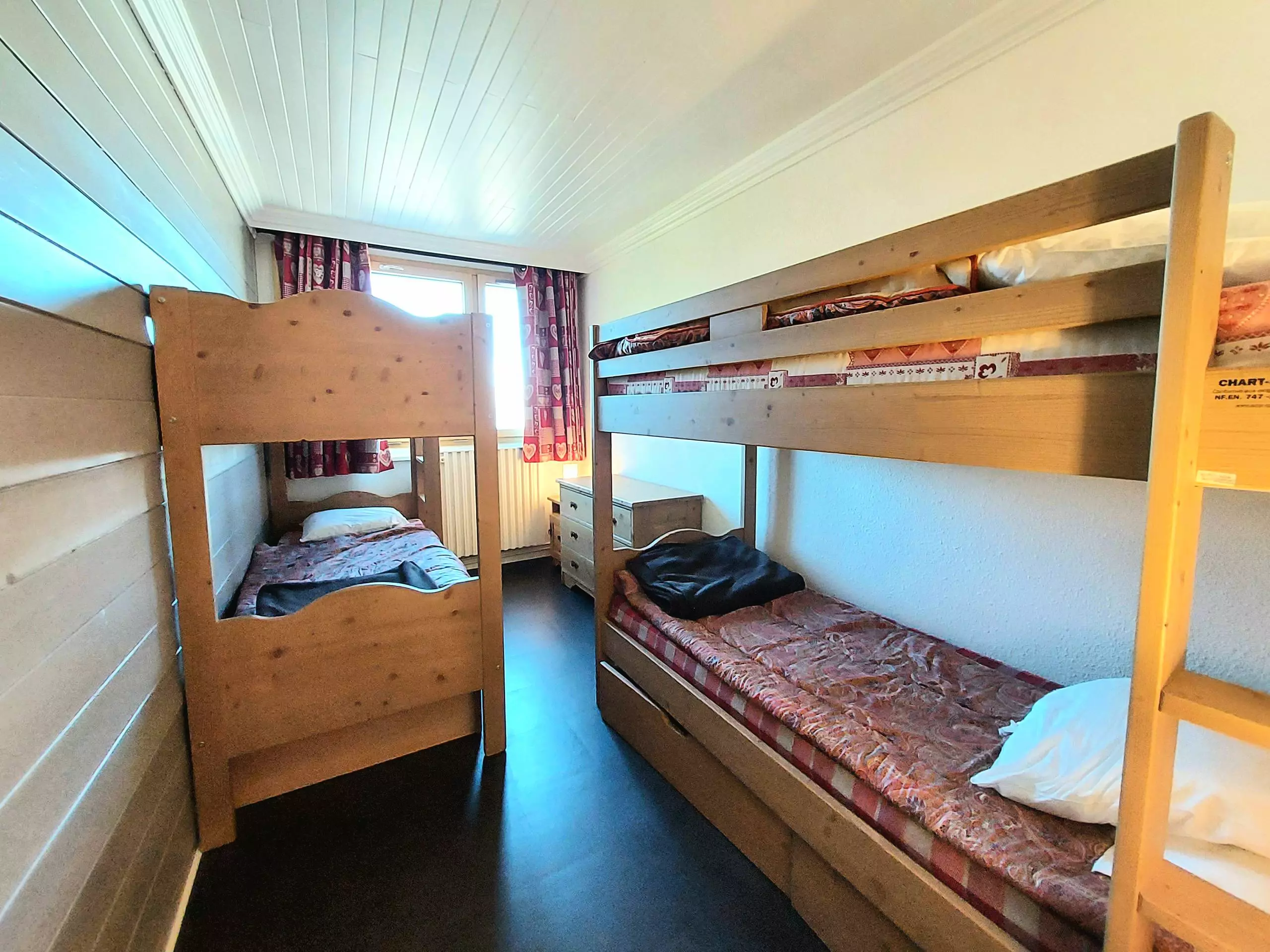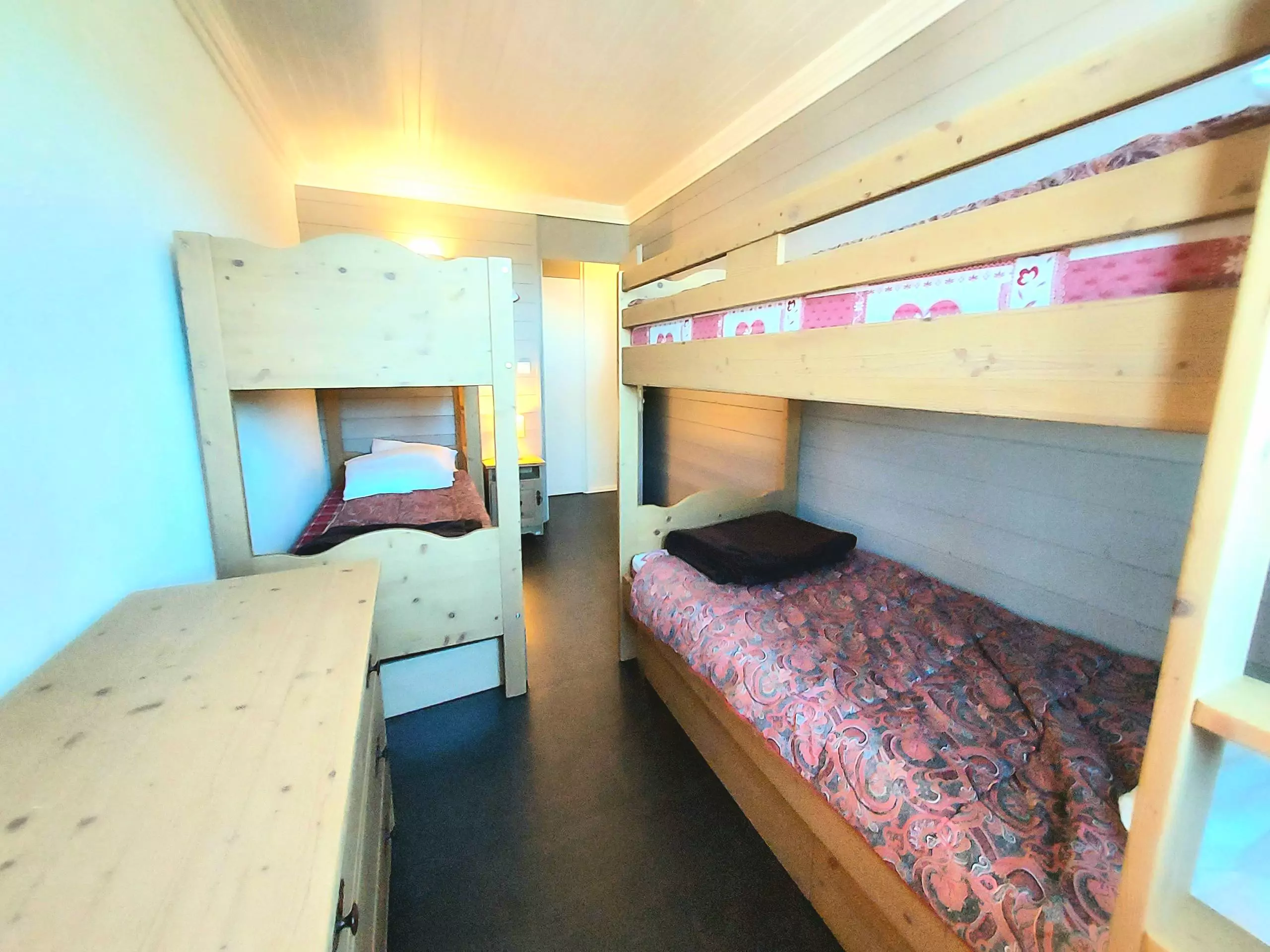 - Room with two bunk beds, storage under the bed.