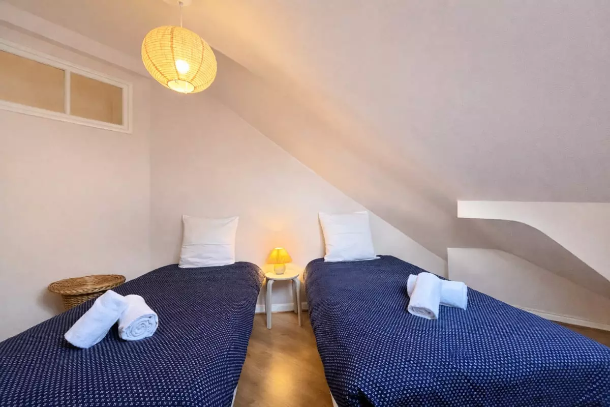 - The apartment has two bedrooms, each furnished with practical storage for a comfortable stay. The bedroom has a double bed (160x200), ideal for a couple, while the second offers two single beds (90x200), perfect for accommodating children or friends.