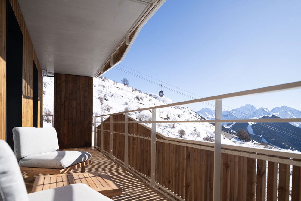 -Living room opening onto a furnished south-facing terrace with exceptional views of the Oisans mountains