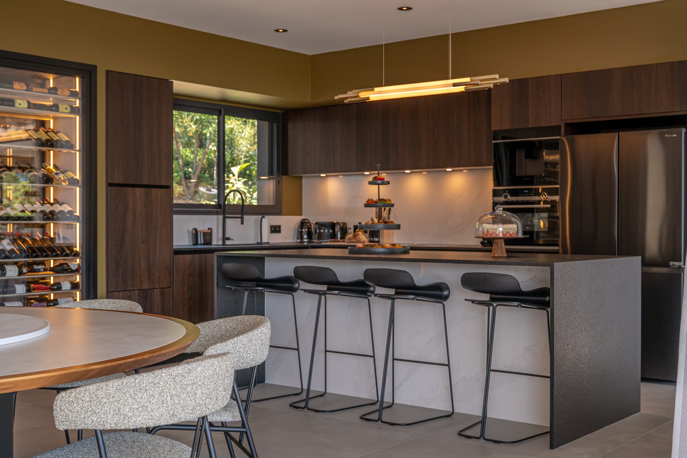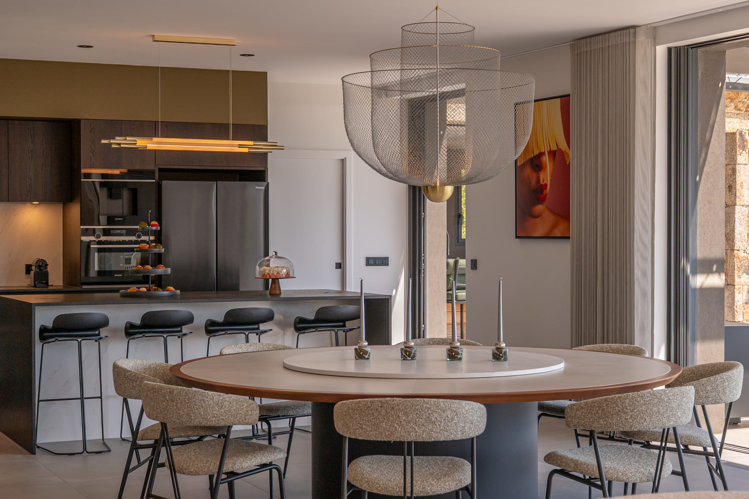 The open interior kitchen offers a modern and refined space with high-end appliances, including, a BORA hob, an oven and a dishwasher in height, as well as an American refrigerator, a thermomix, a cold room and a freezer. An ice maker and built-in Nespresso and Siemens coffee machines complete this set, while an adjoining pantry ensures convenient and organized storage.