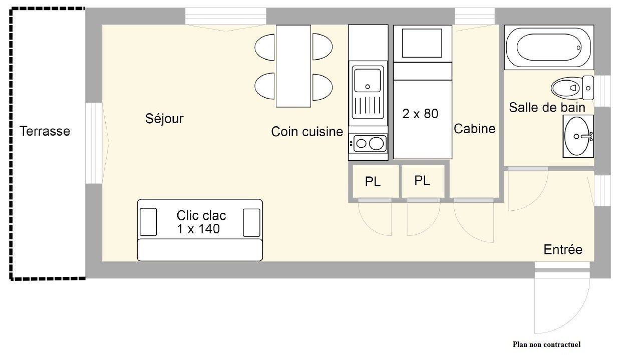 This 25m² holiday apartment on the ground floor comprises a living room with a sofa bed for 2 people, an open-plan kitchen, a cabin with two bunk beds (NB: children under 6 are not allowed to sleep in the top bunk), a bathroom with WC and a terrace.
