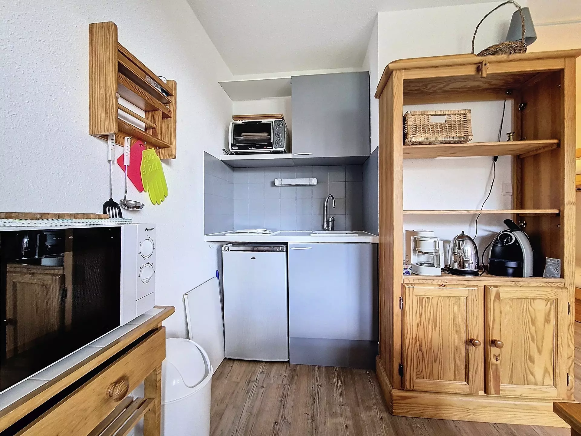 Kitchen equipped with 2 electric hobs, mini oven, refrigerator, kettle, classic coffee maker, Nespresso coffee maker and toaster.