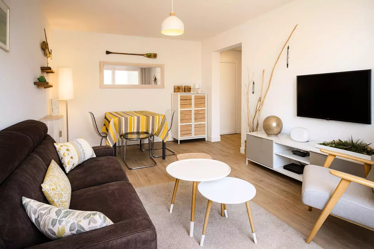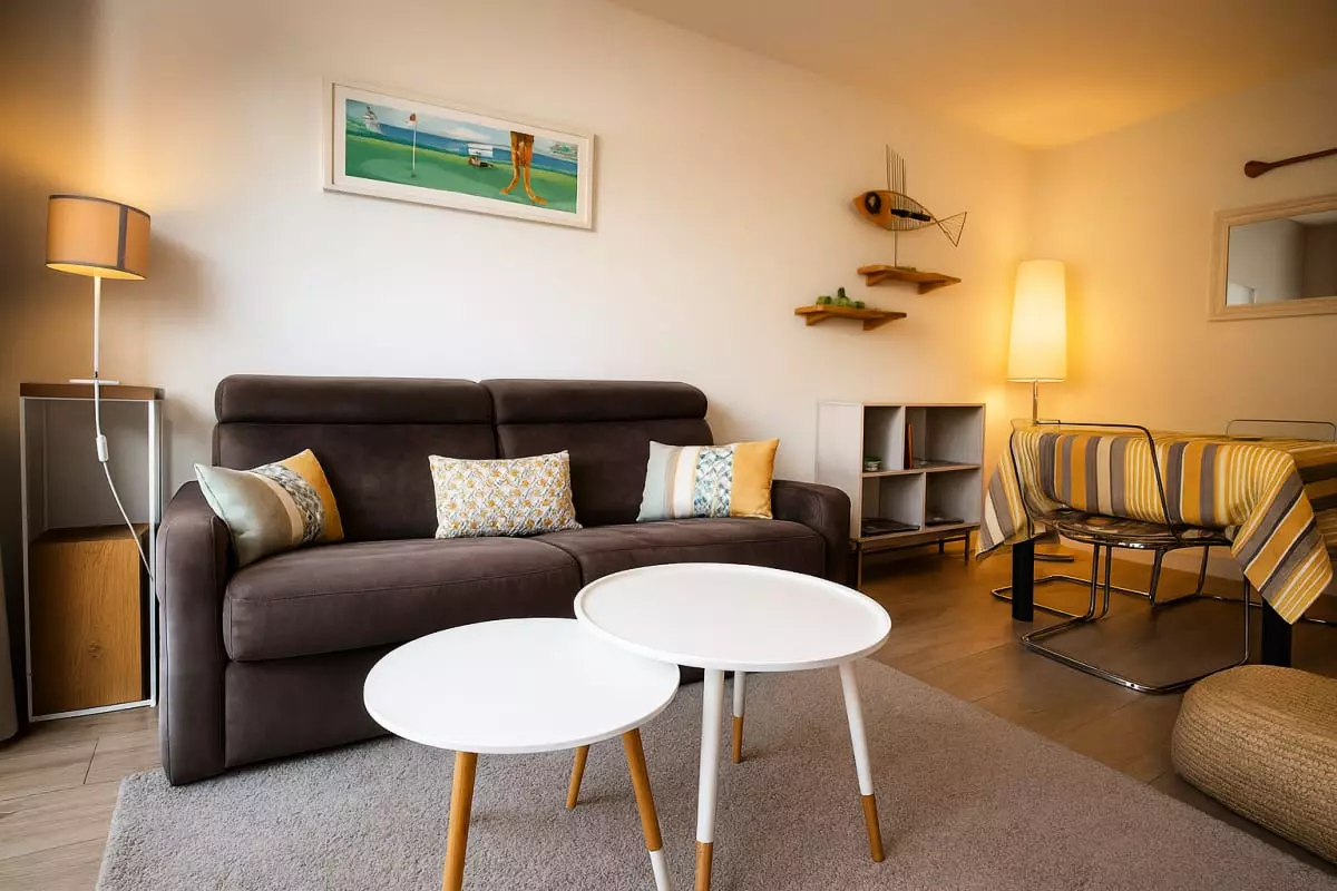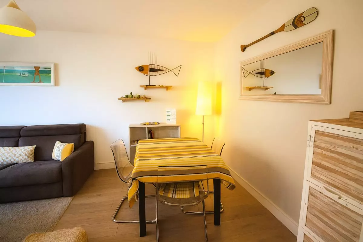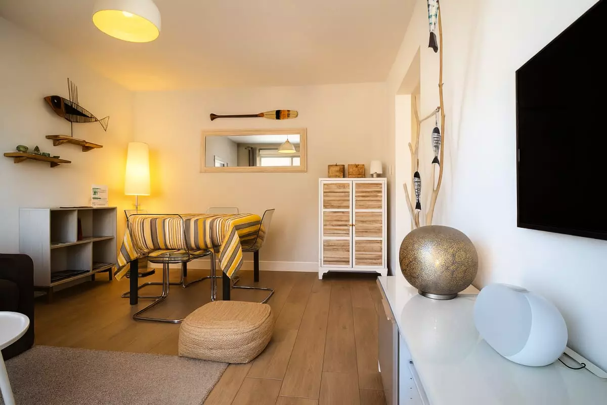 The bright and welcoming living room features a lounge area with a comfortable sofa and a dining area. The bright and fully equipped kitchen (refrigerator, dishwasher, washing machine, Nespresso machine, combination microwave, cooktop) allows you to cook just like at home.