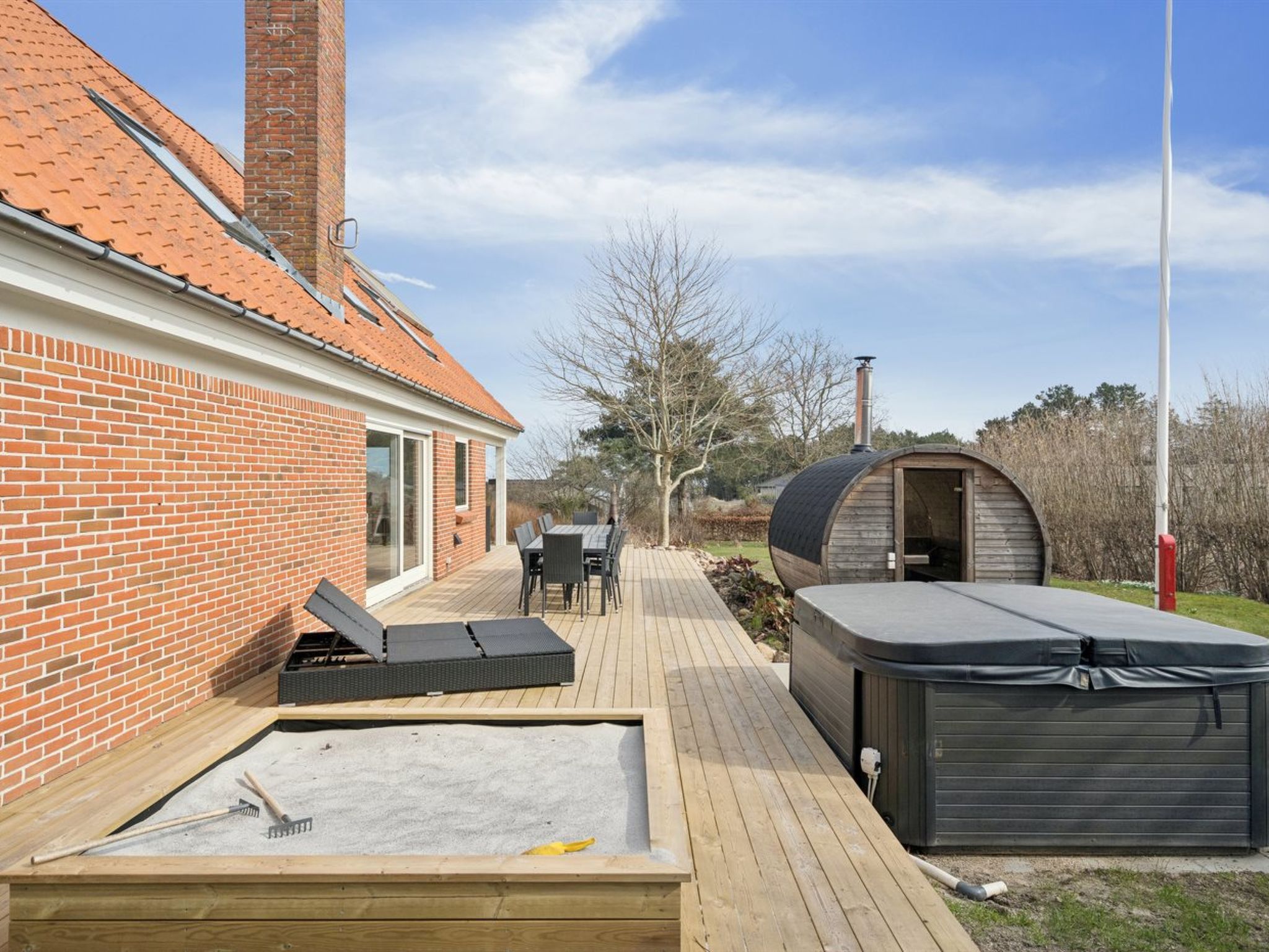 Single-family house, built in 1989. 2 km from the sea. For shared use: garden. Private: natural state property 1'250 m2, garden (fenced). Barbecue, children's playground. In the house: table football, washing machine, tumble dryer. Parking at the house. Grocery 1 km. Golf course 3 km. The owner does not accept any youth groups.