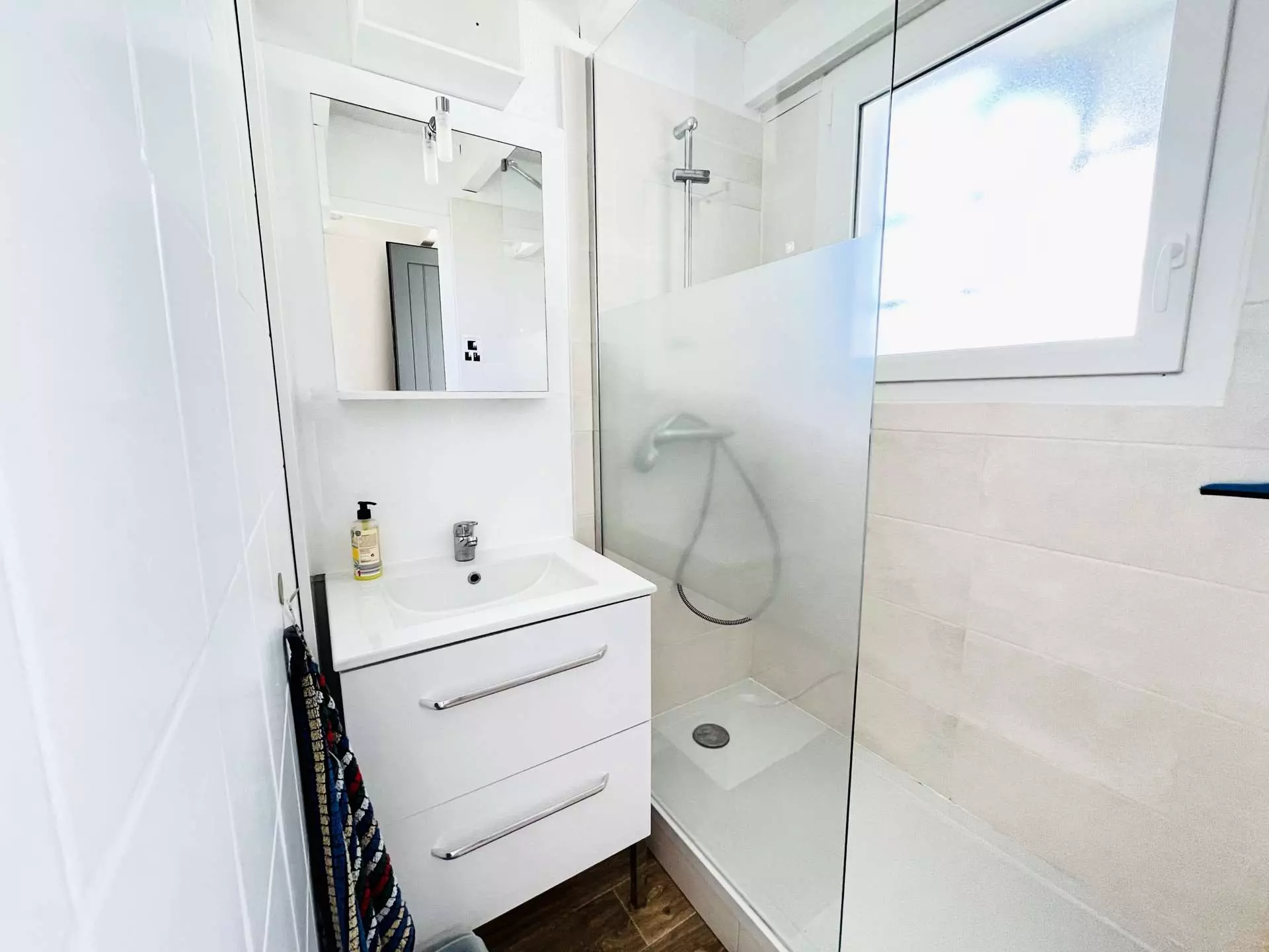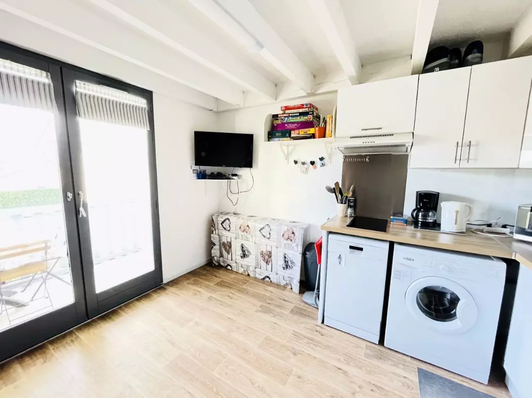 Upon entering, you'll discover a bright and thoughtfully furnished interior. The ground floor features a fully renovated bathroom with a window, a separate toilet, and a modern, fully equipped kitchen: dishwasher, washing machine, induction hob, microwave/grill, coffee maker, kettle, griddle, crepe maker, and toaster. Everything has been designed to ensure a hassle-free stay.