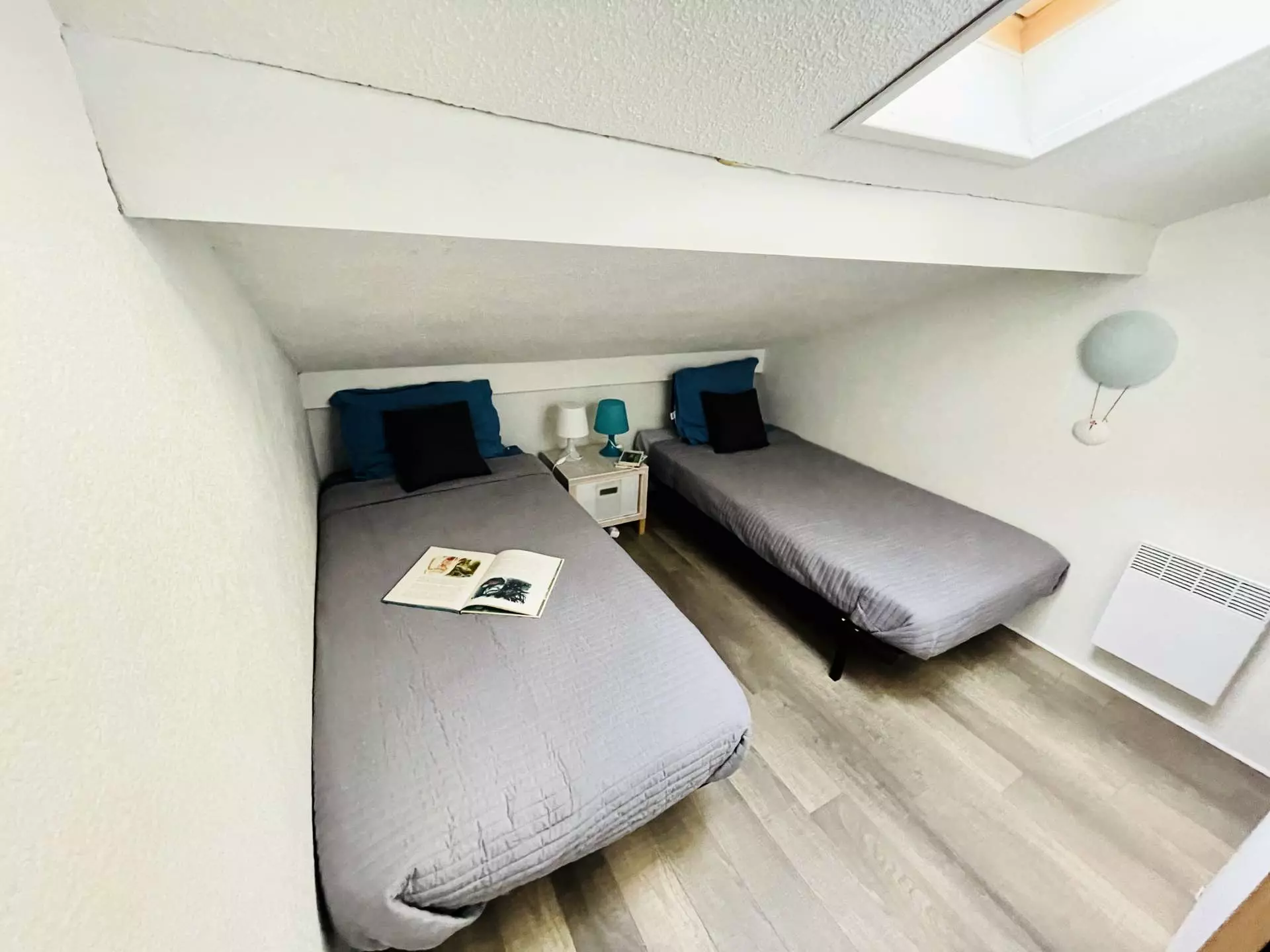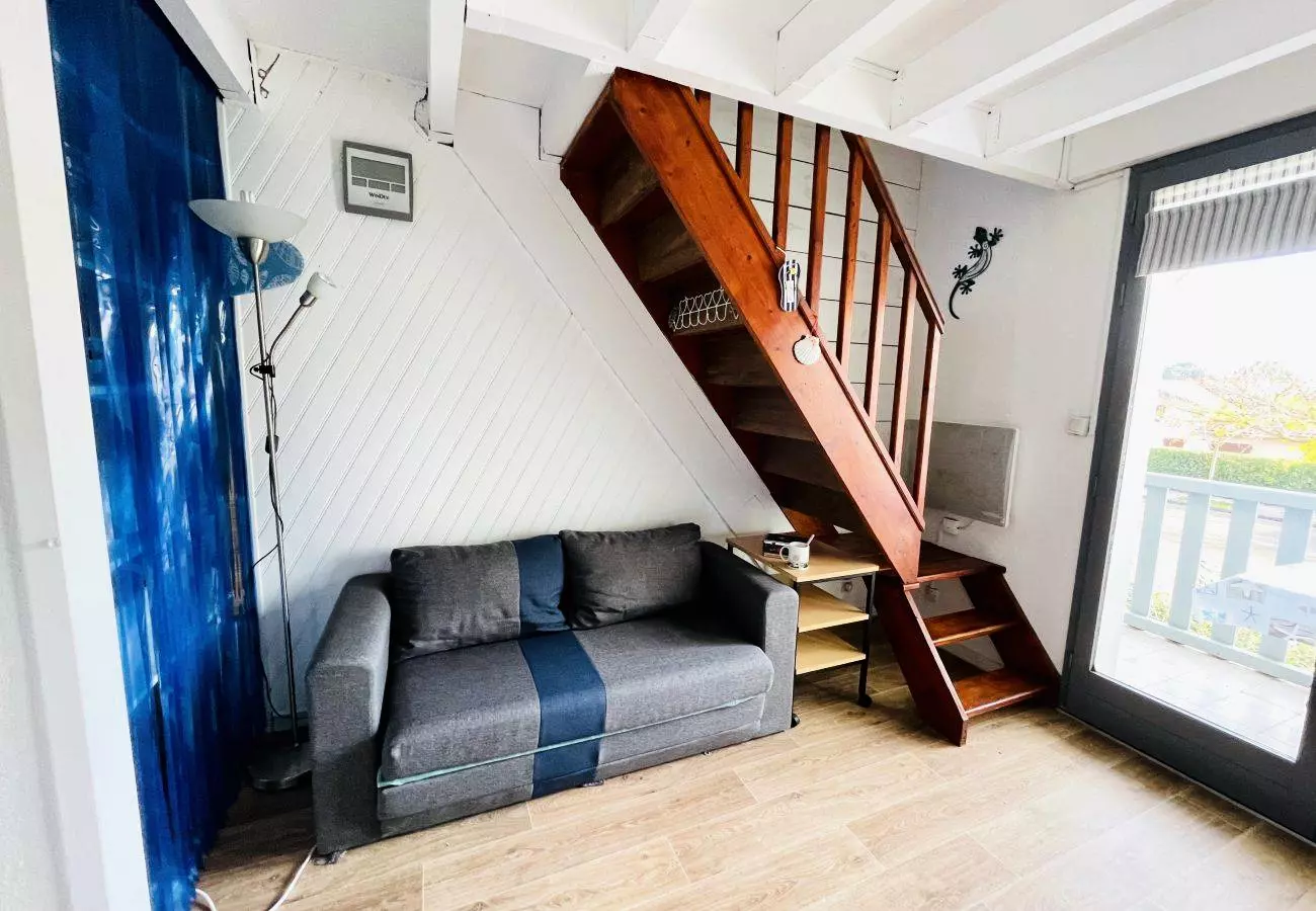 Upstairs, the sleeping area comprises two bedrooms with storage: one with a double bed (140 cm) and the other with two single beds (90 cm), perfect for accommodating family or friends. Fans are provided in each room for optimal comfort in all seasons.
