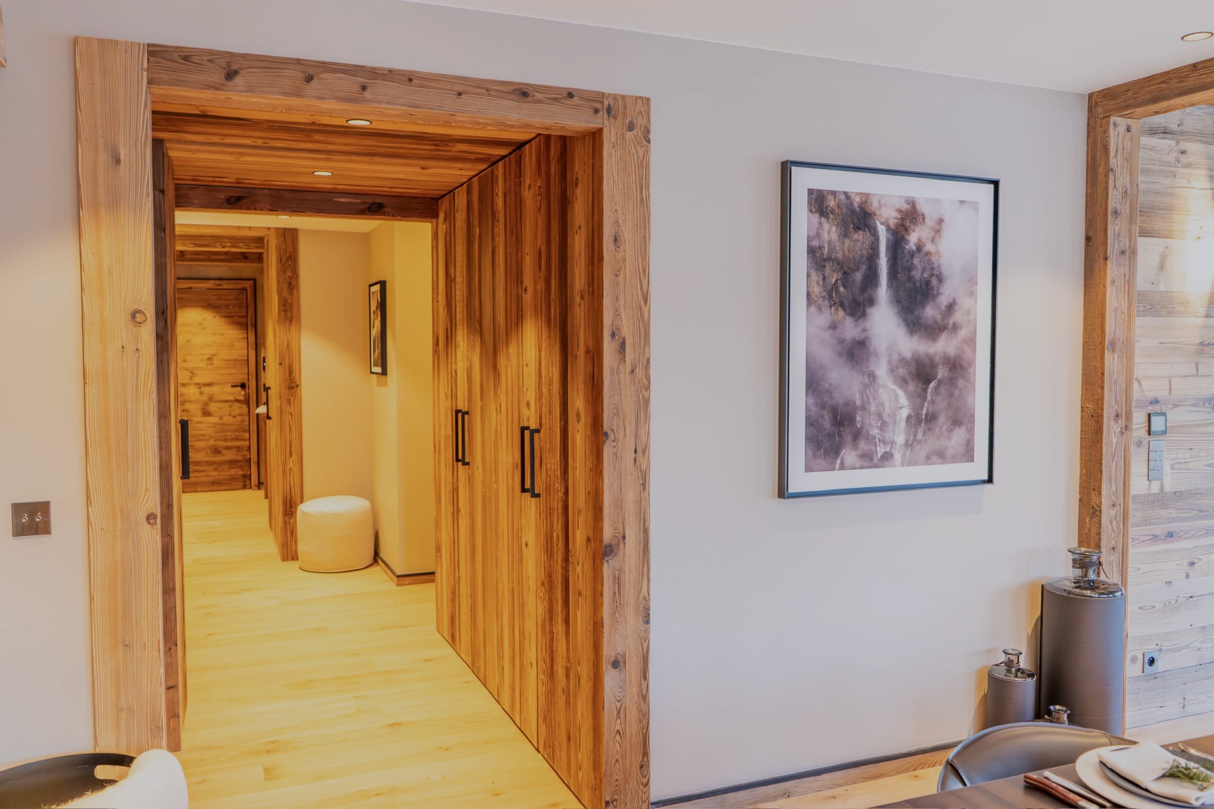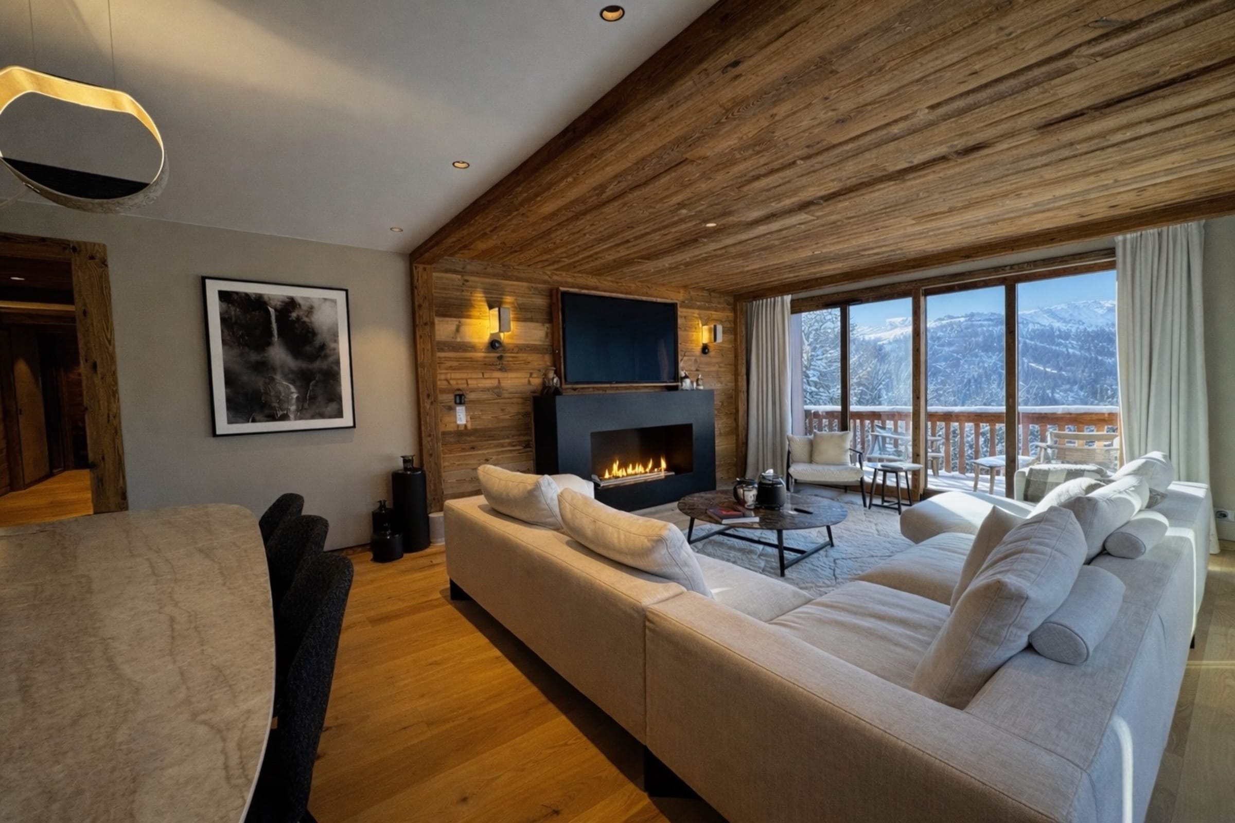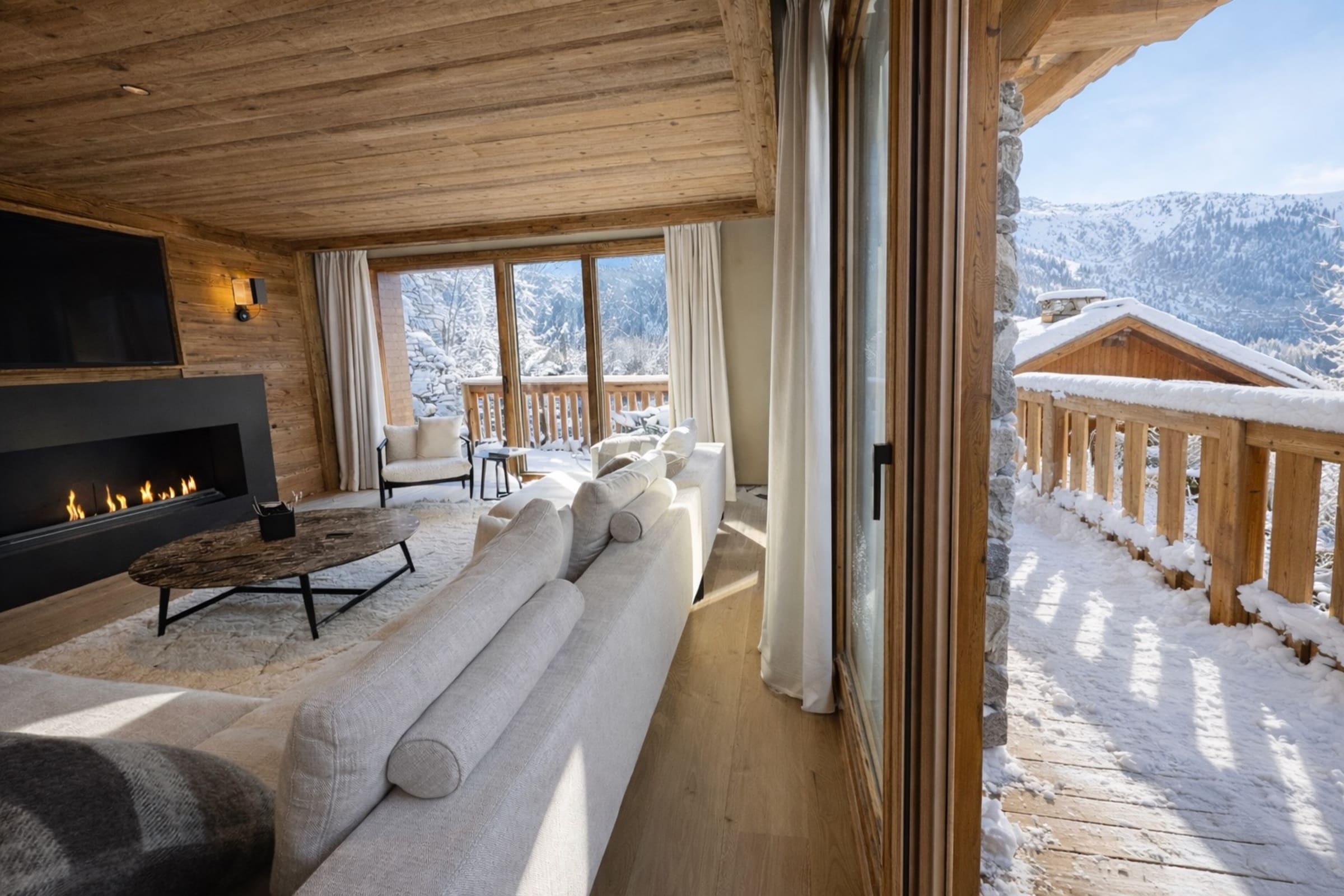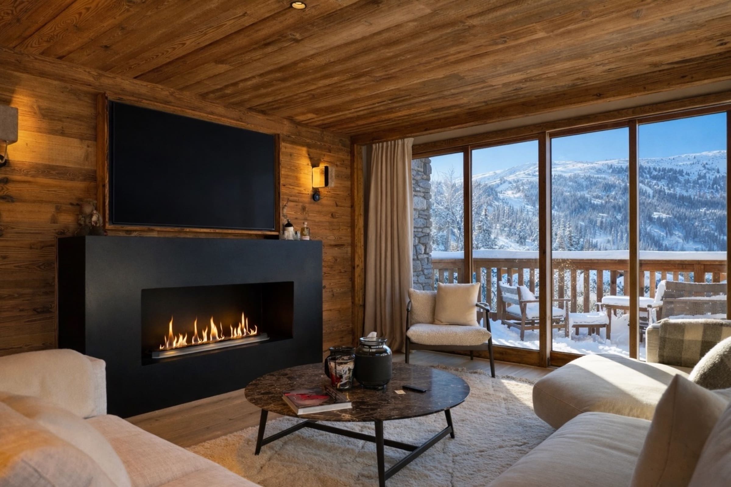 In Méribel (Morel area), Alpenglow is a stylish 125 m² apartment on the floor of a high-end residence, close to shops and around 100 m from the Morel chairlift. It features a warm alpine atmosphere with aged wood finishes, a bright living room with an ethanol fireplace, a fully equipped kitchen, a dining area, and a terrace with stunning mountain views.