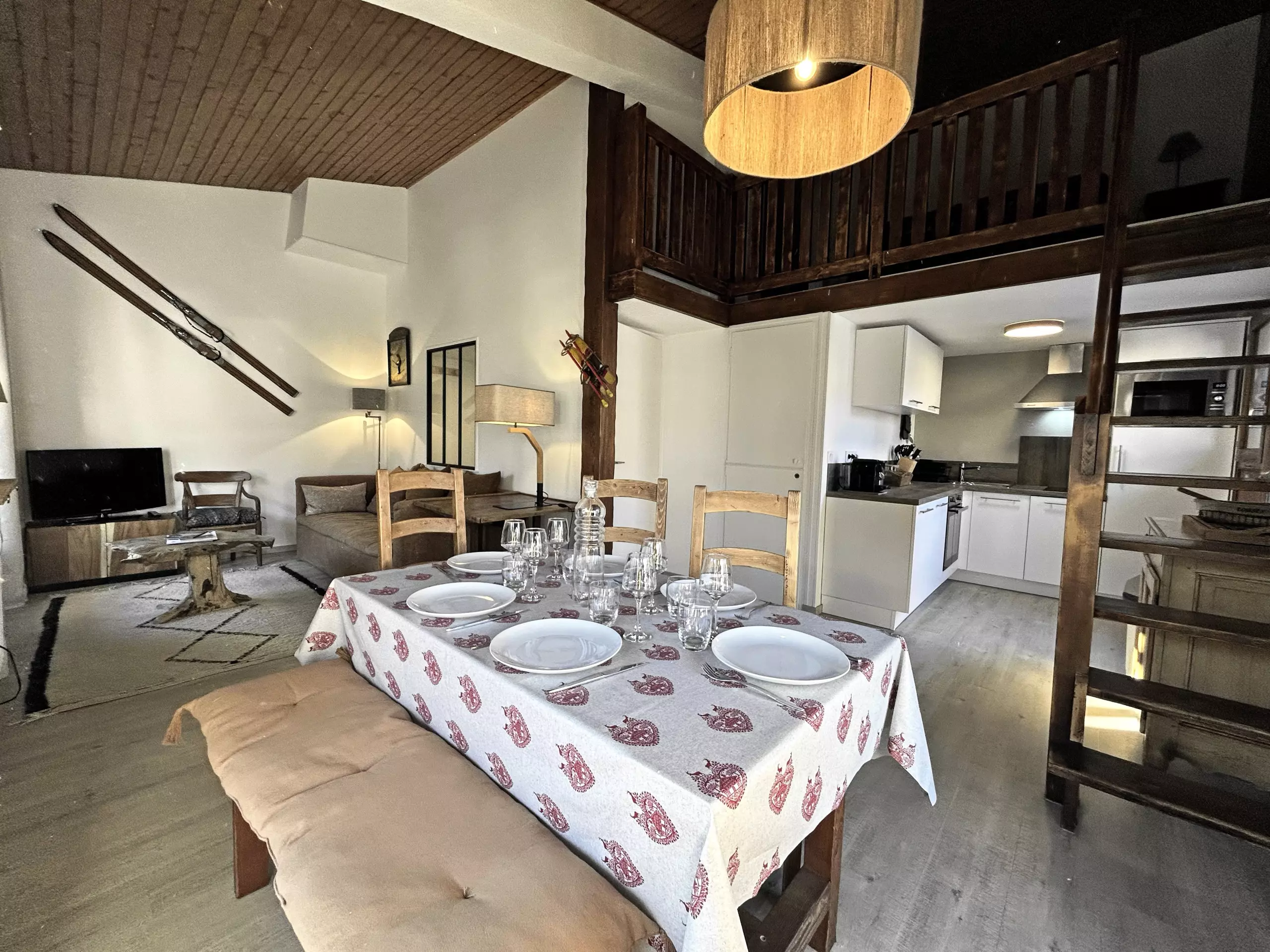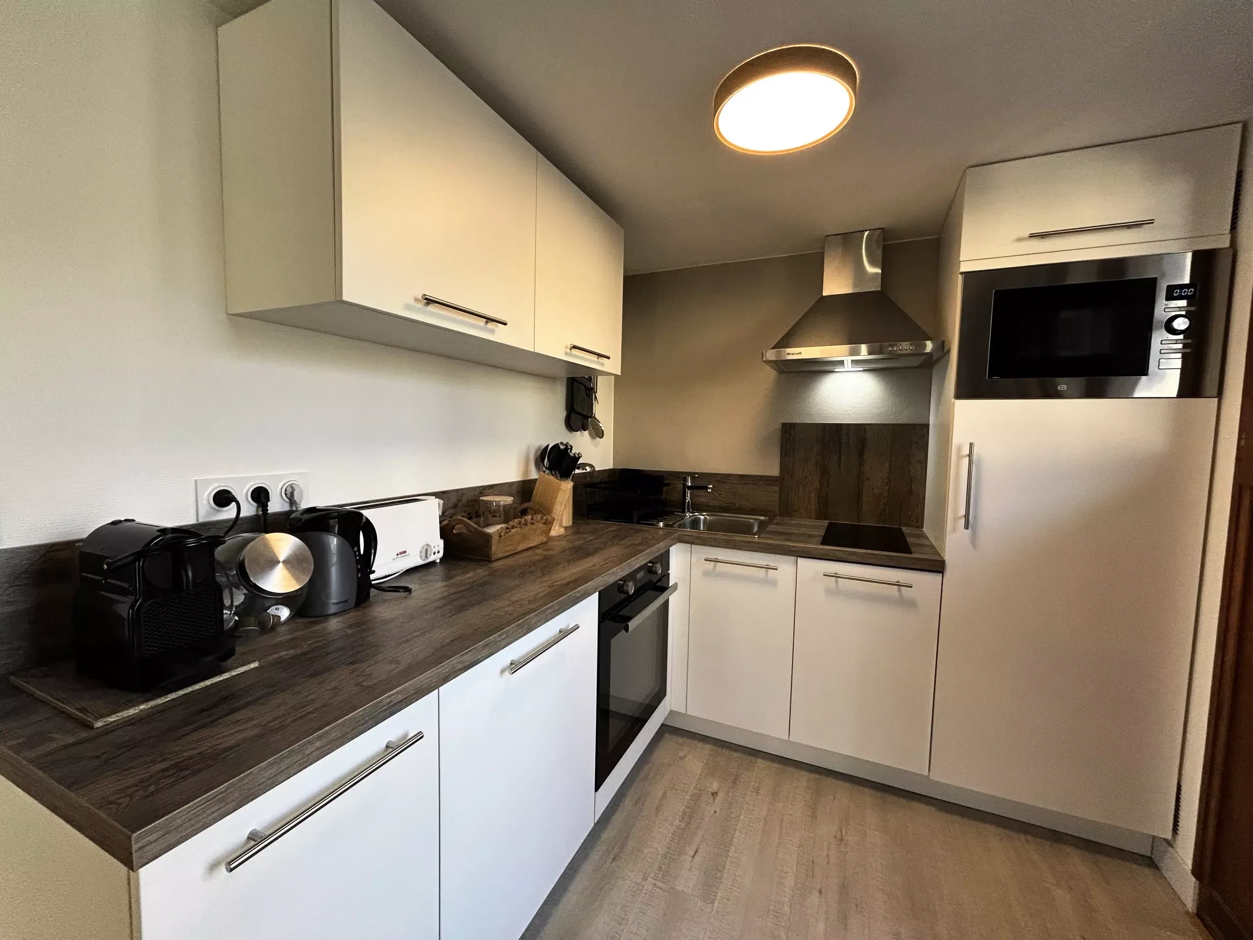 OPEN KITCHEN: 2 induction hobs, refrigerator, oven, dishwasher, microwave, capsule and filter coffee makers, raclette grill, fondue set and hot stone grill, toaster, kettle, all necessary kitchen utensils, French doors opening onto an east-facing balcony