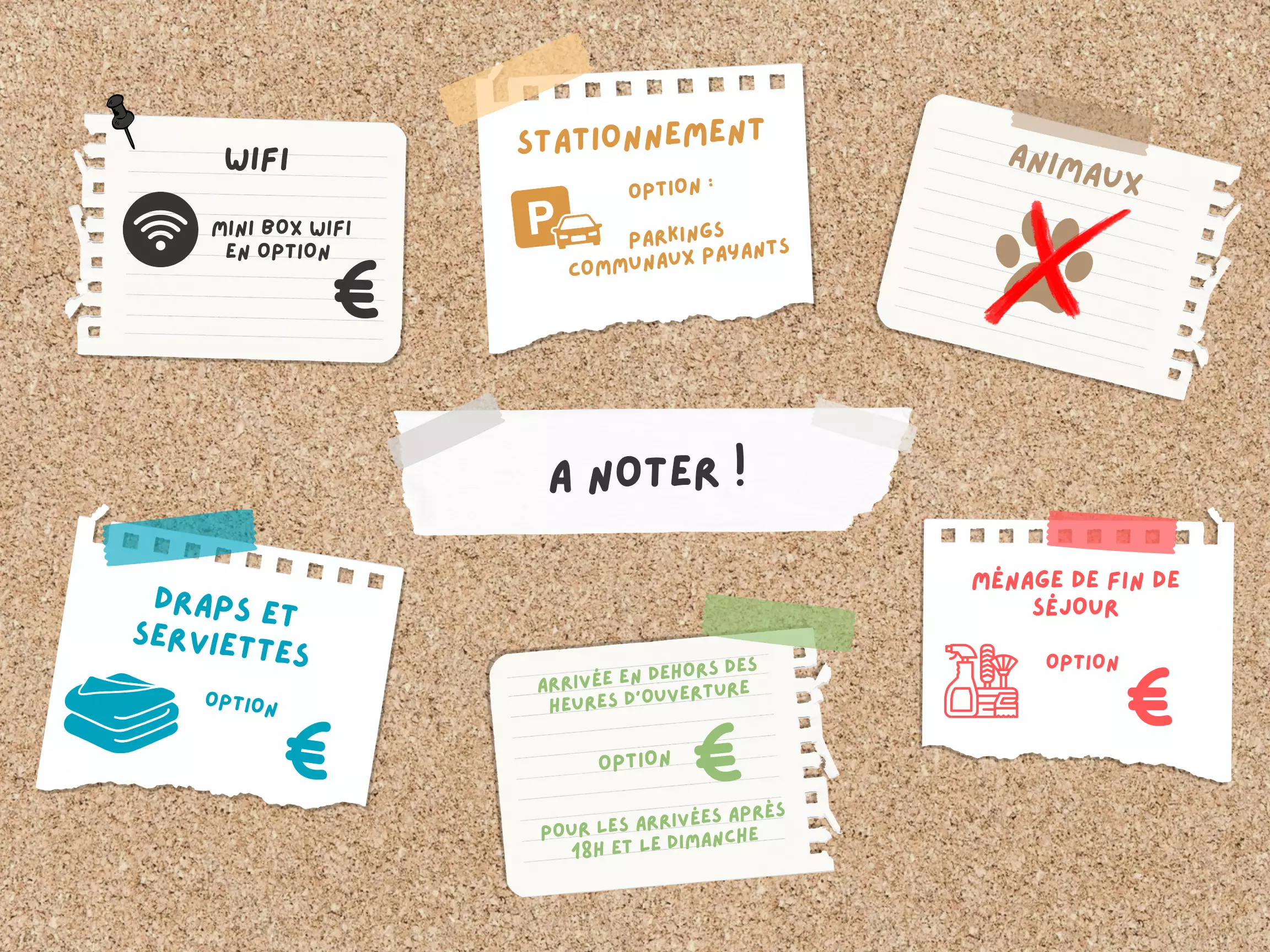 - End-of-stay cleaning, flat rate depending on the size of the accommodation (€50 to €150), to be ordered 3 days before departure