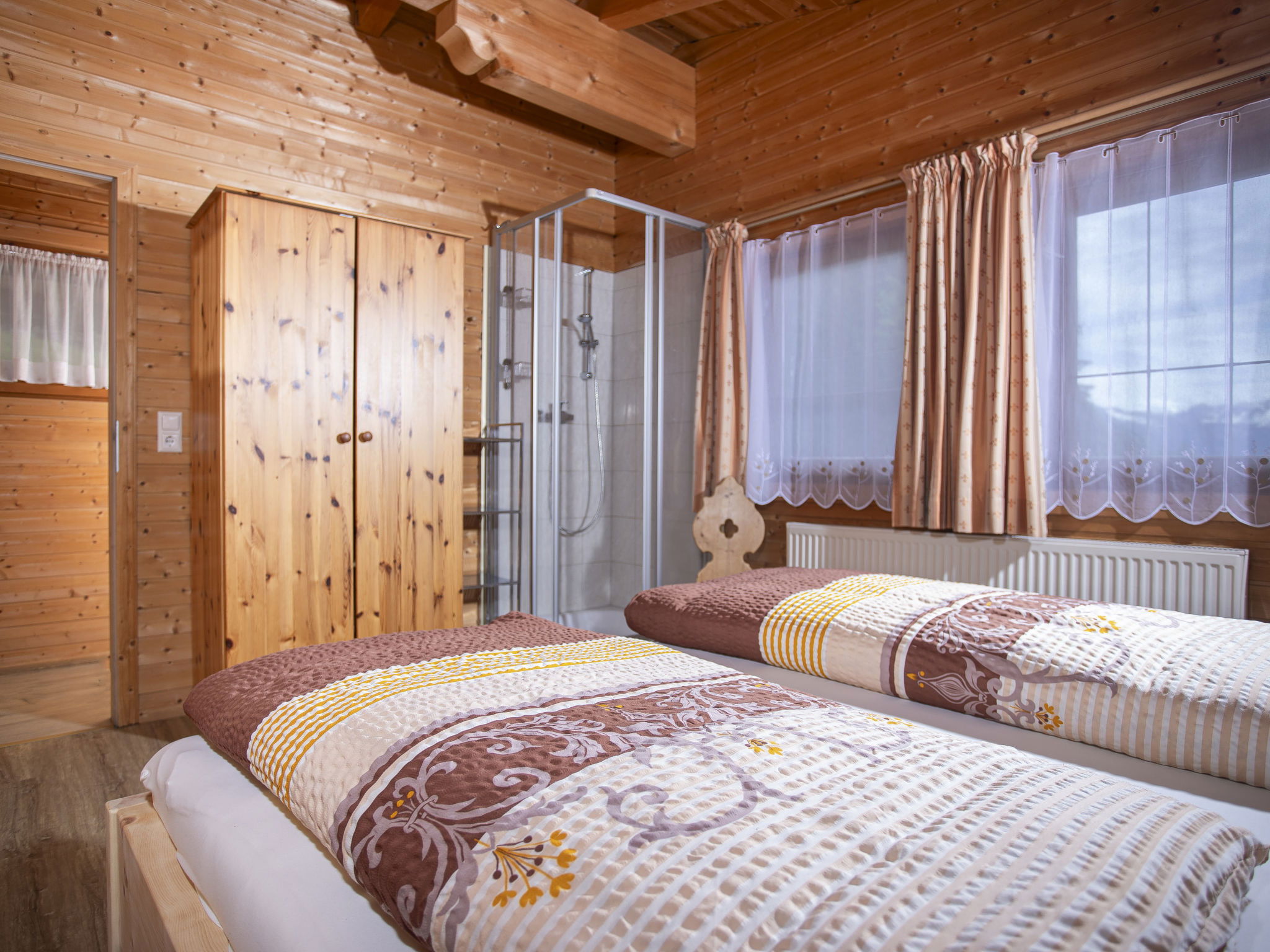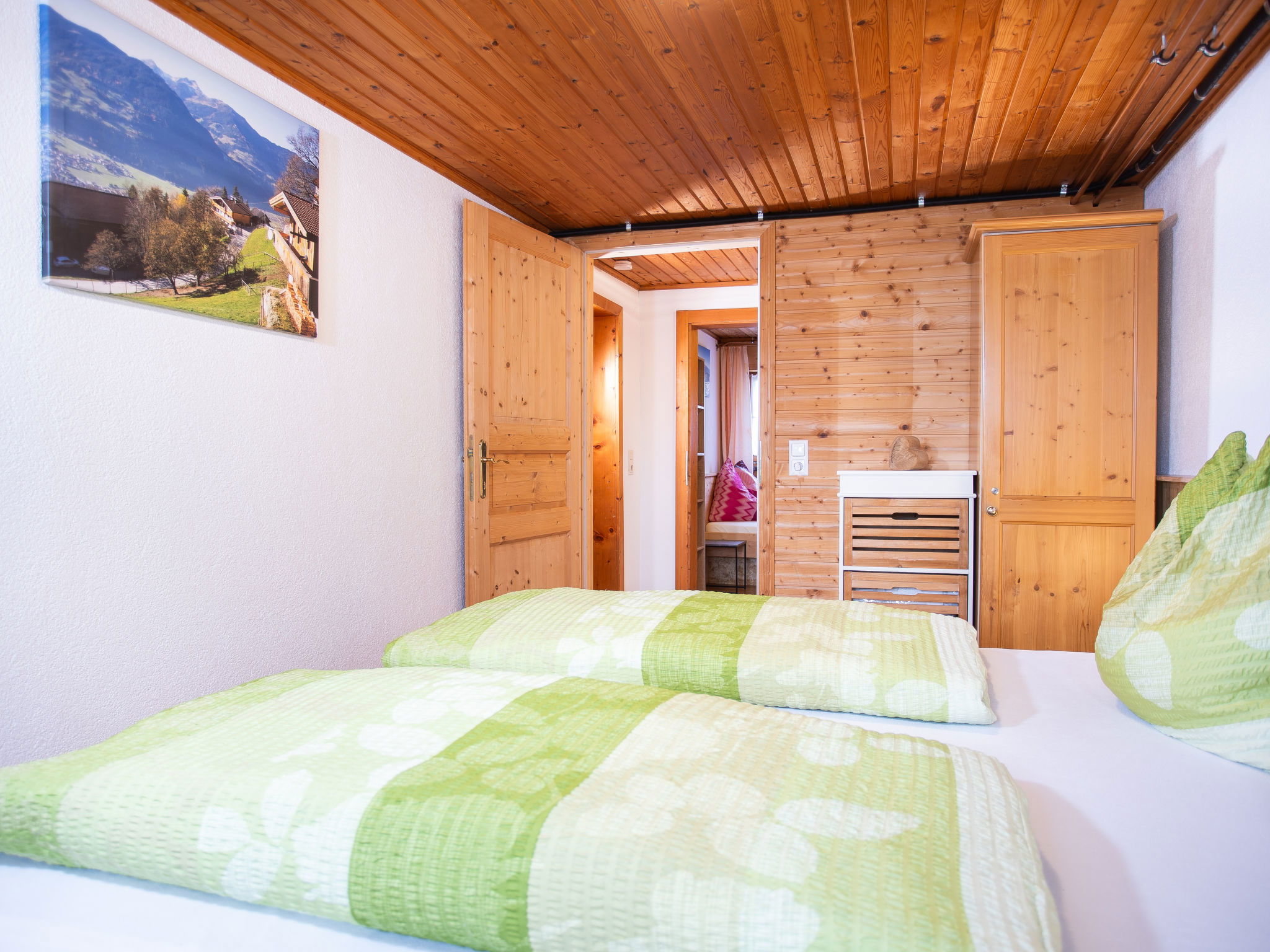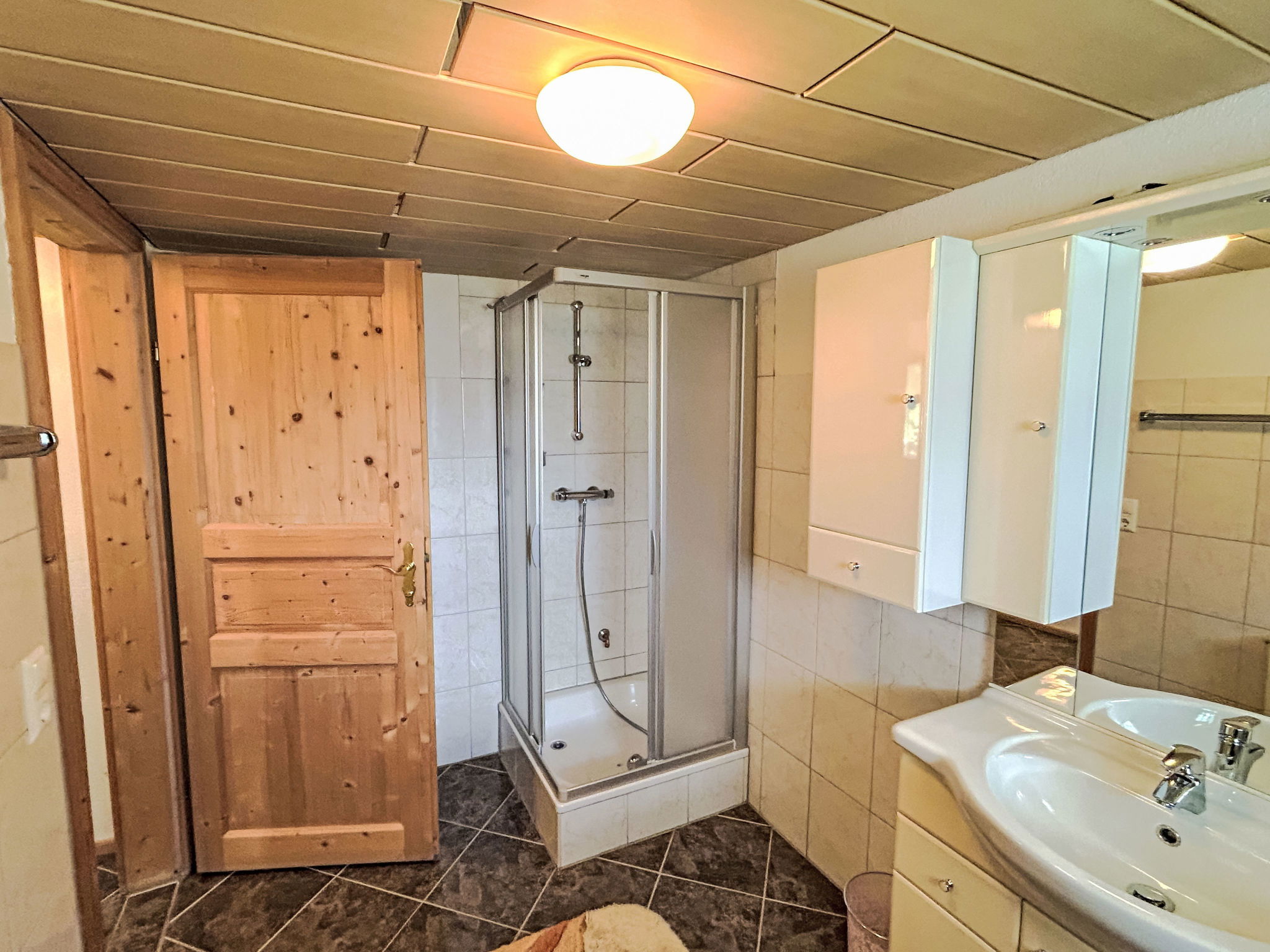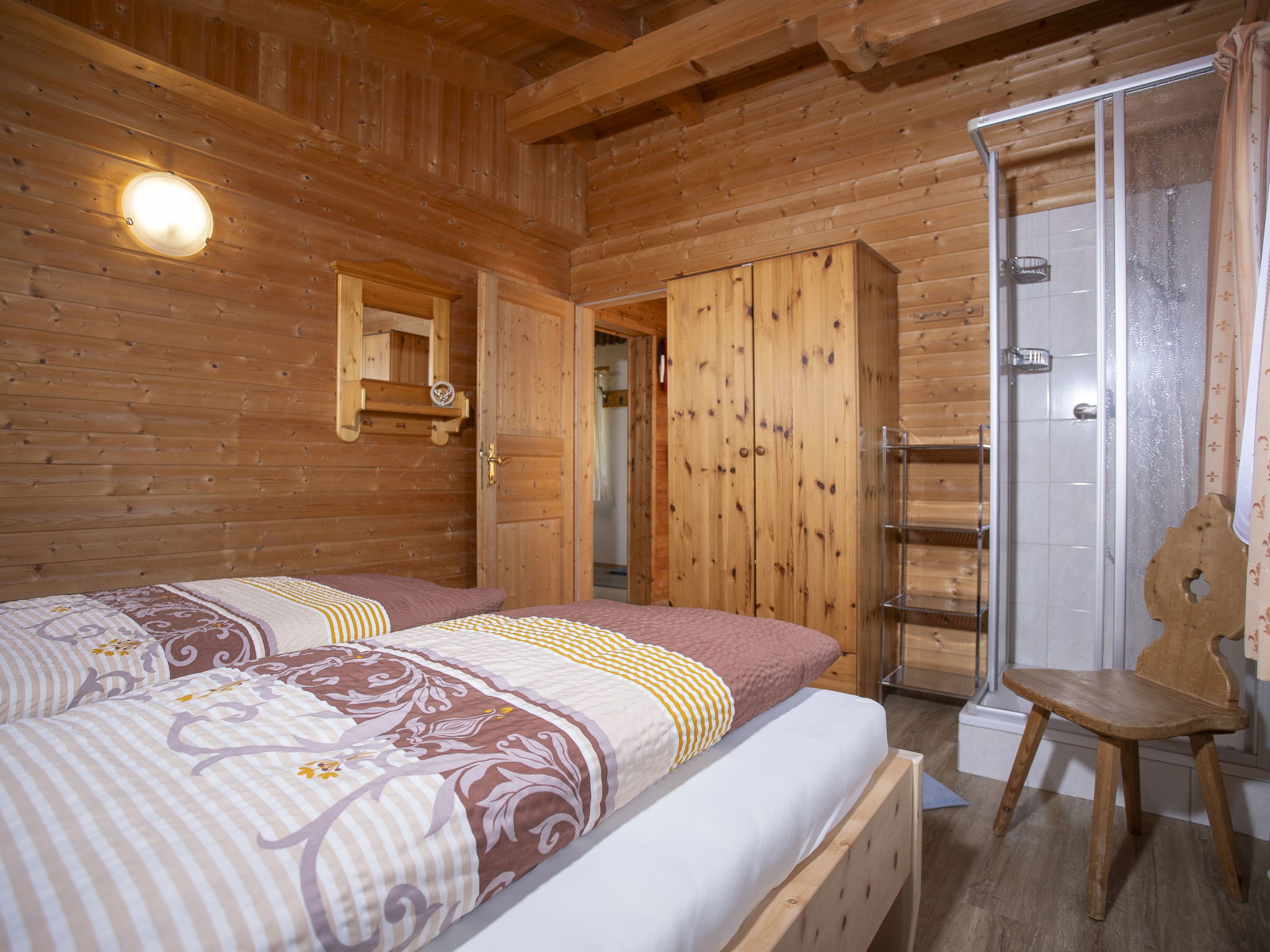 5-room chalet 93 m2 on 2 levels. Simple and cosy furnishings: 1 double bedroom with shower. Living/dining room with dining nook and satellite TV (flat screen), radio. Open kitchen (oven, dishwasher, 4 ceramic glass hob hotplates, microwave). Sep. WC. On the lower ground floor: 2 double bedrooms. 1 small room with 2 beds. Shower, sep. WC. Balcony, terrace roofed. Marvellous view of the mountains and the valley. Please note: maximum 2 pets/ dogs allowed. Smoke alarm.