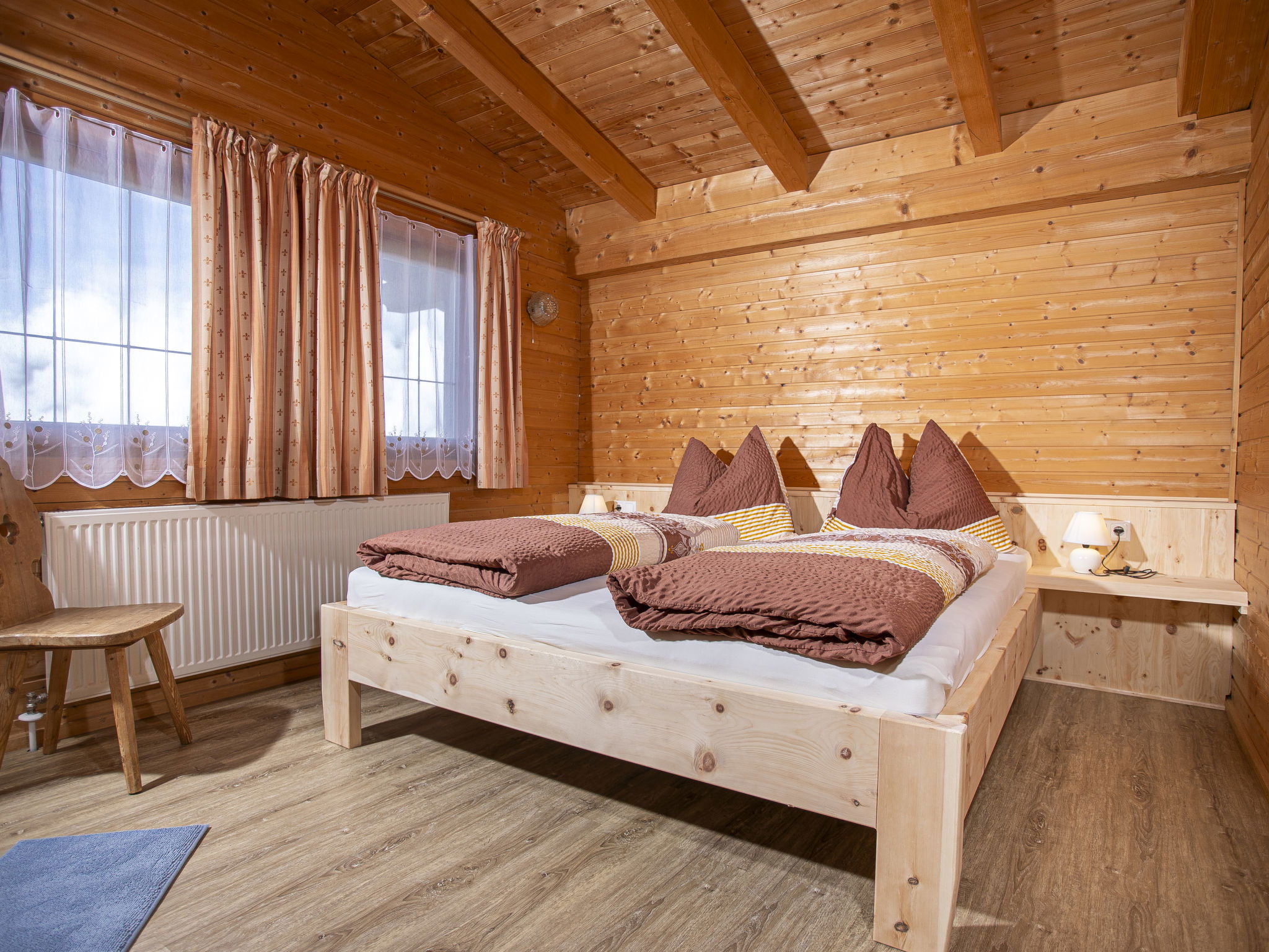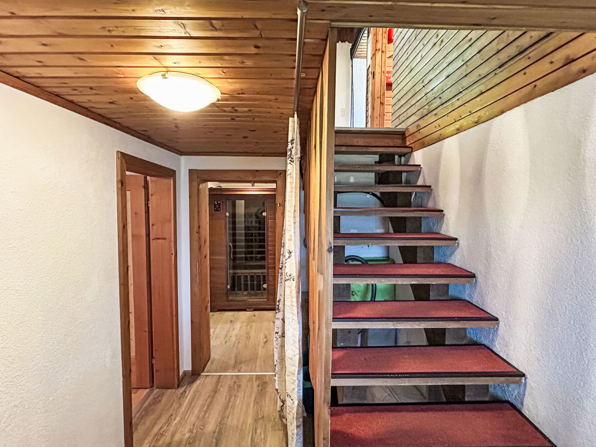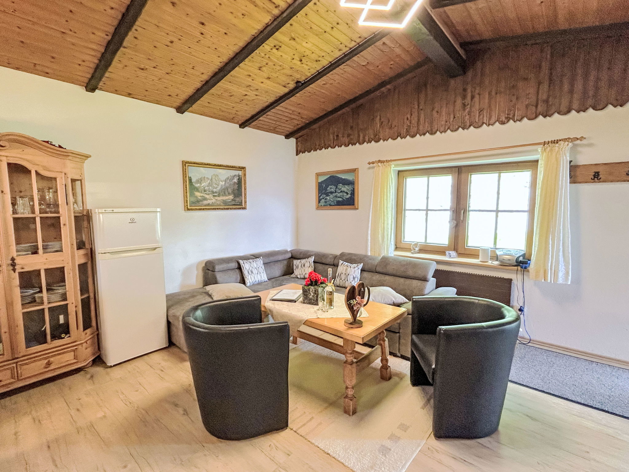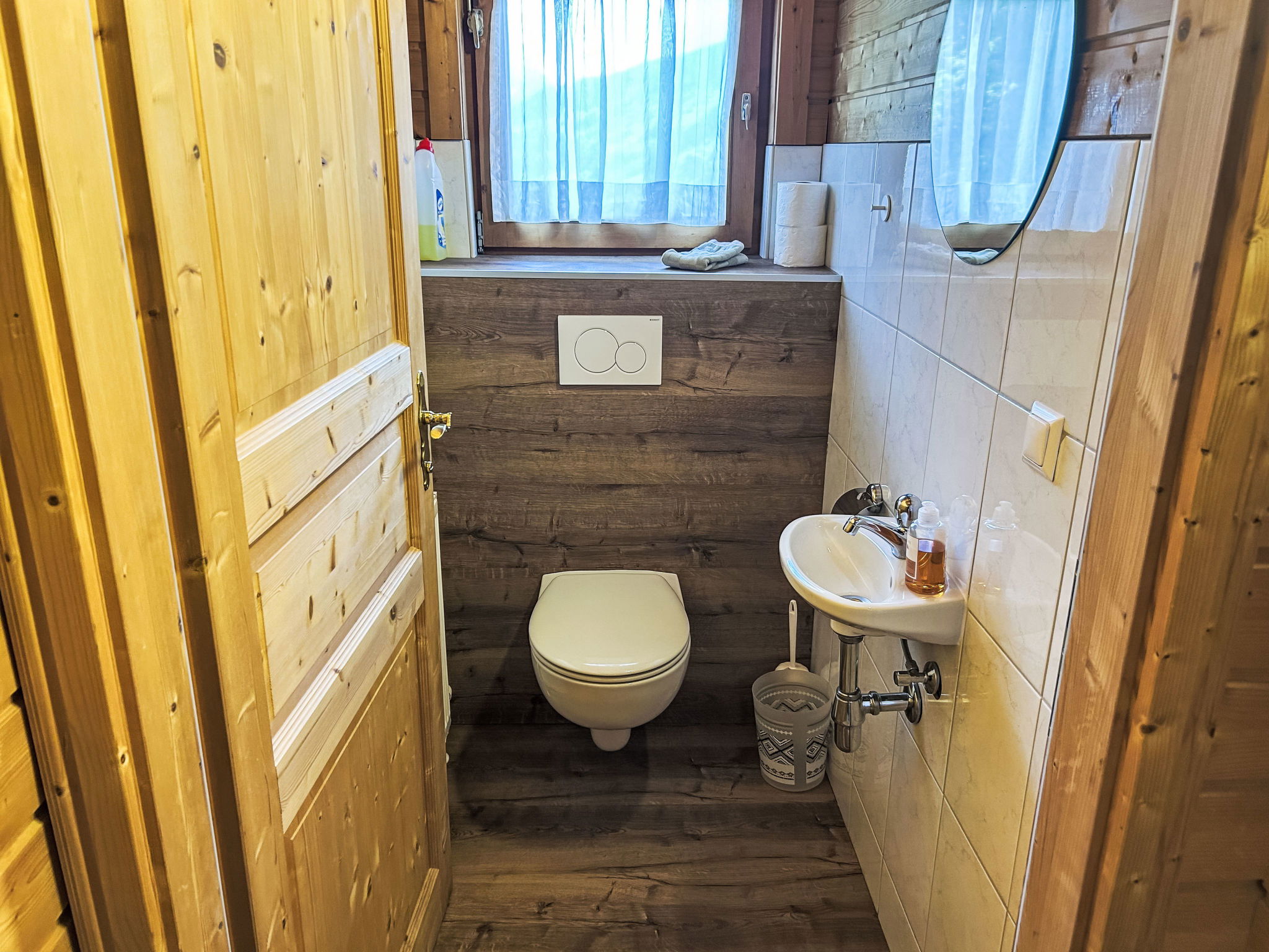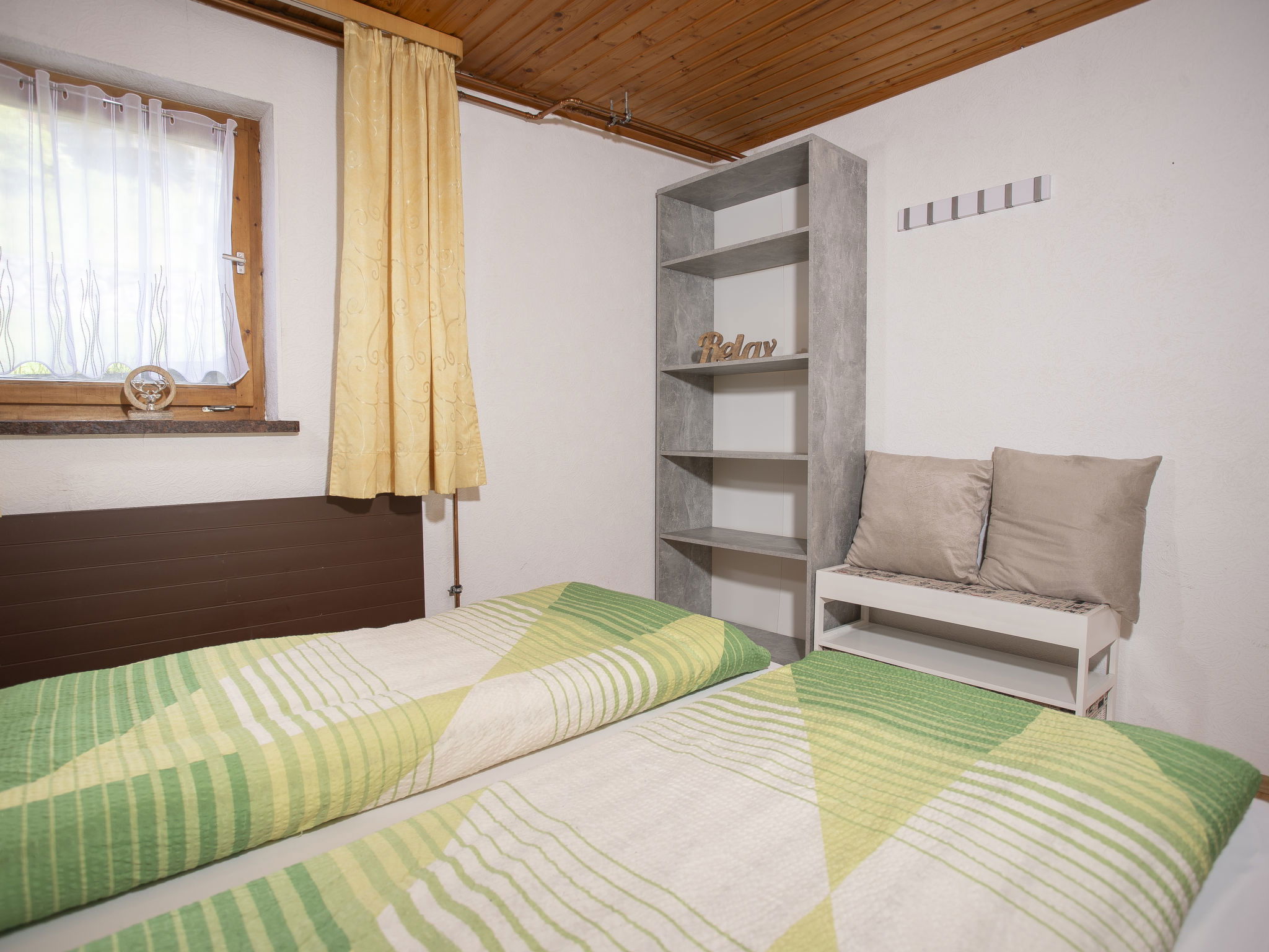 5-room chalet 93 m2 on 2 levels. Simple and cosy furnishings: 1 double bedroom with shower. Living/dining room with dining nook and satellite TV (flat screen), radio. Open kitchen (oven, dishwasher, 4 ceramic glass hob hotplates, microwave). Sep. WC. On the lower ground floor: 2 double bedrooms. 1 small room with 2 beds. Shower, sep. WC. Balcony, terrace roofed. Marvellous view of the mountains and the valley. Please note: maximum 2 pets/ dogs allowed. Smoke alarm.
