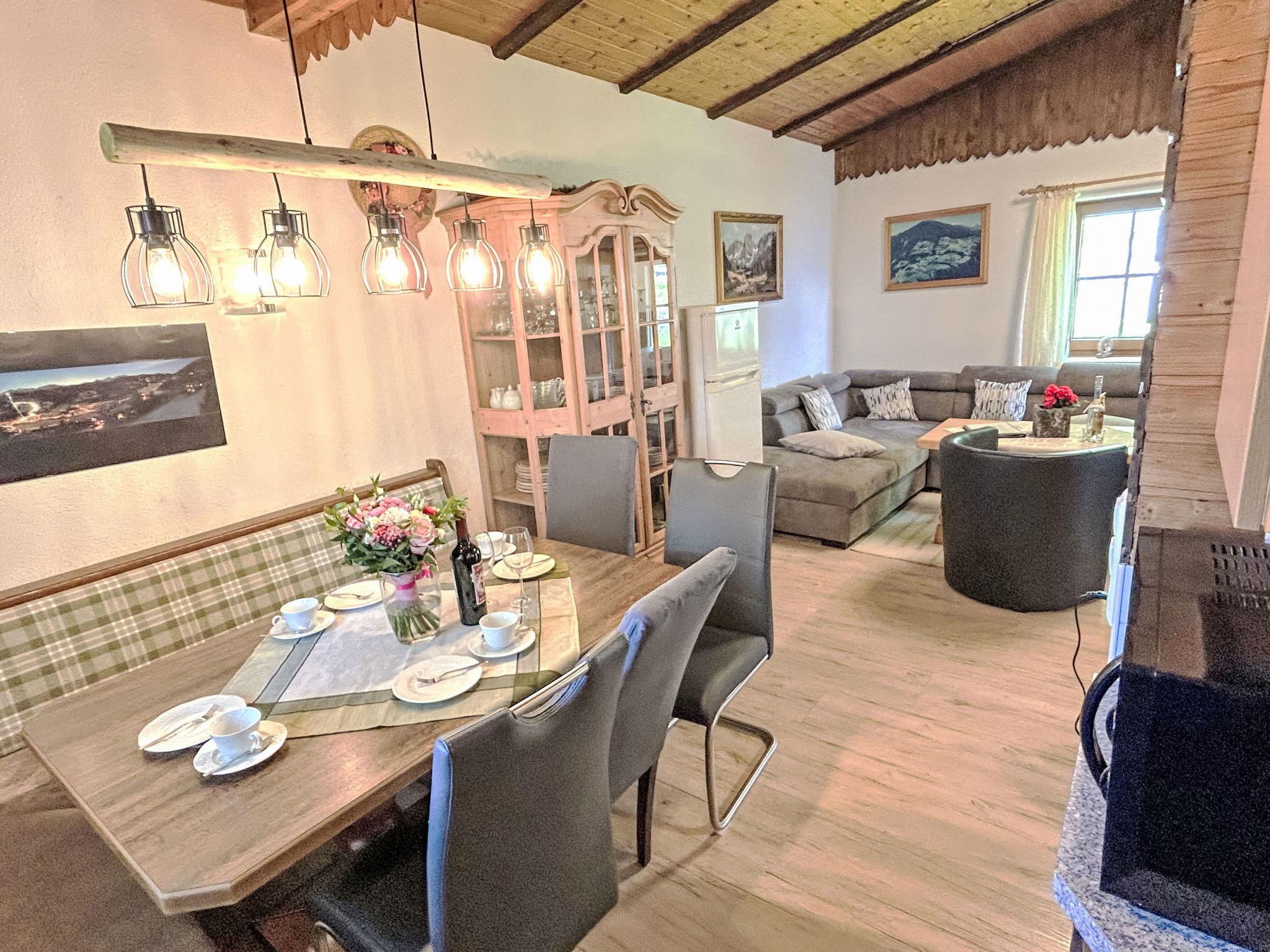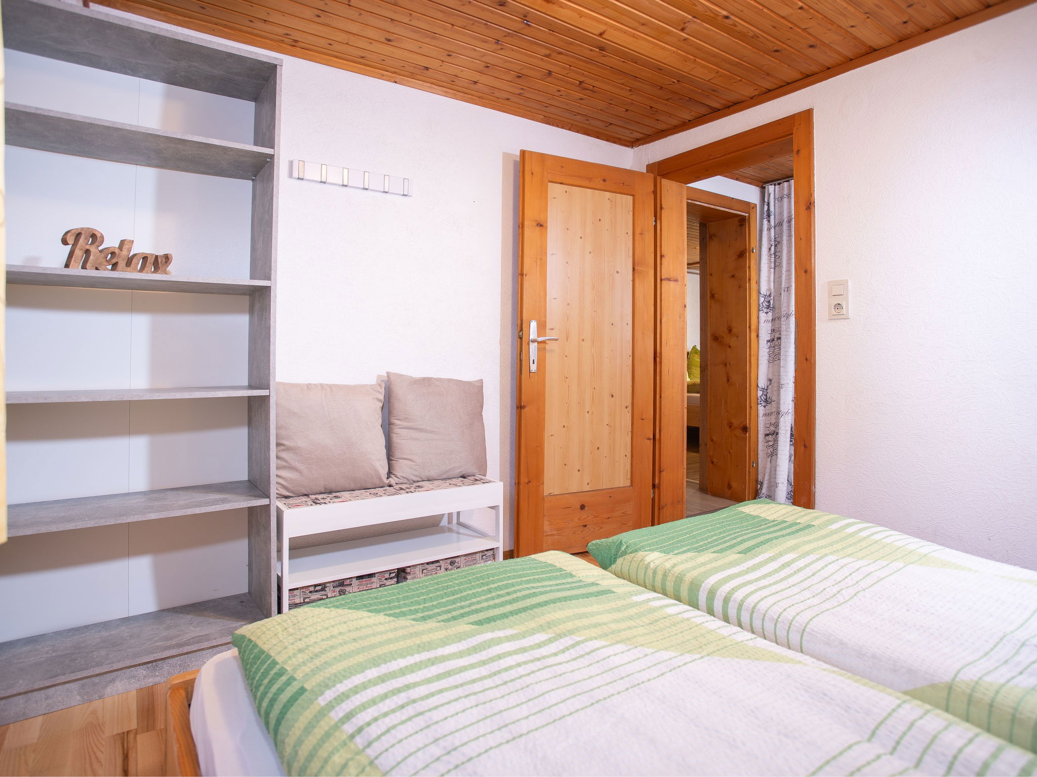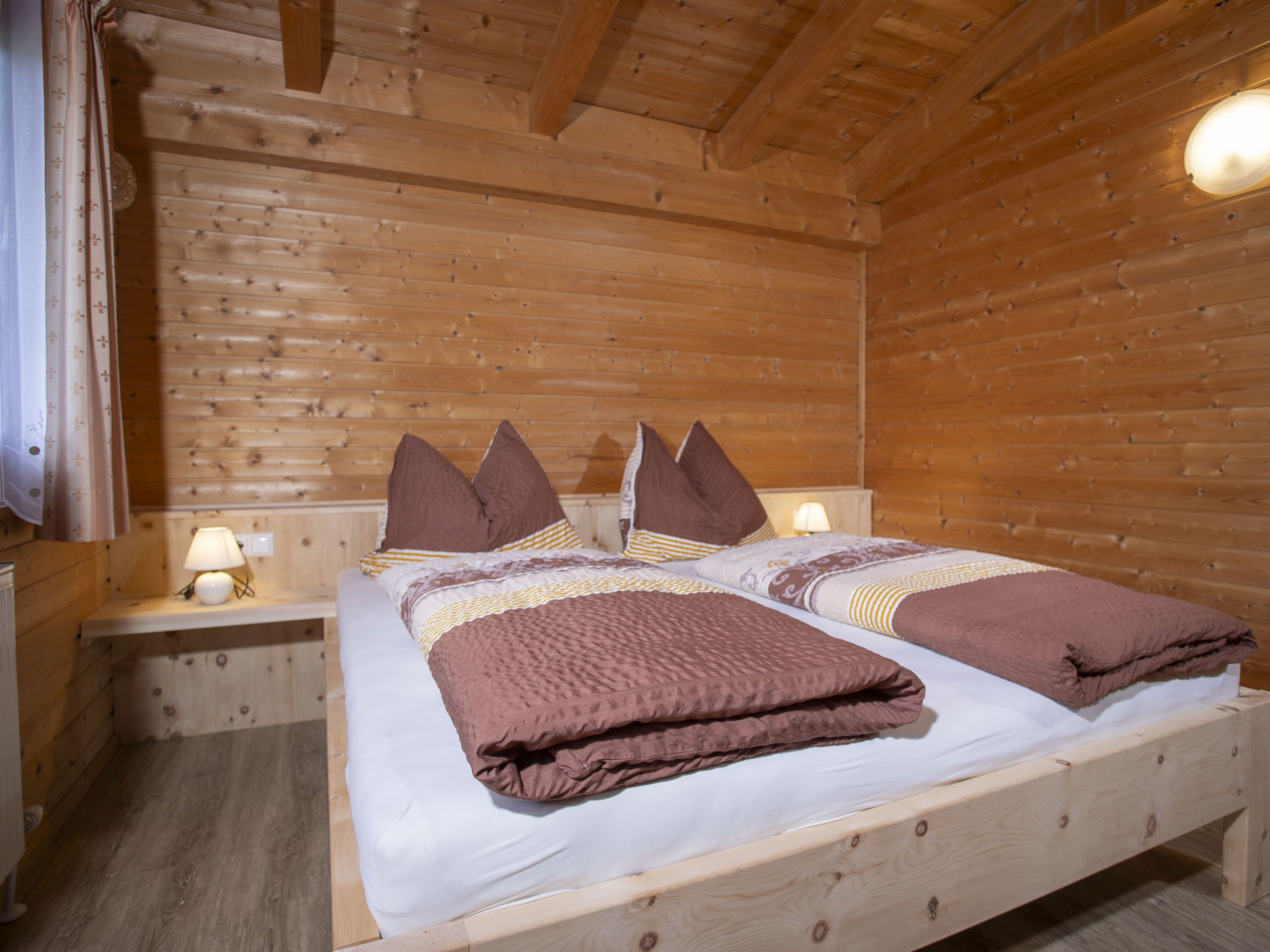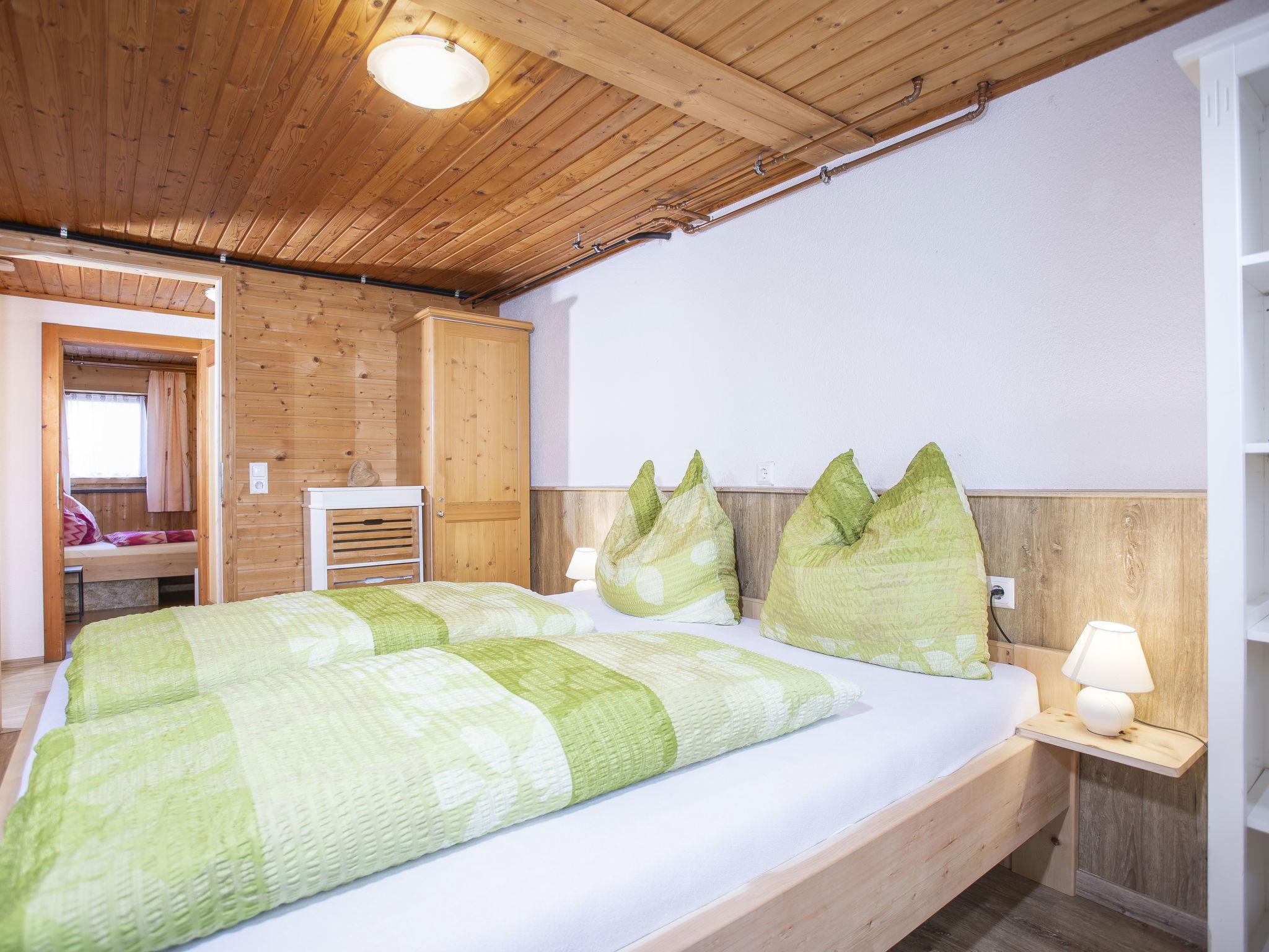 5-room chalet 93 m2 on 2 levels. Simple and cosy furnishings: 1 double bedroom with shower. Living/dining room with dining nook and satellite TV (flat screen), radio. Open kitchen (oven, dishwasher, 4 ceramic glass hob hotplates, microwave). Sep. WC. On the lower ground floor: 2 double bedrooms. 1 small room with 2 beds. Shower, sep. WC. Balcony, terrace roofed. Marvellous view of the mountains and the valley. Please note: maximum 2 pets/ dogs allowed. Smoke alarm.