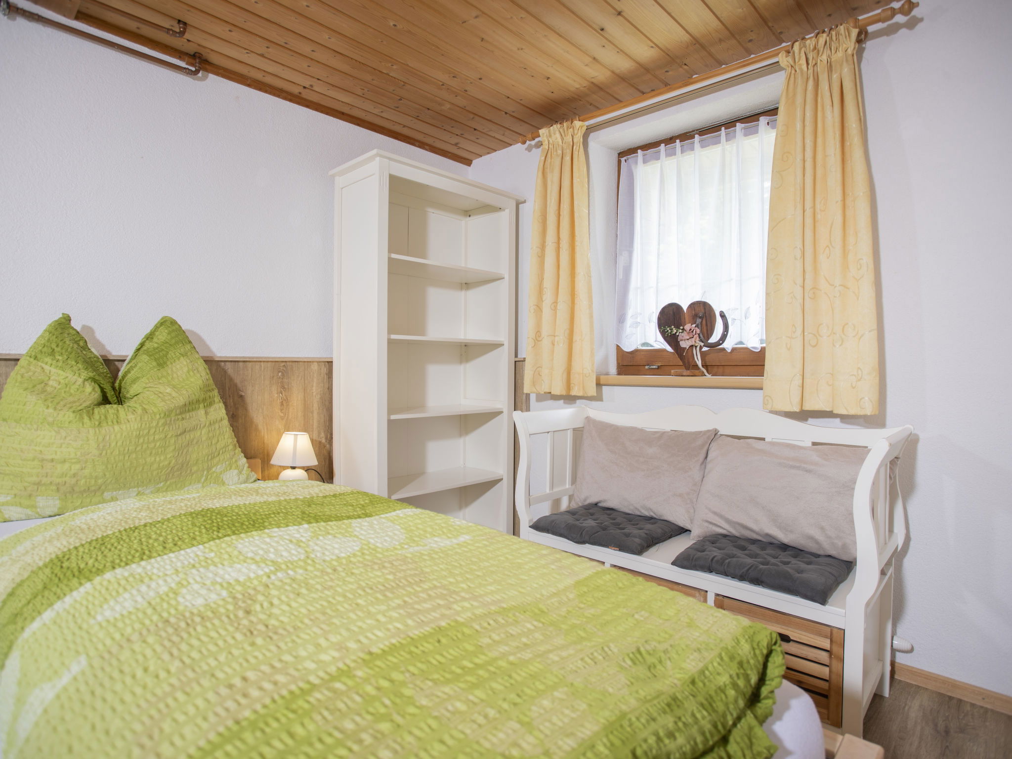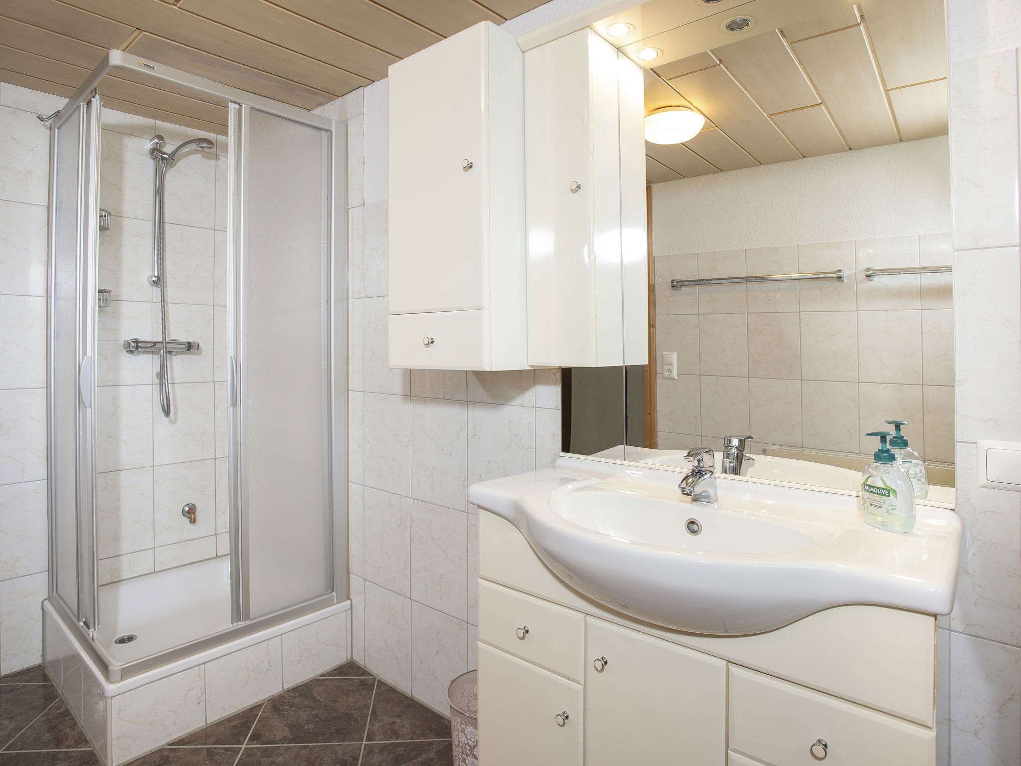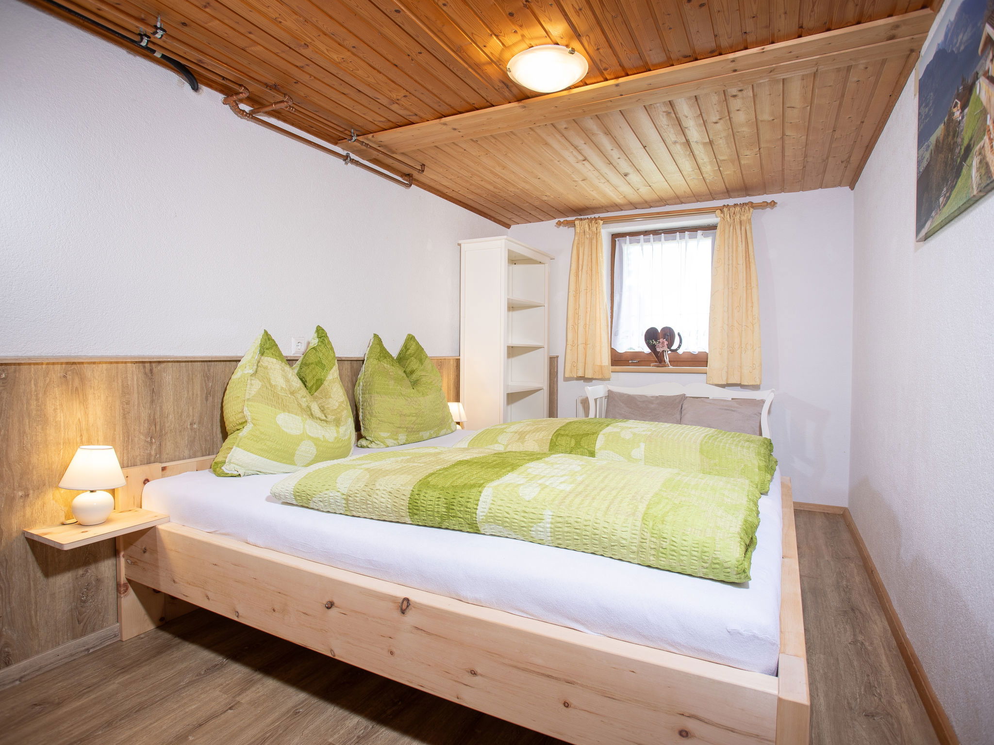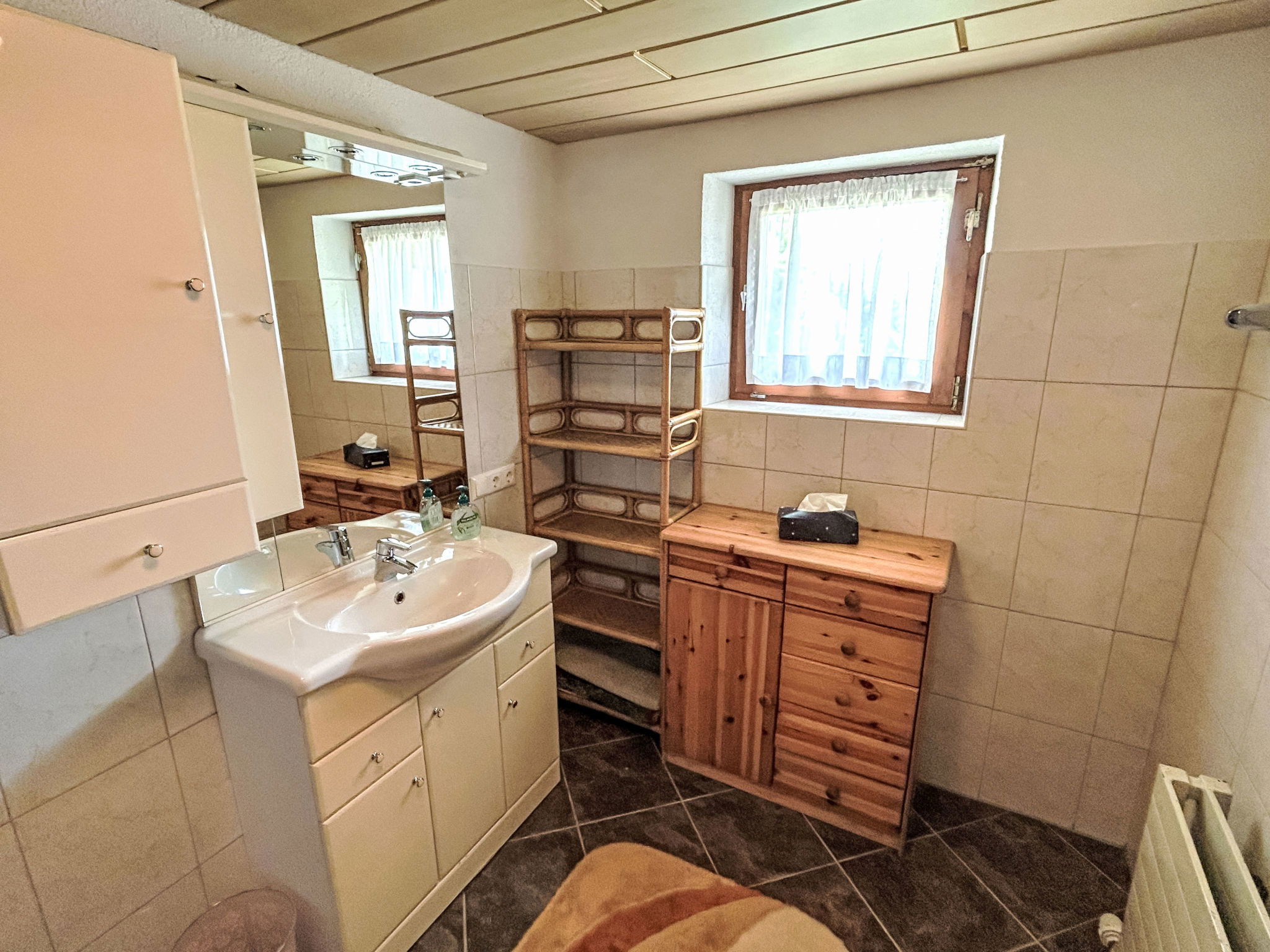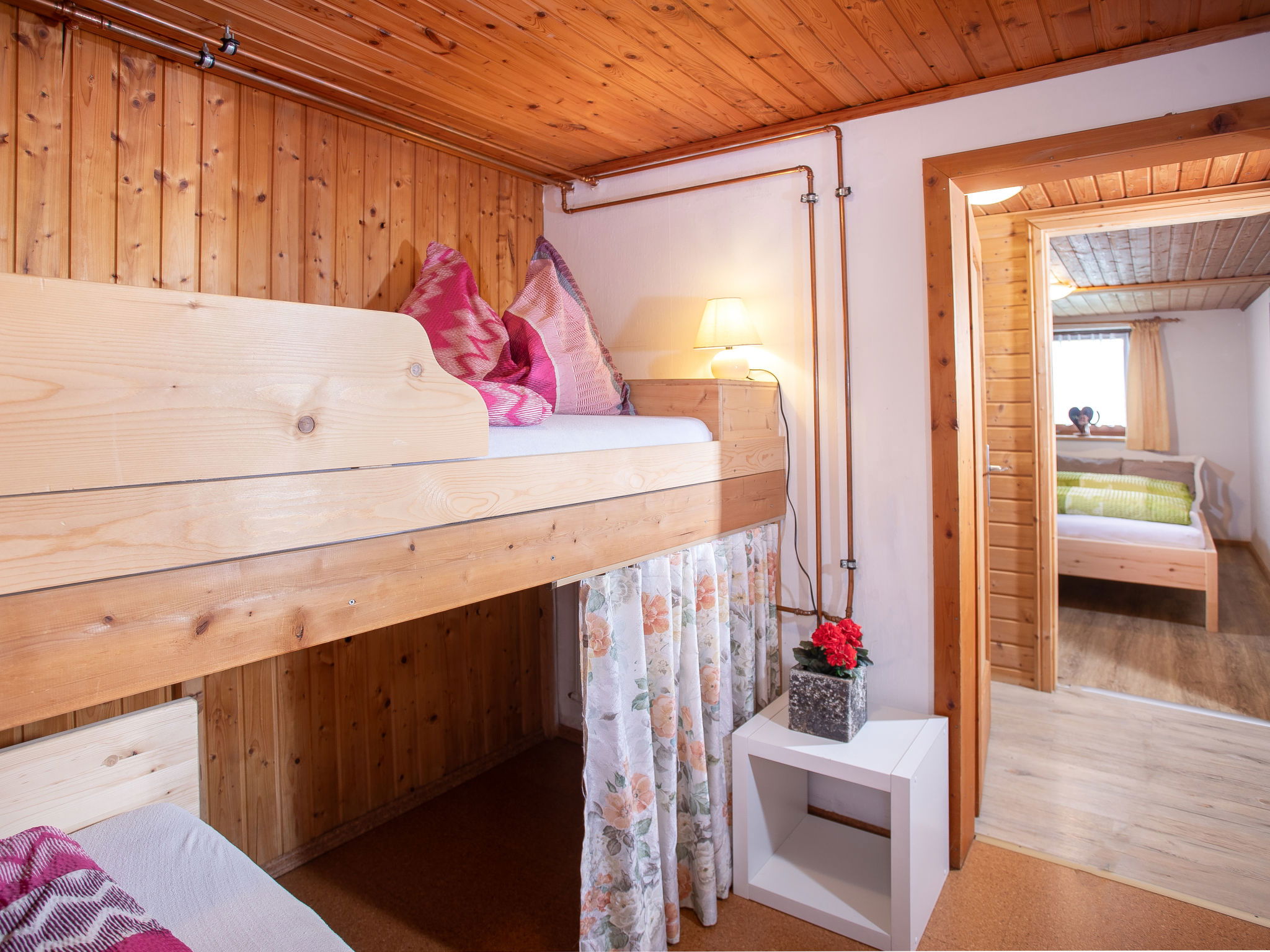 5-room chalet 93 m2 on 2 levels. Simple and cosy furnishings: 1 double bedroom with shower. Living/dining room with dining nook and satellite TV (flat screen), radio. Open kitchen (oven, dishwasher, 4 ceramic glass hob hotplates, microwave). Sep. WC. On the lower ground floor: 2 double bedrooms. 1 small room with 2 beds. Shower, sep. WC. Balcony, terrace roofed. Marvellous view of the mountains and the valley. Please note: maximum 2 pets/ dogs allowed. Smoke alarm.