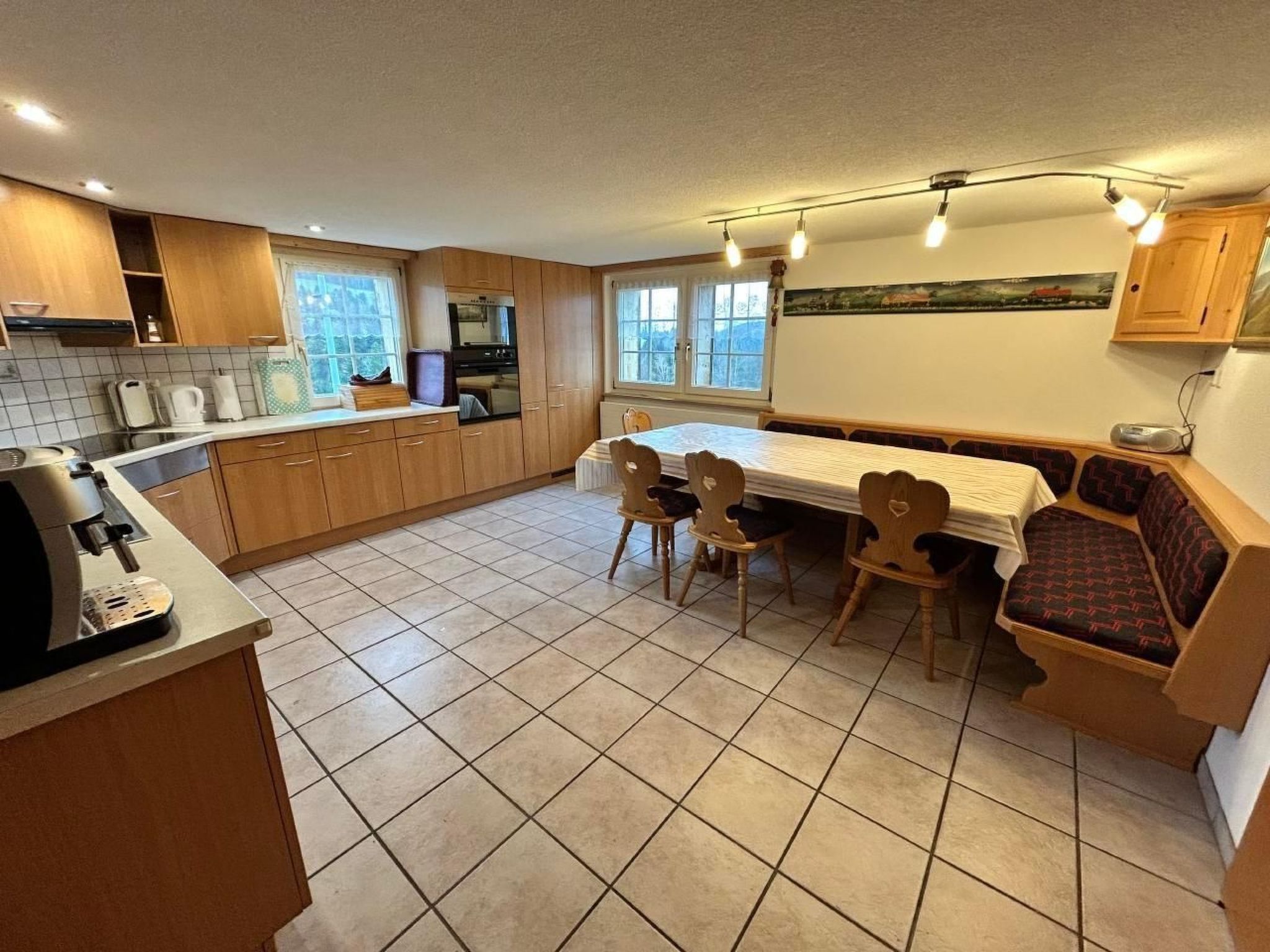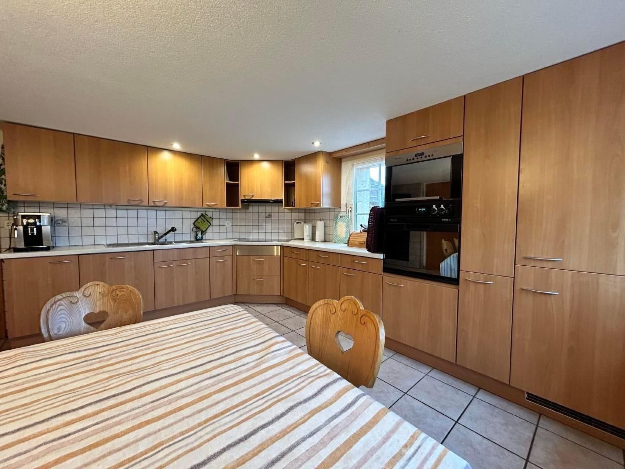 At the heart of our holiday flat is a cosy living room, furnished with a sofa, satellite TV, internet connection, DVD player and a wide range of books as well as extensive information material on the region. The large eat-in kitchen with its inviting large table and corner bench is equipped with a dishwasher, fridge with freezer compartment, ceramic hob, oven, microwave, toaster, fondue and raclette dishes. The interior is completed by four double bedrooms and, on request, a cot and a high chair. A bathroom with bathtub, separate shower, WC and double washbasin emphasises the comfort. The washing machine is subject to a fee, charge is based on consumption.