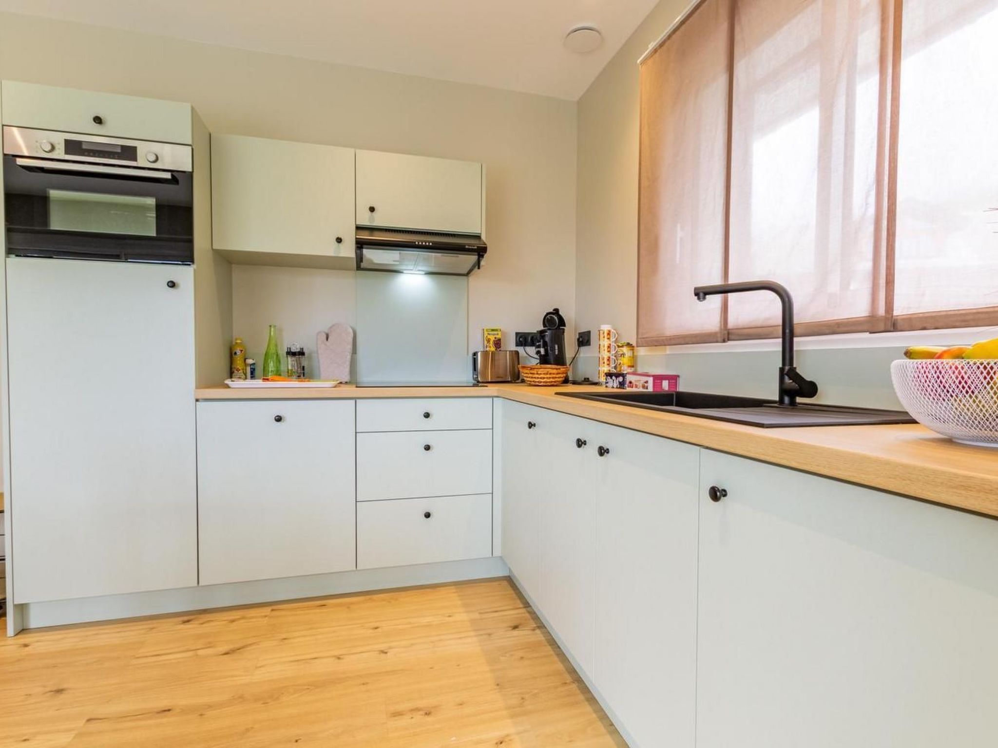 The kitchen is fully equipped with induction hob, pod coffee maker, toaster, mini-oven, microwave, electric kettle and dishwasher. There's also a raclette grill for the winter and a plancha grill for the summer.