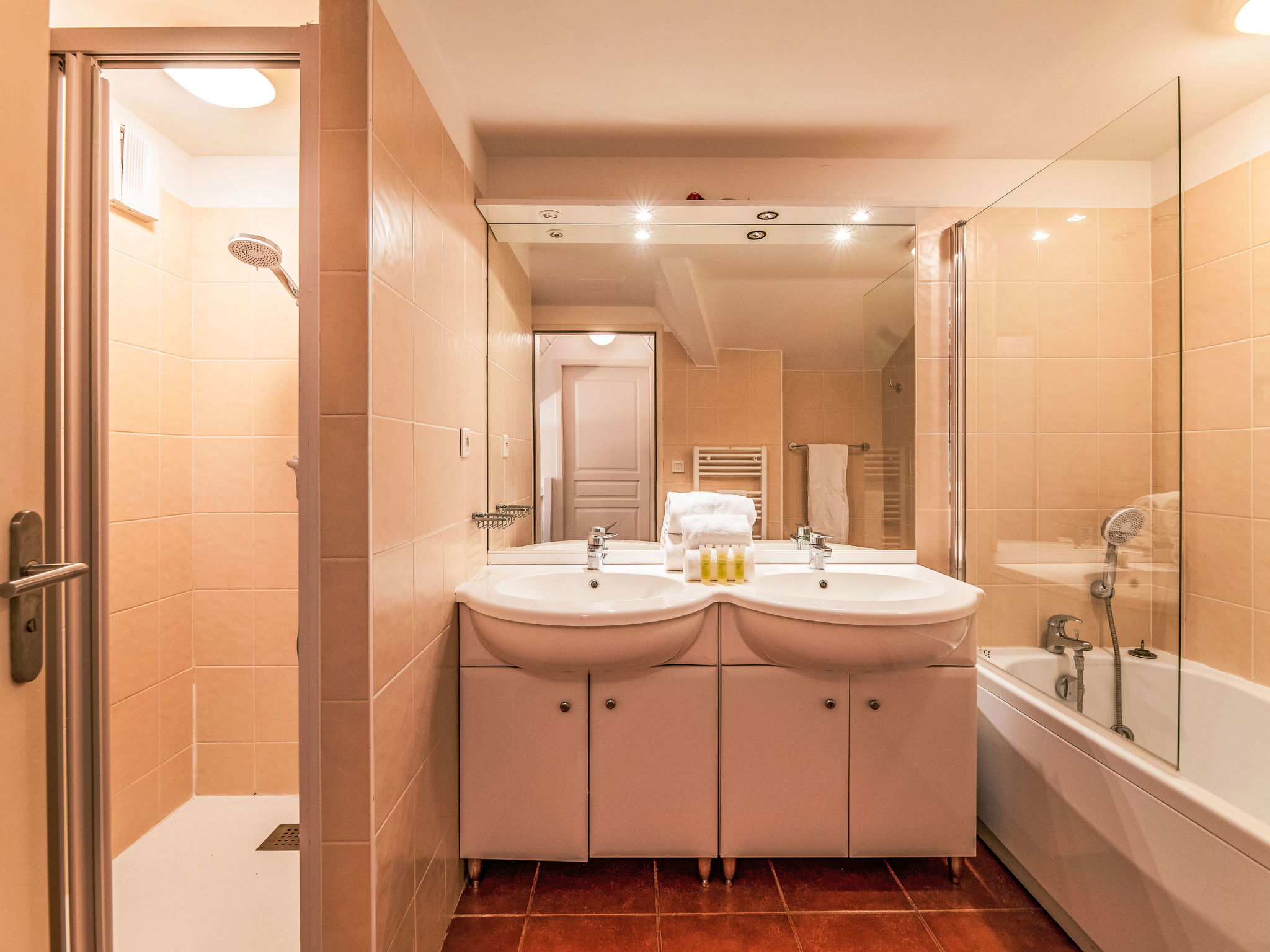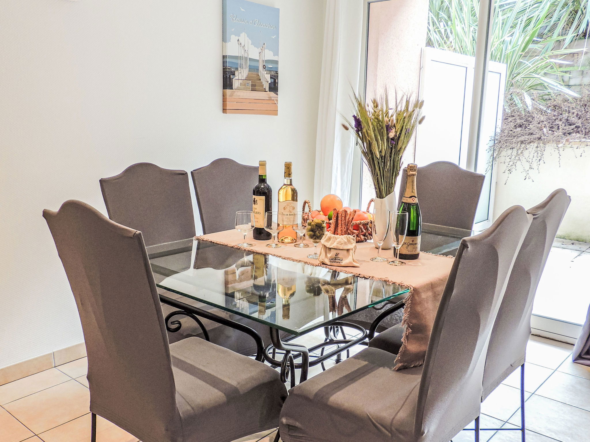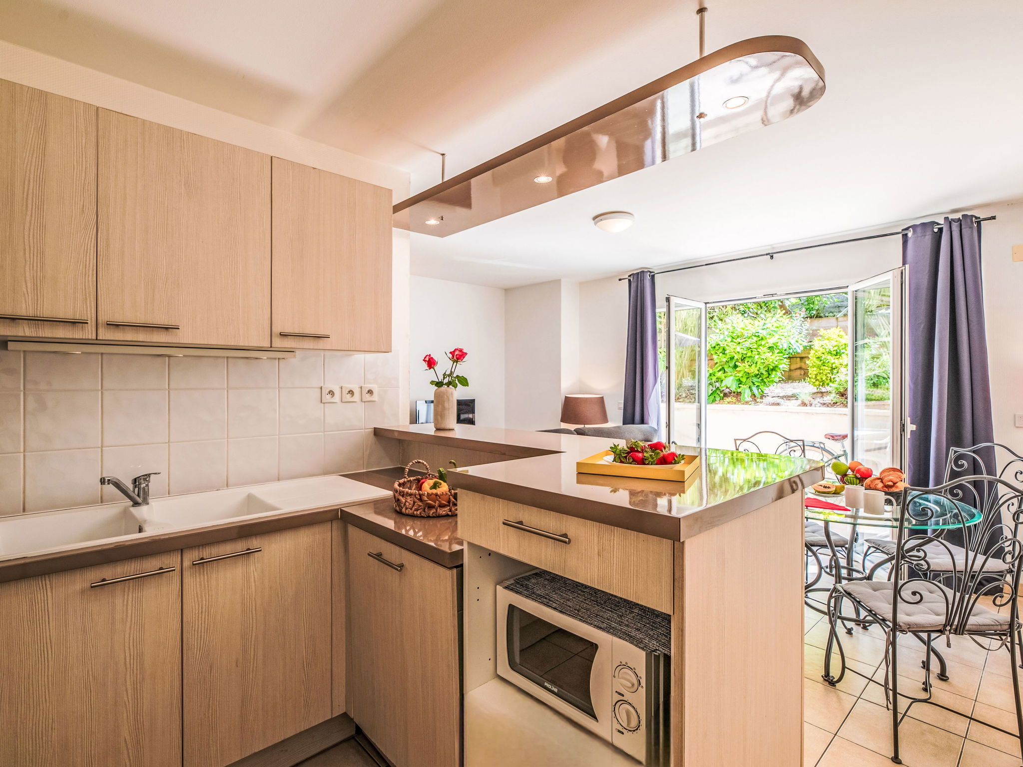 "Le Jardin Mauresque - 346X", 3-room apartment 59 m2. Beautiful and cosy furnishings: living/sleeping room with 1 double sofabed, dining table and TV. 1 room with 1 french bed (160 cm, length 200 cm), bathroom. 1 room with 2 beds. Kitchenette (oven, dishwasher, 4 ceramic glass hob hotplates, toaster, kettle, microwave, freezer, electric coffee machine). Shower, sep. WC. Electric heating. Facilities: washing machine, dryer, children's high chair, baby cot (extra). Internet (WiFi, extra). Parking (extra, roofed). Please note: non-smokers only. Maximum 2 pets/ dogs allowed. Smoke alarm, fire extinguisher.