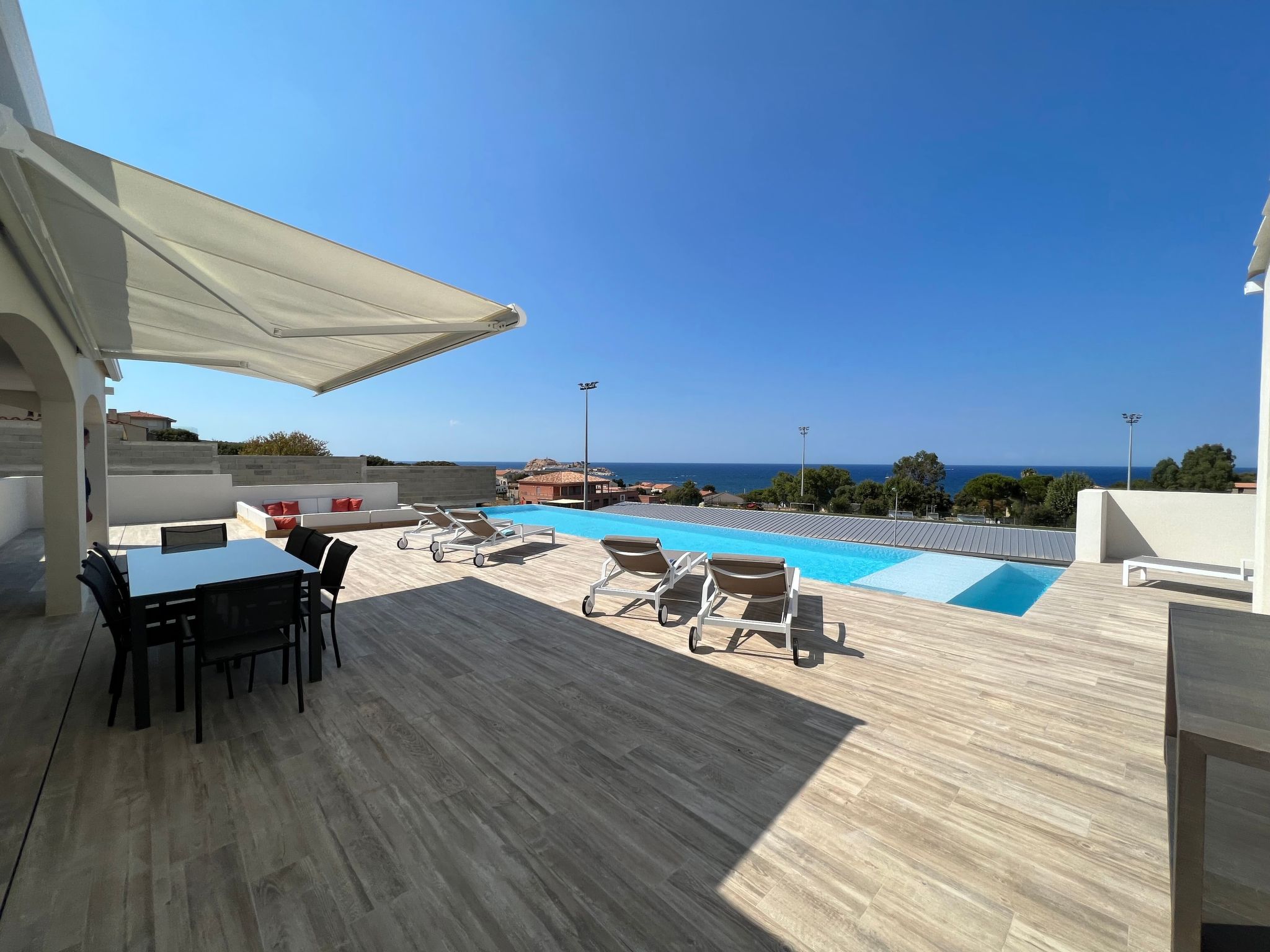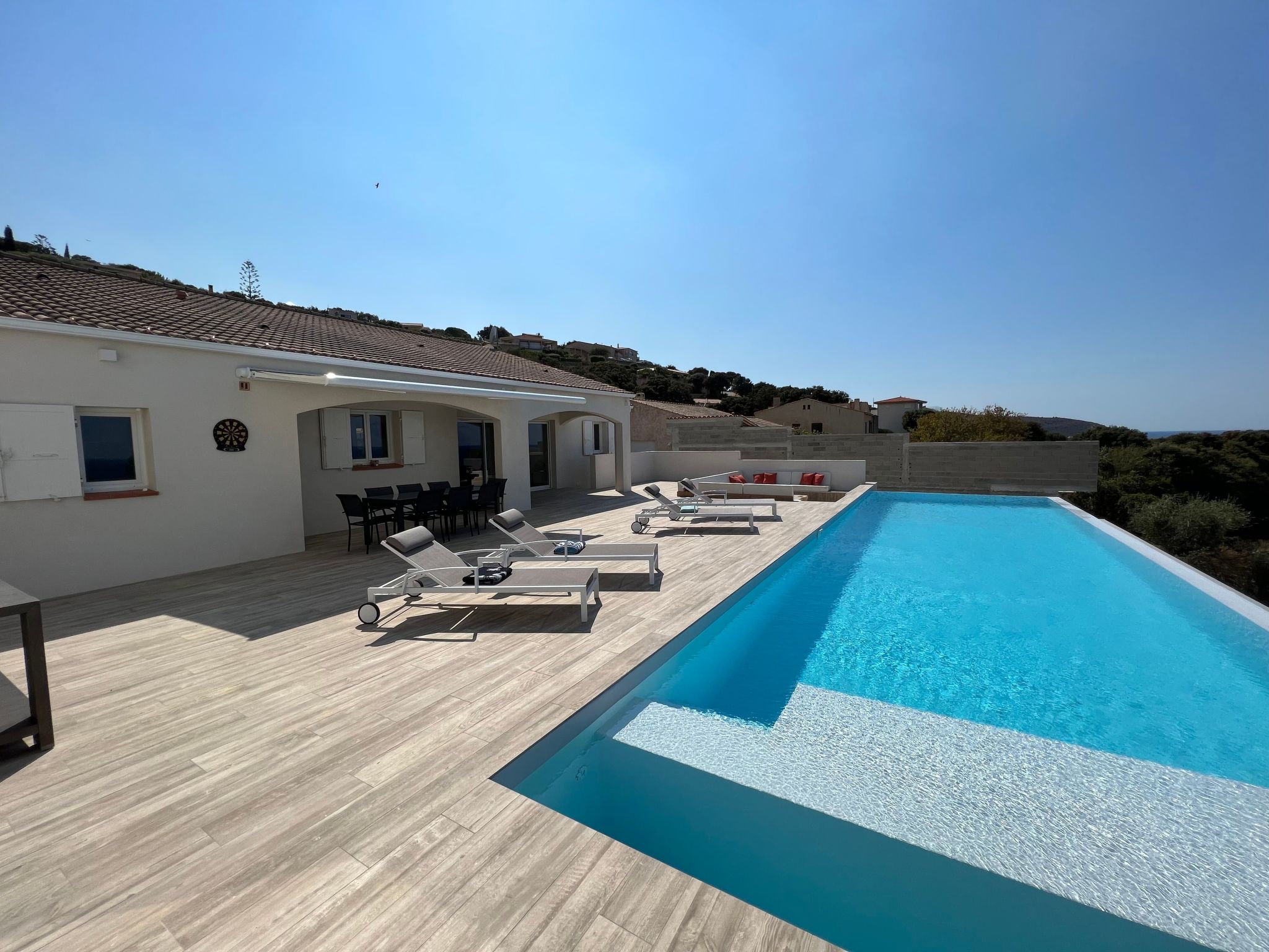 Outside, the large terrace unveils a private heated swimming pool, promising relaxation and refreshment under the Corsican sun. For those who prefer a bit of height, the roof terrace offers a privileged space to relax or admire the panorama. Pets are also welcome, with a fully fenced garden to ensure their safety.