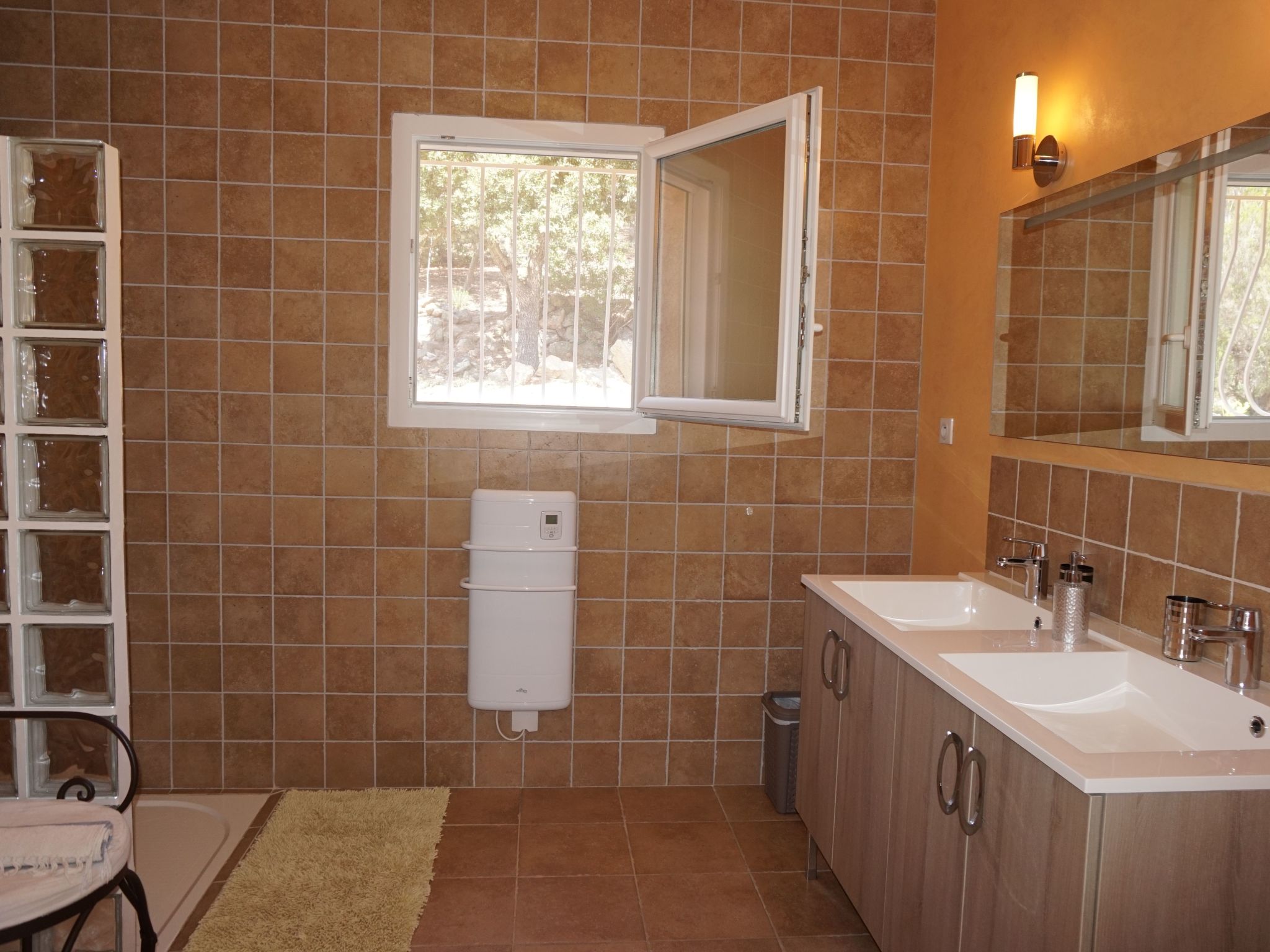 L'intérieur de la villa est conçu pour votre confort avec une cuisine intégrée dotée d’équipements de bon niveau et un séjour s'opens onto a large bay to take full advantage of the sea view. The two master suites, one with a 160x200 double bed and the'autre avec deux lits simples de 90x200, sont équipées de grandes douches de plain pied Des portes isophoniques séparant les suites du séjour garantissent confort et intimité .