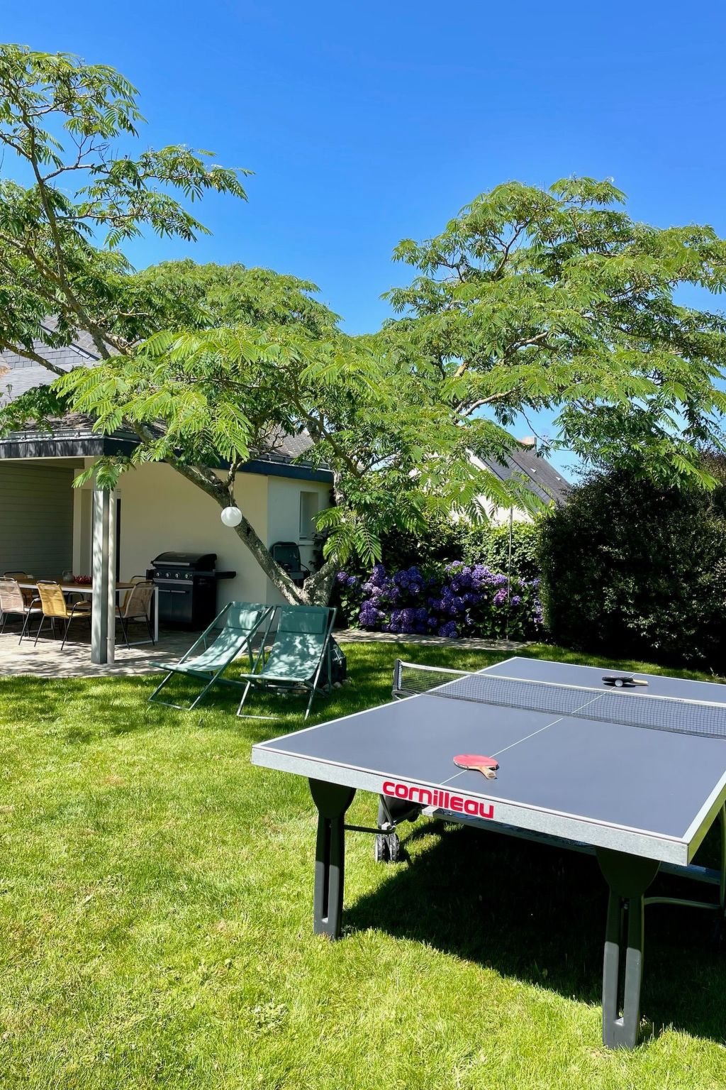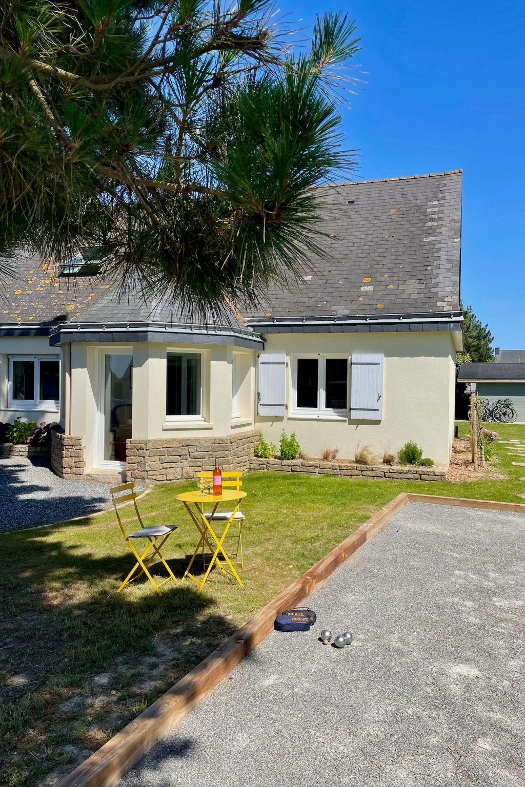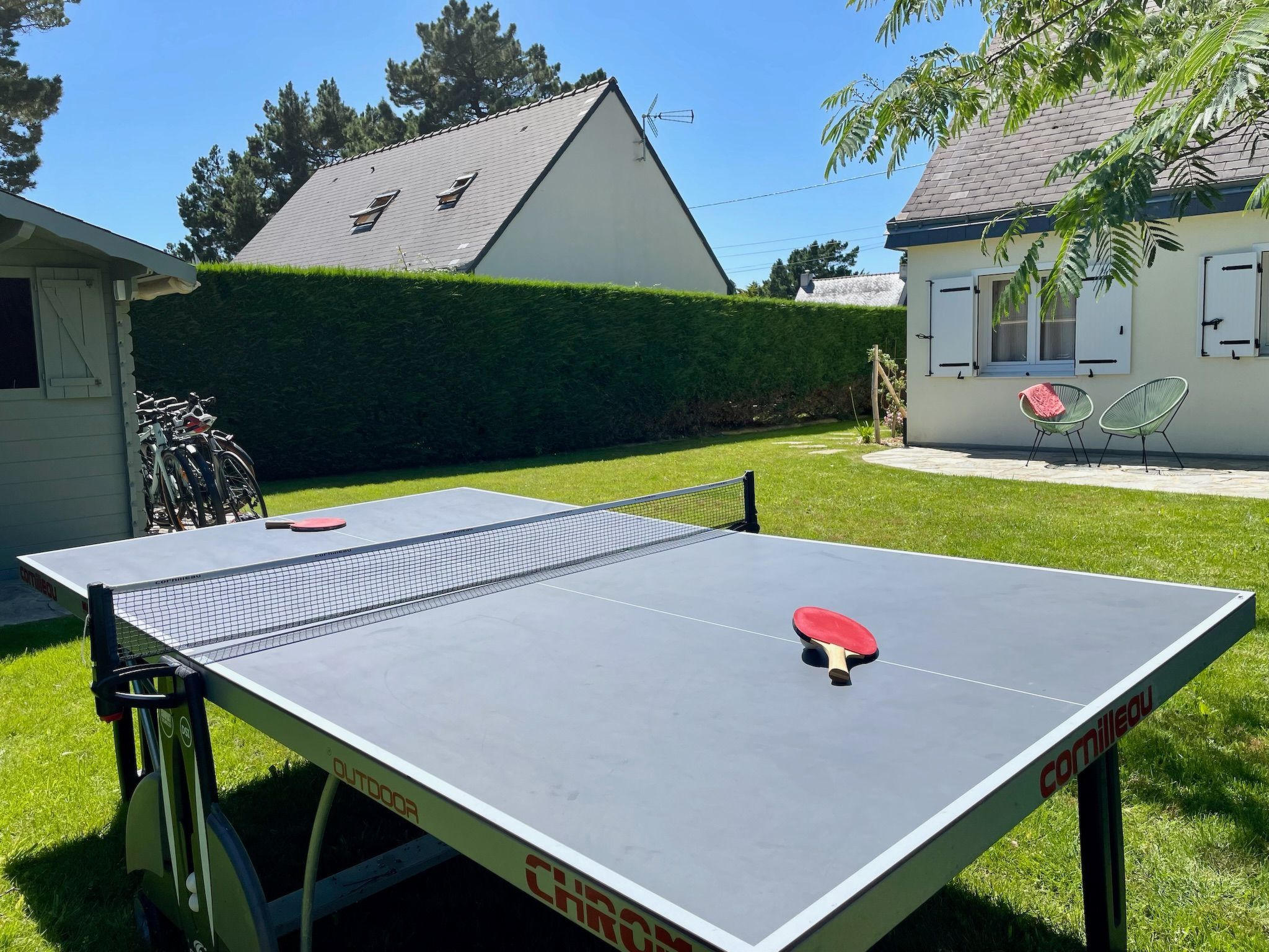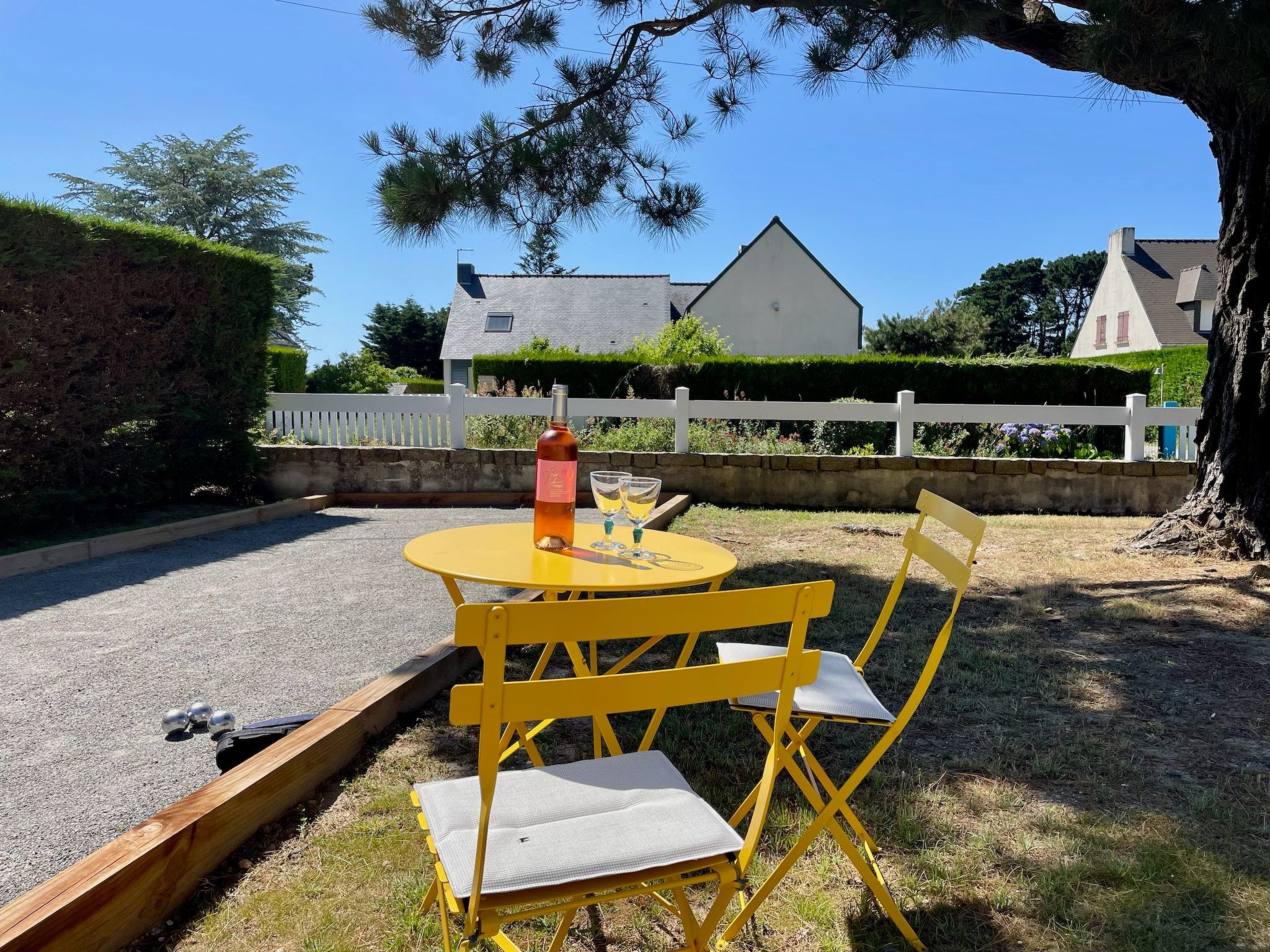 The outdoor area of the 700 square metre property is ideal for relaxation and play. It offers a gravelled courtyard with parking for up to three cars, six large pine trees and a newly constructed boules court. To the rear is a sheltered, covered terrace for al fresco dining and an outdoor kitchen with a large gas BBQ. All the necessary garden furniture and a table tennis table are stored in a garden shed, which also offers space for bicycles or sports equipment.