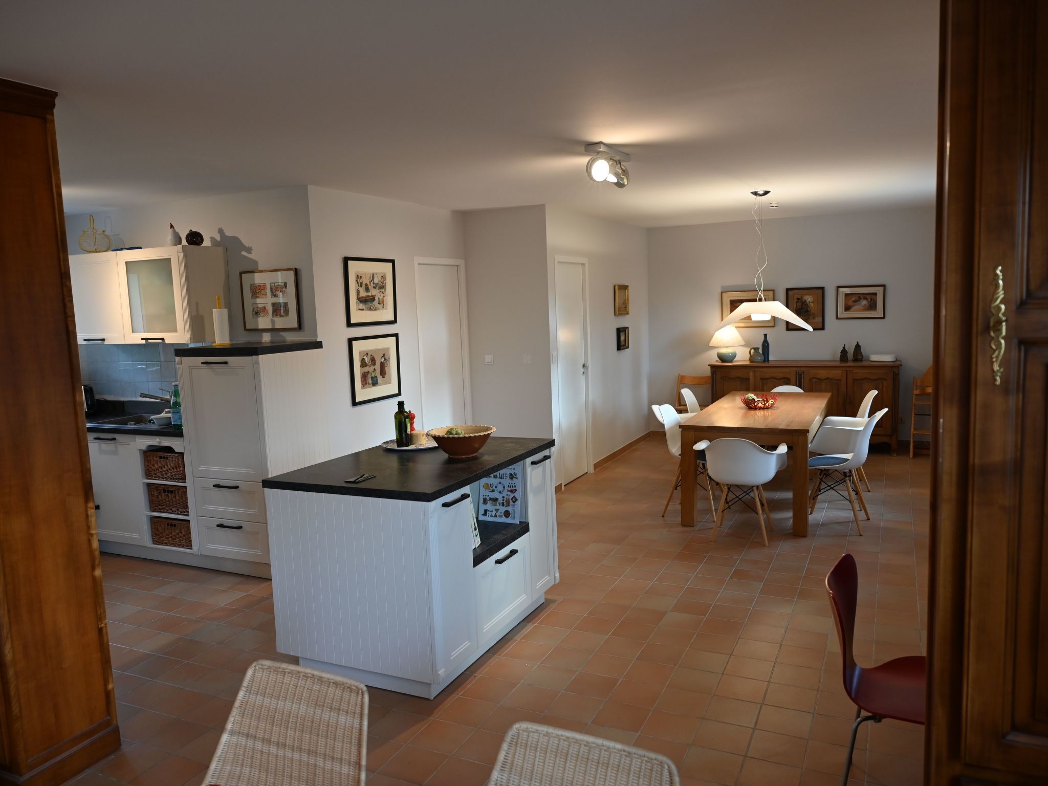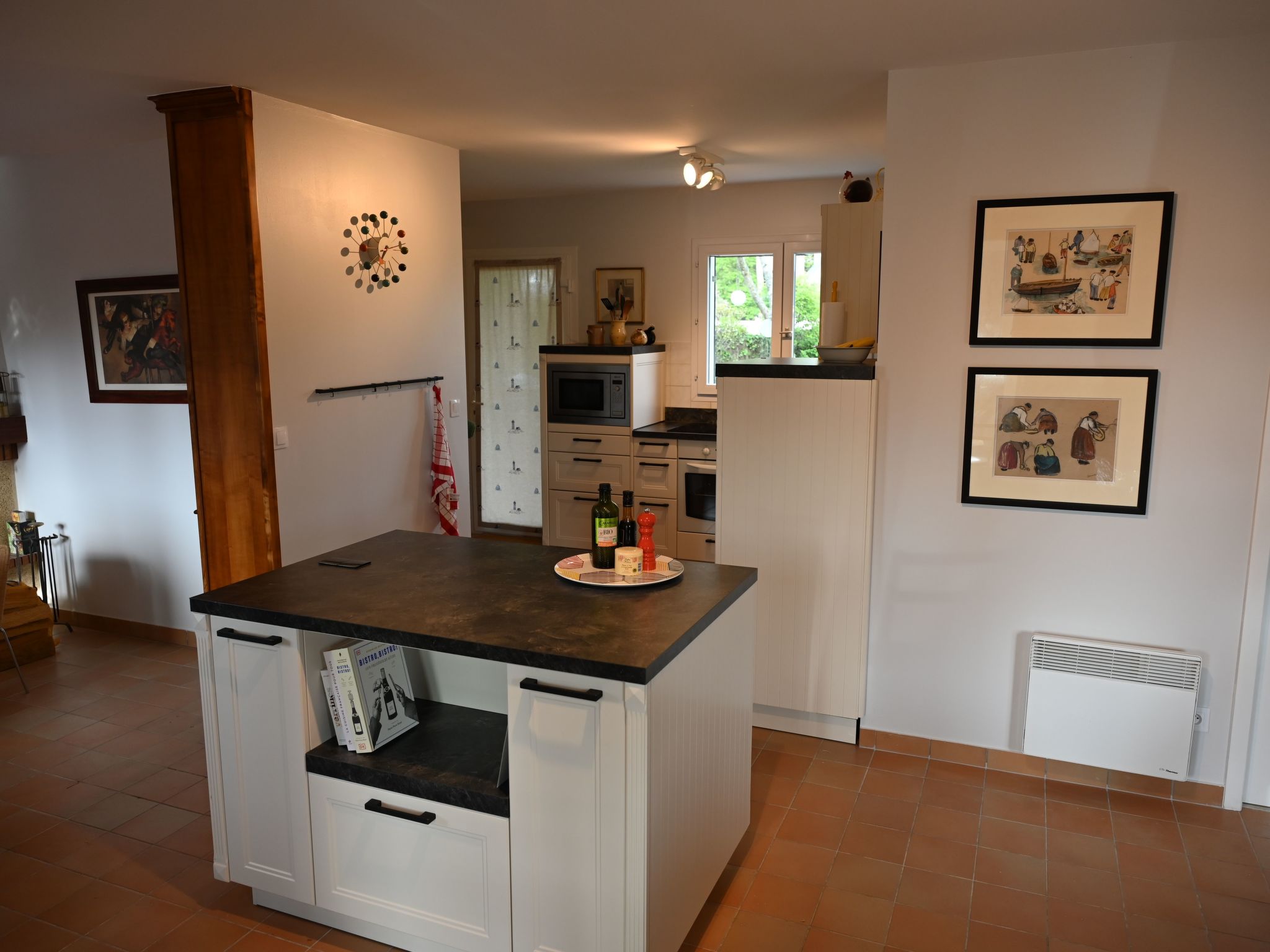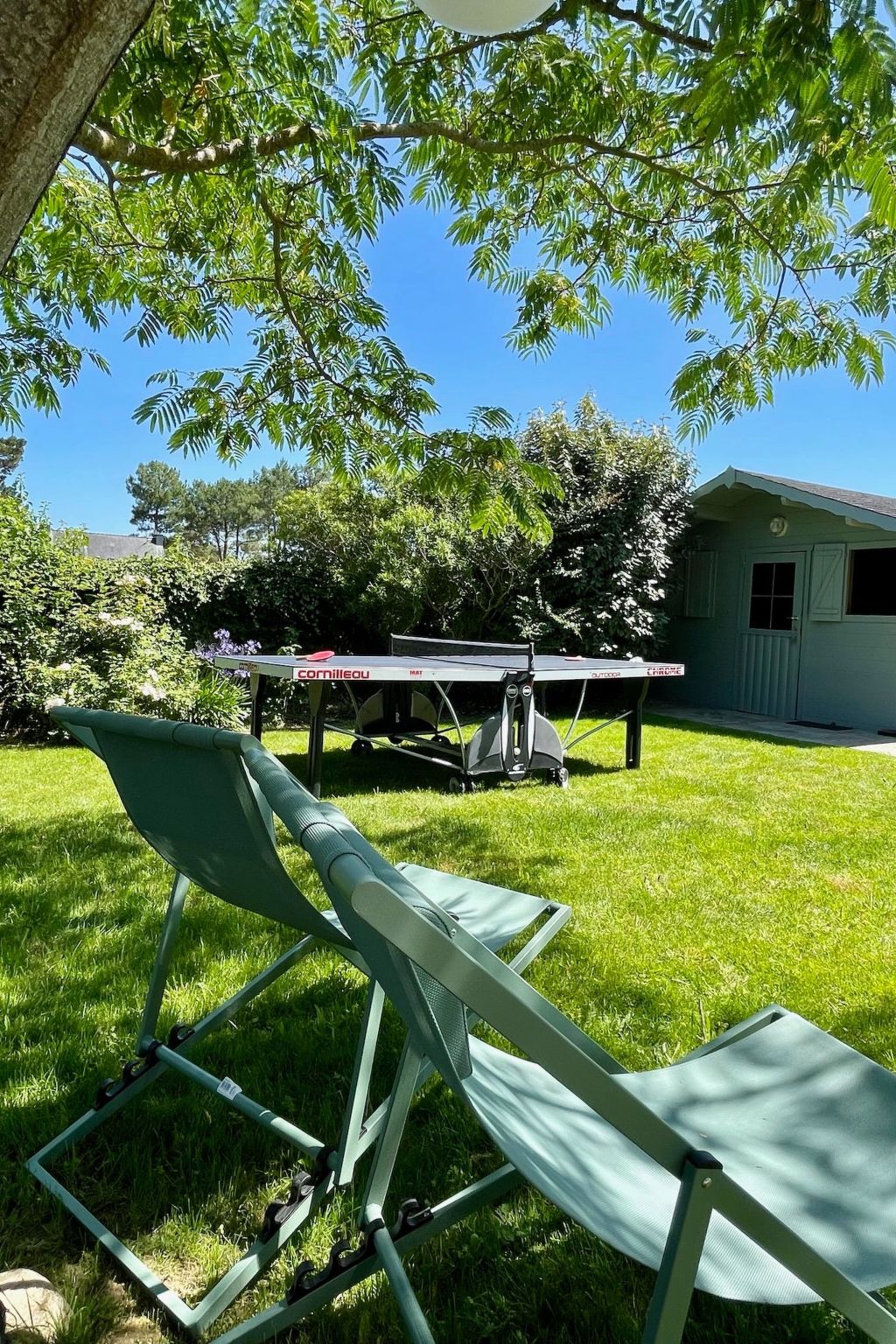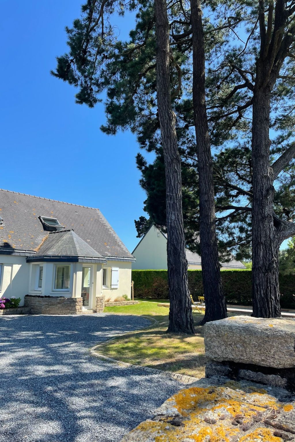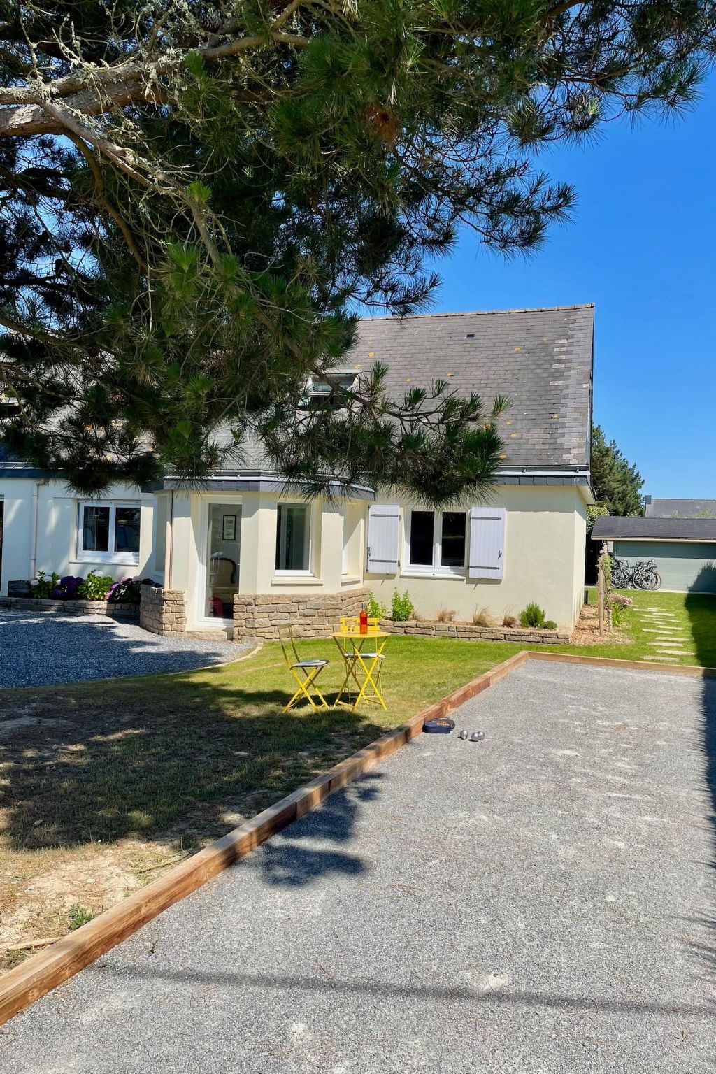 The interior of KerDesAmis has everything you need for a comfortable stay. In the main house, you will find a spacious living and dining area with an open-plan kitchen including a kitchen island and fireplace, a bedroom and a modern bathroom on the ground floor. The upper floor has a master bedroom, an additional bedroom with sea views and a bright bathroom that opens onto the garden. In the separate annexe you will find further living space with a pool table, a third bathroom and a children's room with sea views on the upper floor. Art, the sound of the sea and a maritime atmosphere complete the picture.