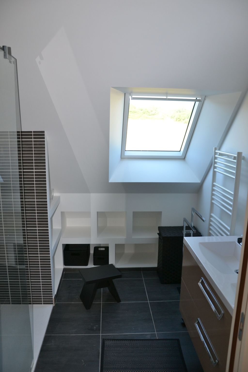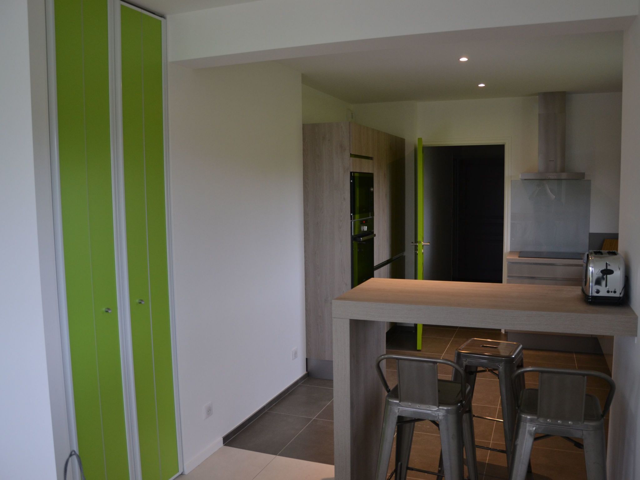 Practical double garage for 2 cars, bicycles, sailing, surfing, kite-surfing, golfing equipment, etc. Hard-surface access to the house (scraped concrete) and pathway suitable for wheelchairs Ground floor accessible to People with Reduced Mobility (PRM) Wide doors on the ground floor to make it easier to move a wheelchair On the ground floor, a private area comprising a separate toilet, a bedroom and a shower room with walk-in shower has been designed to allow wheelchair access.